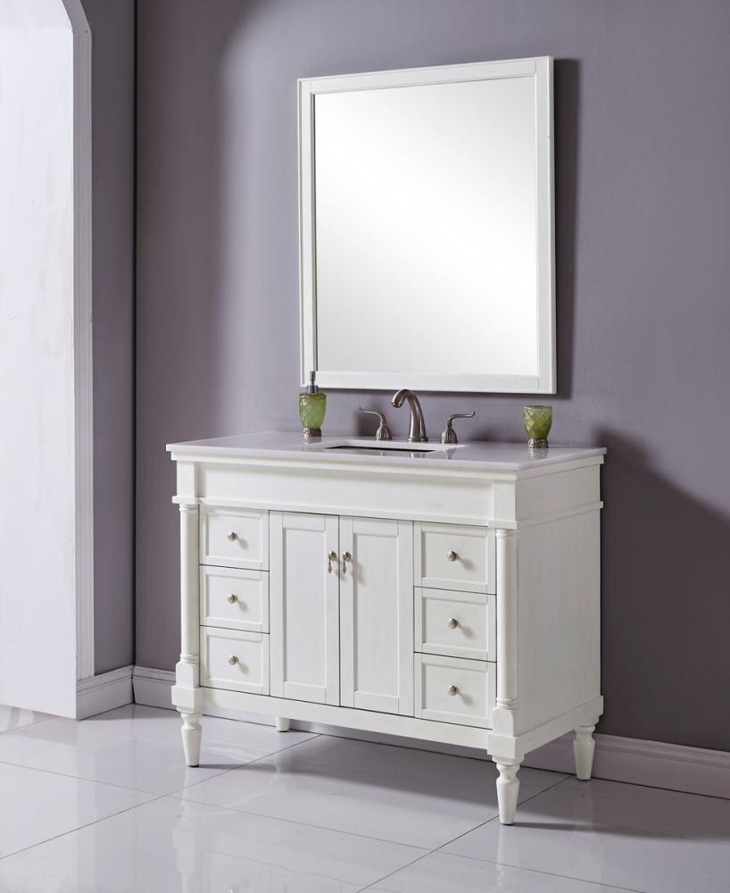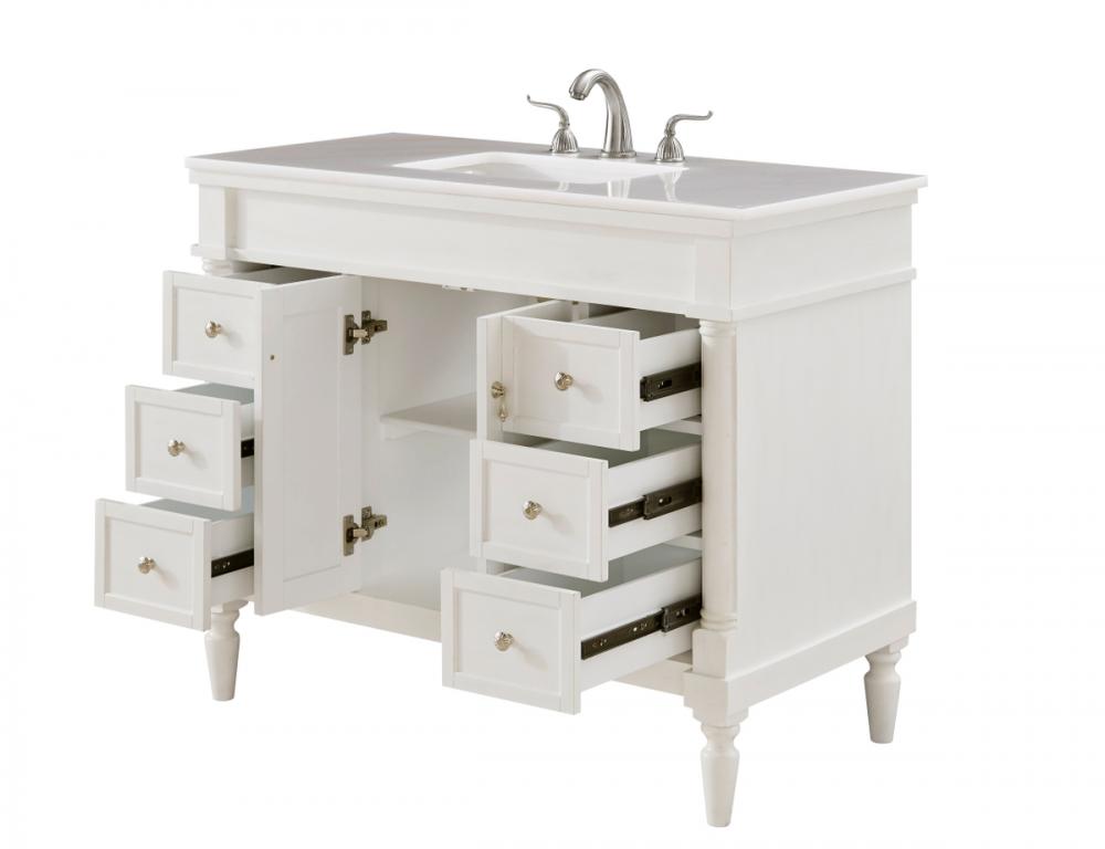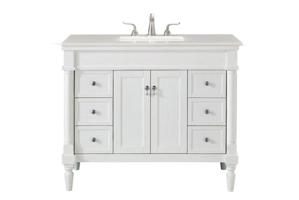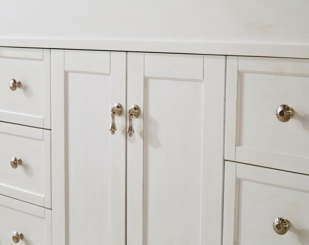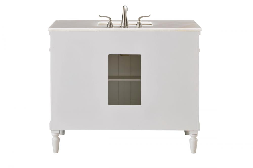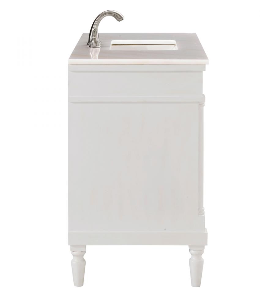 This traditionally styled, yet fashionably designed vanity can add distinction and grace to your home or office bathroom. Beautifully combining a lustrous natural white marble countertop with a large rectangular white porcelain under mount sink, and a hand painted antique white 2-door cabinet with a shelf inside, 3 full extension drawers on each side, brushed steel door pulls, standing on turned, tapering legs. You’ll enjoy its charming allure for many years to come. Measurements: W42” x D21” x H35”