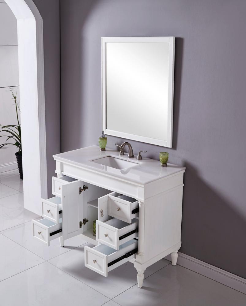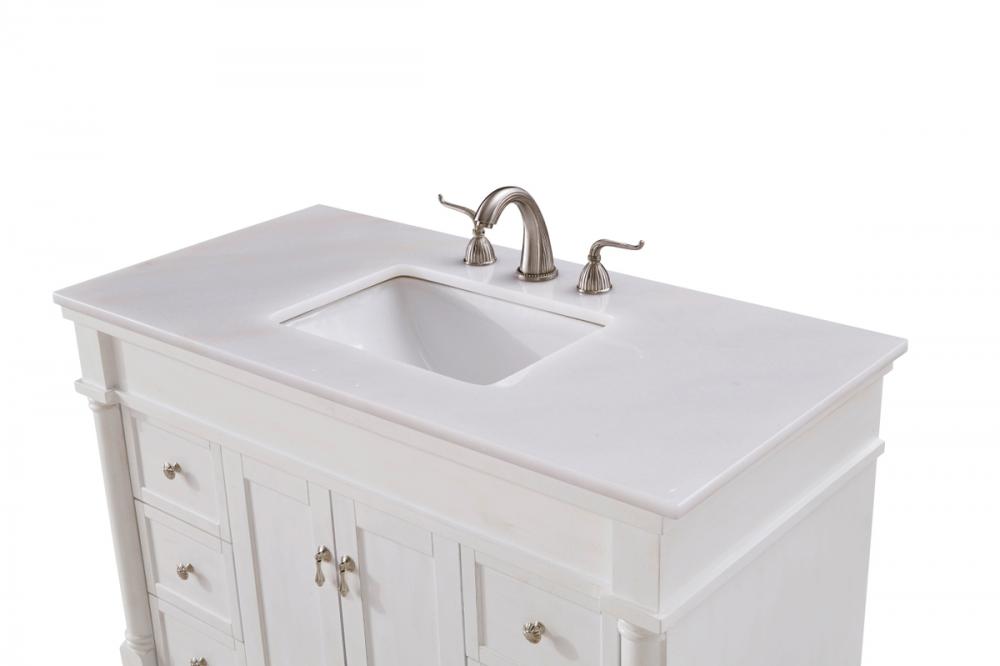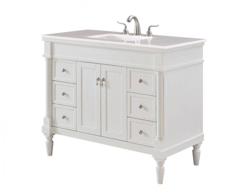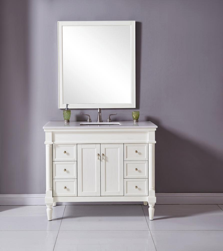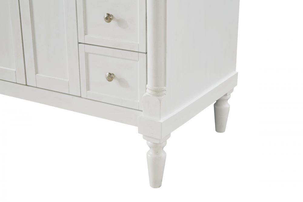 This traditionally styled, yet fashionably designed vanity can add distinction and grace to your home or office bathroom. Beautifully combining a lustrous natural white marble countertop with a large rectangular white porcelain under mount sink, and a hand painted antique white 2-door cabinet with a shelf inside, 3 full extension drawers on each side, brushed steel door pulls, standing on turned, tapering legs. You’ll enjoy its charming allure for many years to come. Measurements: W42” x D21” x H35”