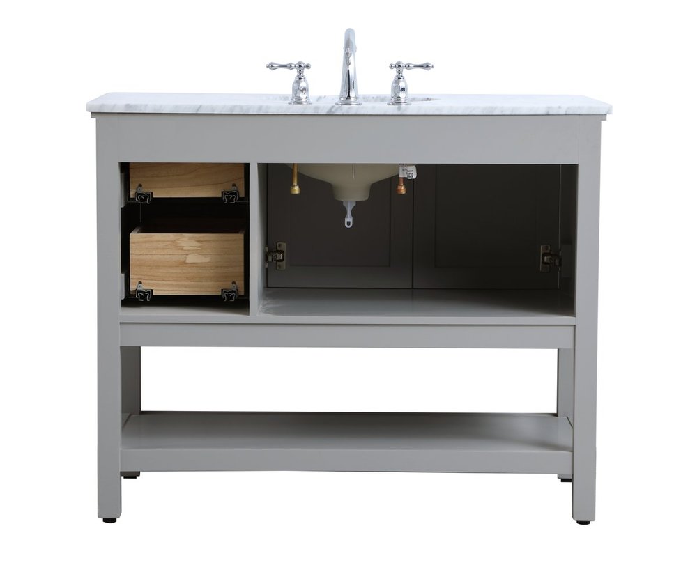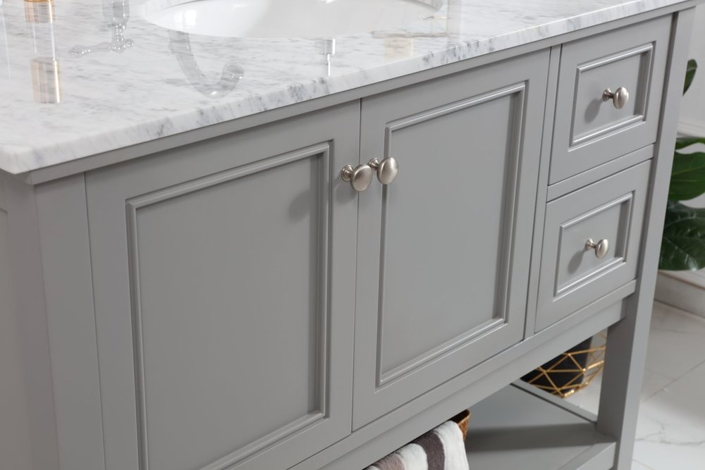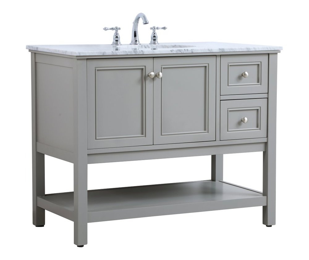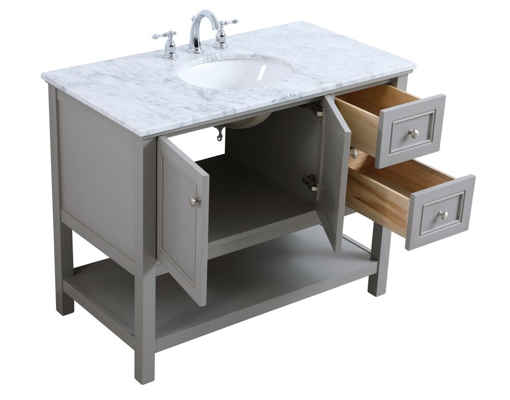 Create a refined and relaxing bath space with this contemporary design vanity, presenting its simplicity and clean straight lines in a minimalist appeal. The 42" vanity, crafted of solid poplar wood in a soft-grey finish, provides ample storage within its 2 soft-close drawers and dodble door, all equipted with soft-closing mechanism and accentuated with gleaming chrome hardware. Rounding out the design is a luxurious Itallian Carrara white marble counter top and a white porcelain under-mount oval sink.