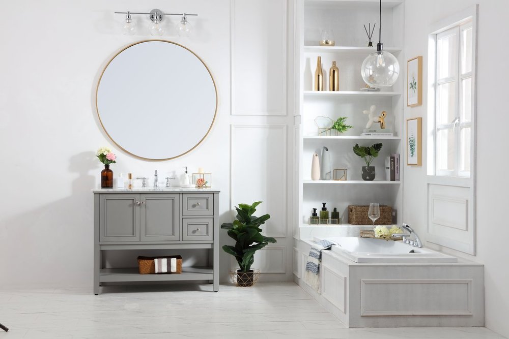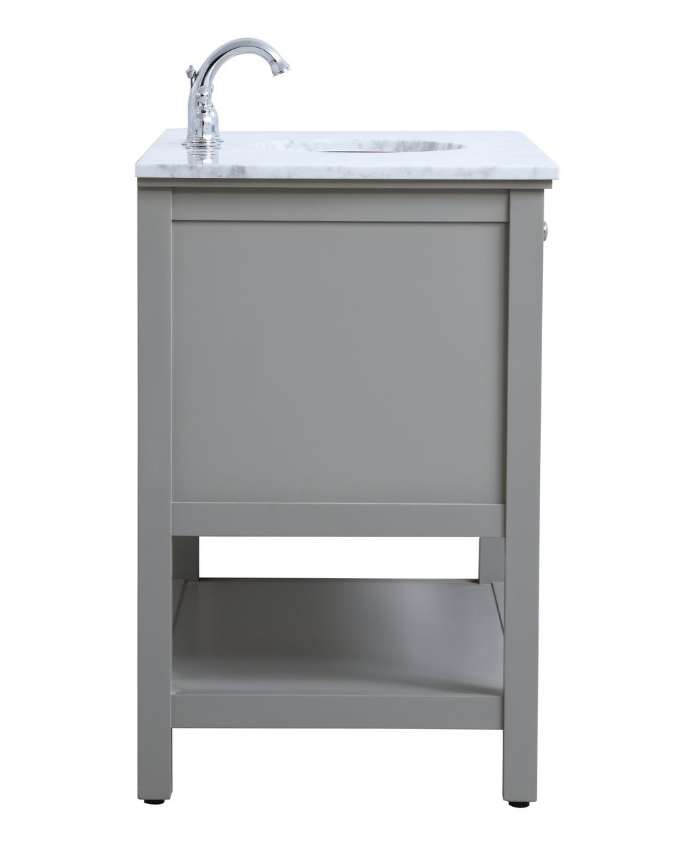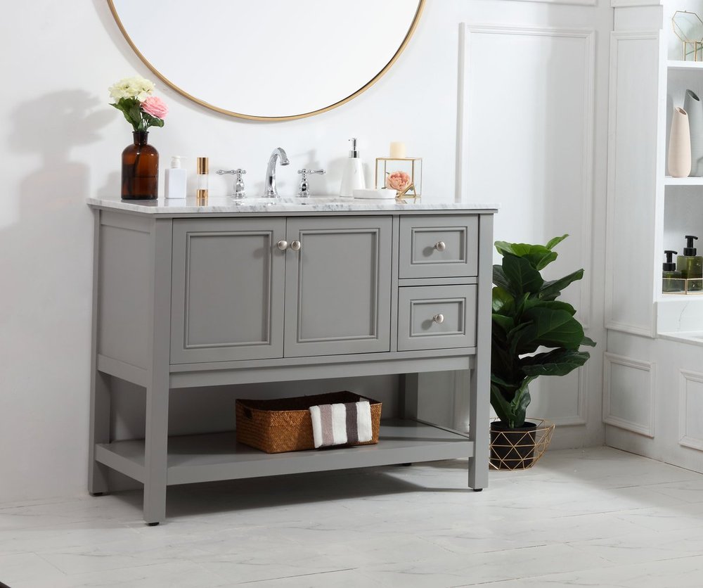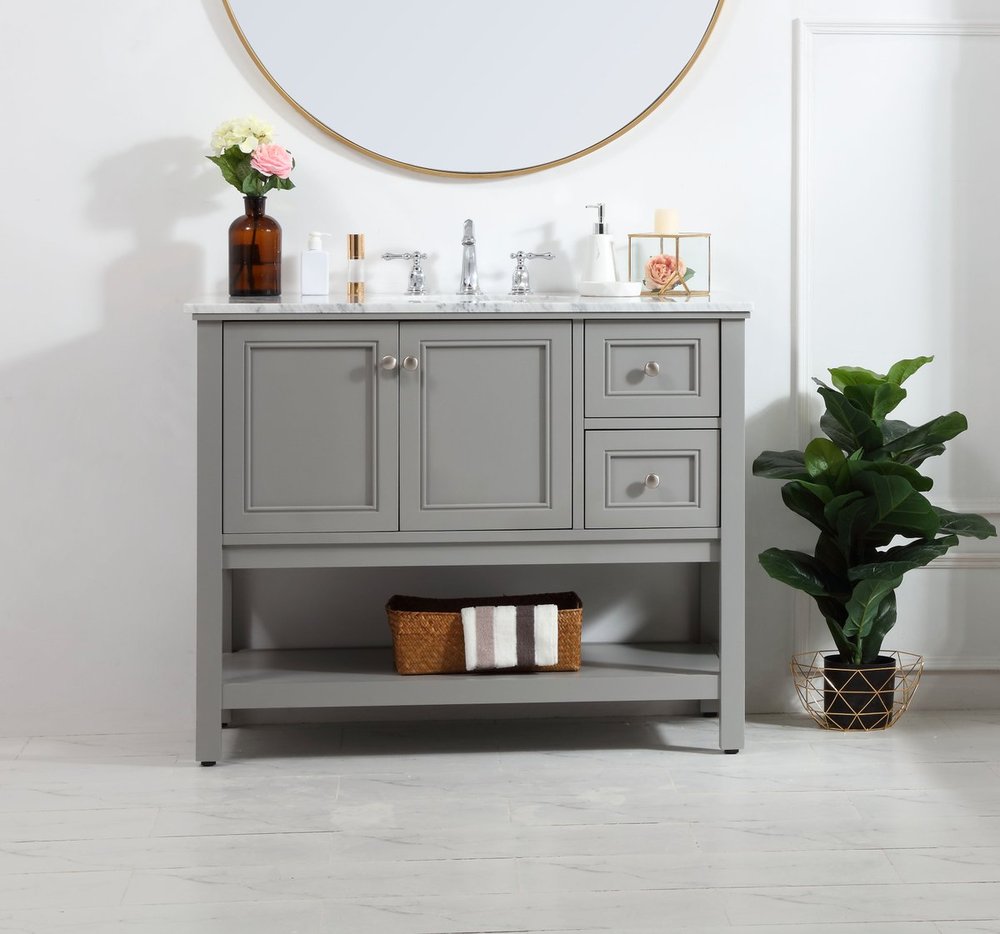 Create a refined and relaxing bath space with this contemporary design vanity, presenting its simplicity and clean straight lines in a minimalist appeal. The 42" vanity, crafted of solid poplar wood in a soft-grey finish, provides ample storage within its 2 soft-close drawers and dodble door, all equipted with soft-closing mechanism and accentuated with gleaming chrome hardware. Rounding out the design is a luxurious Itallian Carrara white marble counter top and a white porcelain under-mount oval sink.