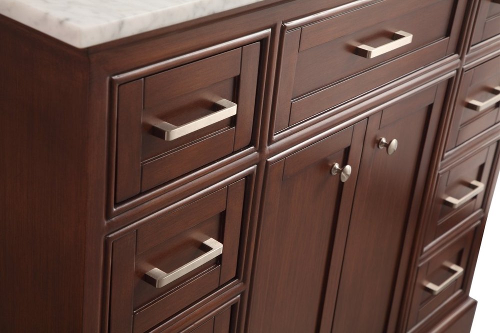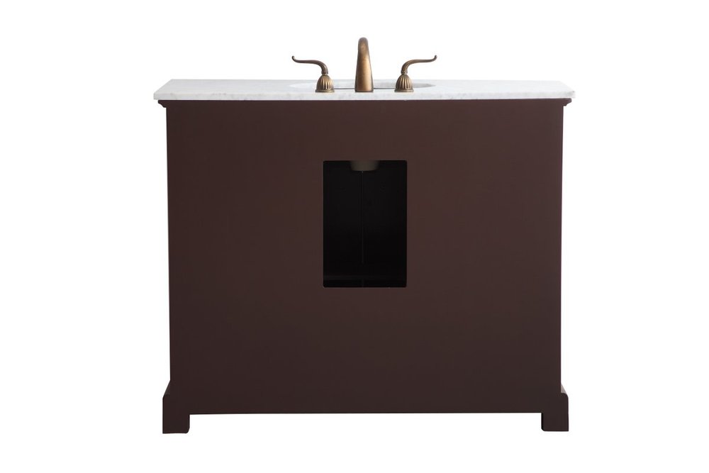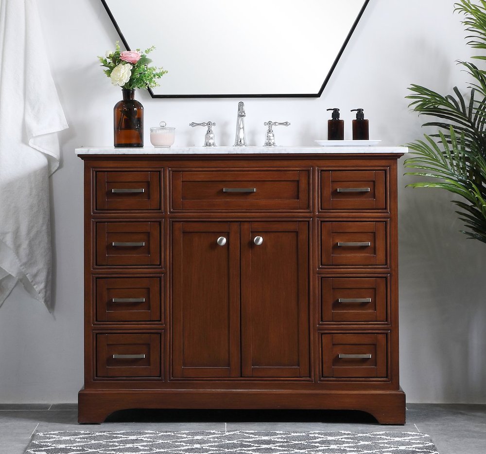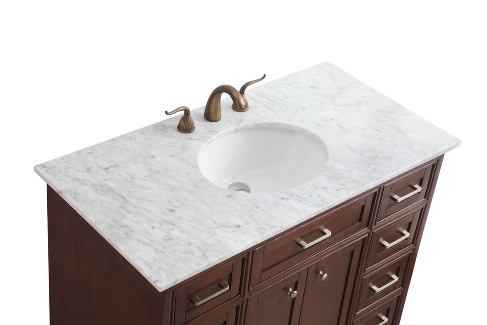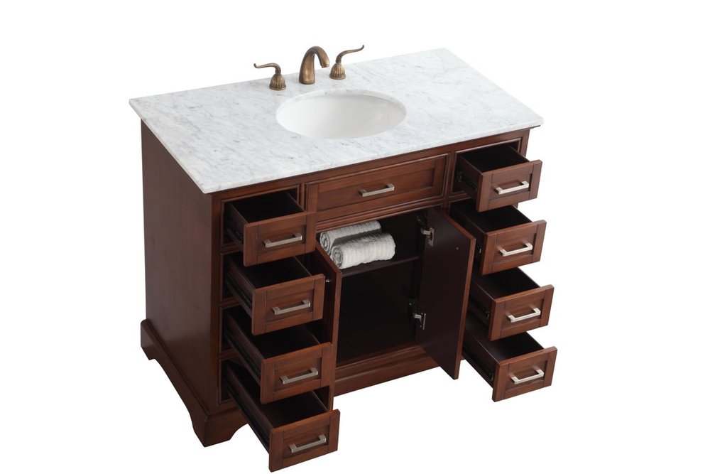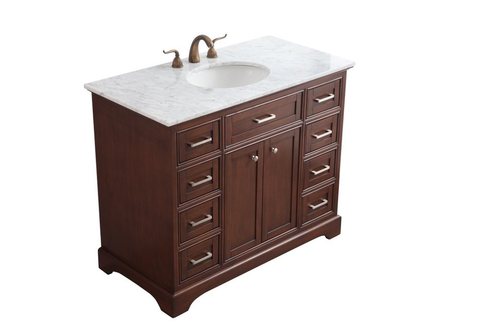 From its Italian Carrara white marble top to its contemporary-styled hand painted teak wood cabinet, it is sure to enhance either your home or office bathroom. Beneath its lustrous, natural marble top and an oval, white porcelain under mount sink, is a cabinet with 3 handsome drawers on each side and 2 center doors with a Single shelf for all your bathroom essentials, highlighted with recessed panel doors, brushed steel bar handle and knobs, stands on strong solid pedestal feet. A wonderful balance of simplicity and practical function! Measurements: W42”xD21.5”xH35”