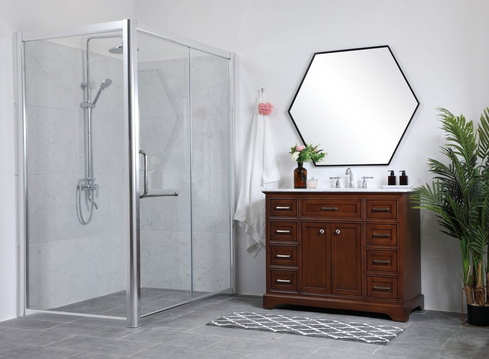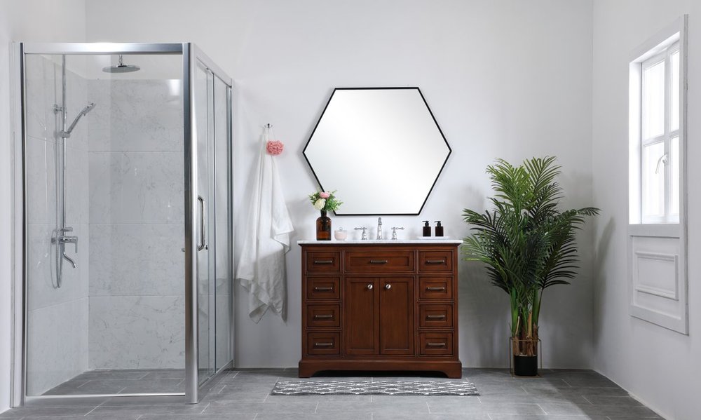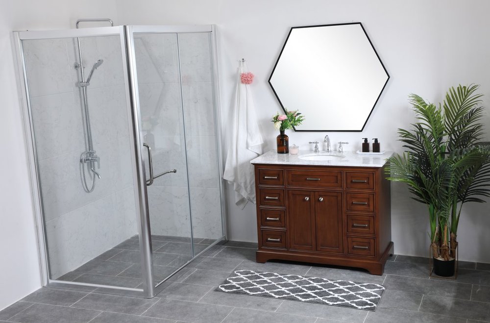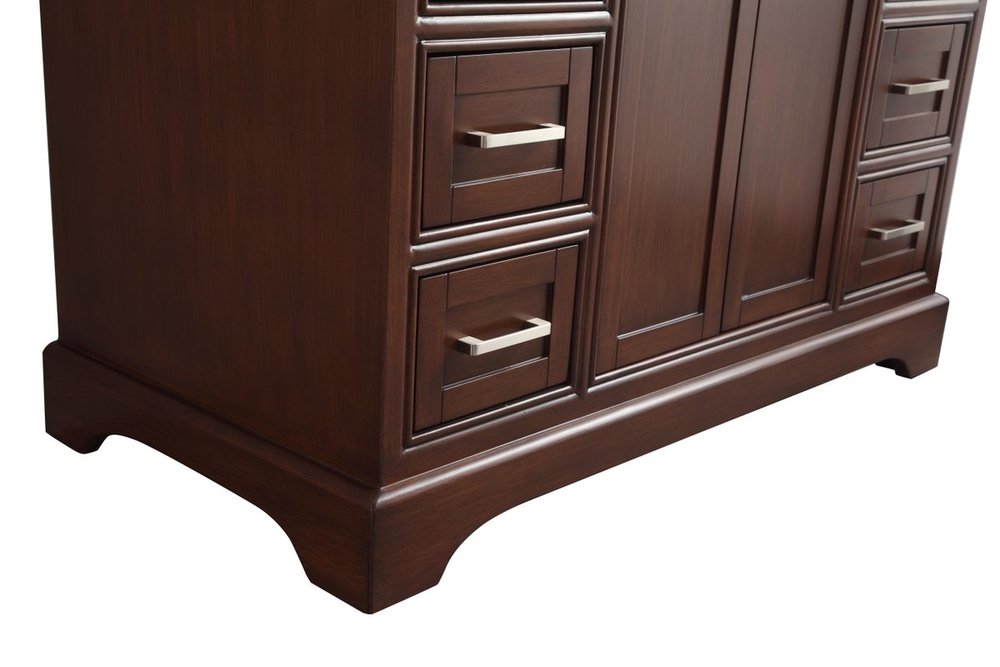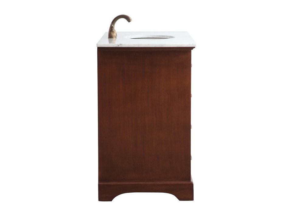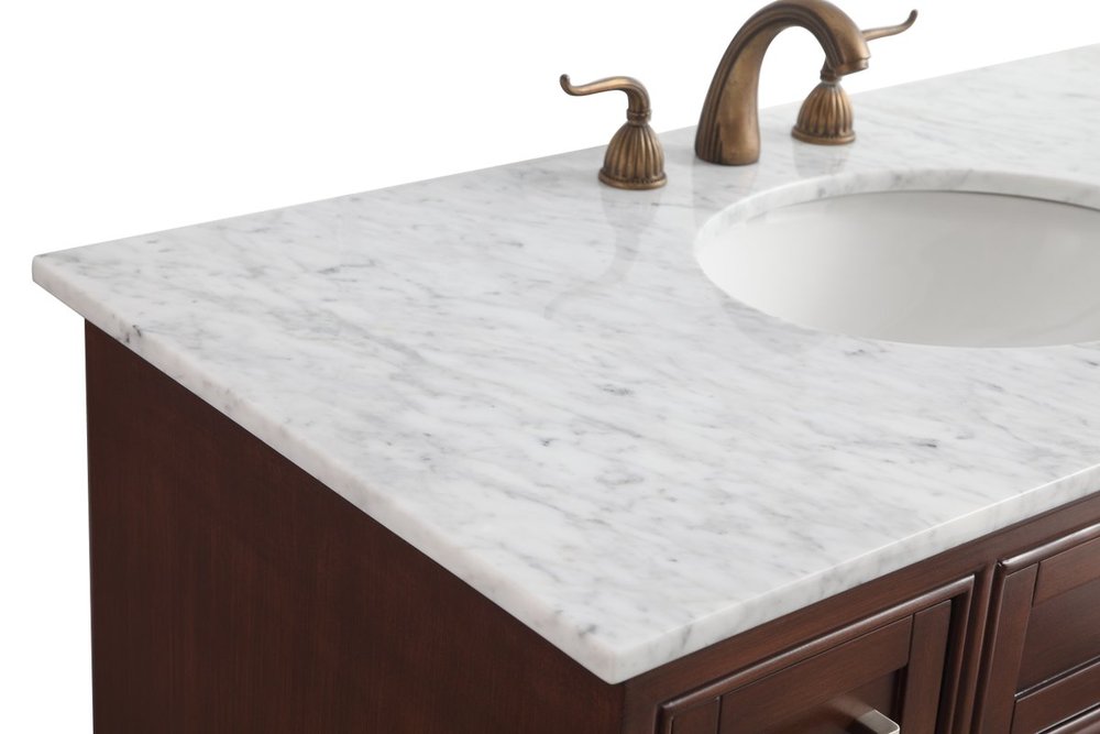From its Italian Carrara white marble top to its contemporary-styled hand painted teak wood cabinet, it is sure to enhance either your home or office bathroom. Beneath its lustrous, natural marble top and an oval, white porcelain under mount sink, is a cabinet with 3 handsome drawers on each side and 2 center doors with a Single shelf for all your bathroom essentials, highlighted with recessed panel doors, brushed steel bar handle and knobs, stands on strong solid pedestal feet. A wonderful balance of simplicity and practical function! Measurements: W42”xD21.5”xH35”