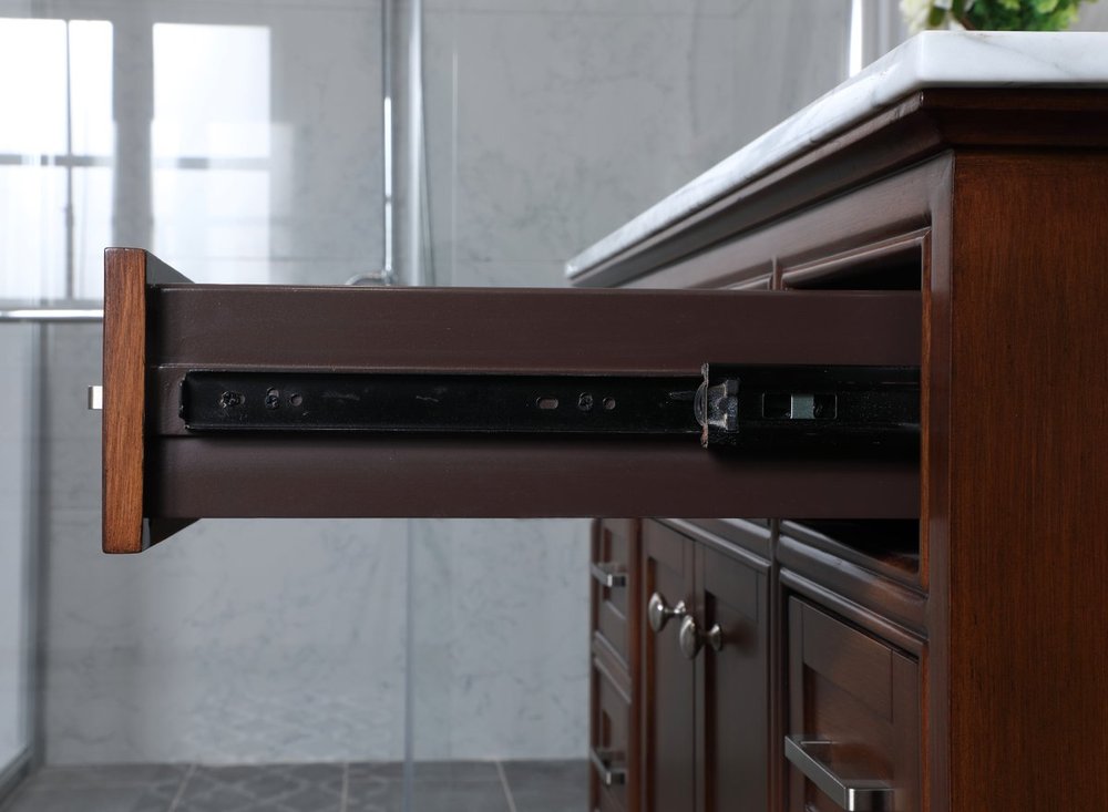 Two doors opens to a storage comparment and 8 drawers opens easily with metal glides