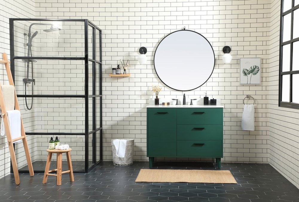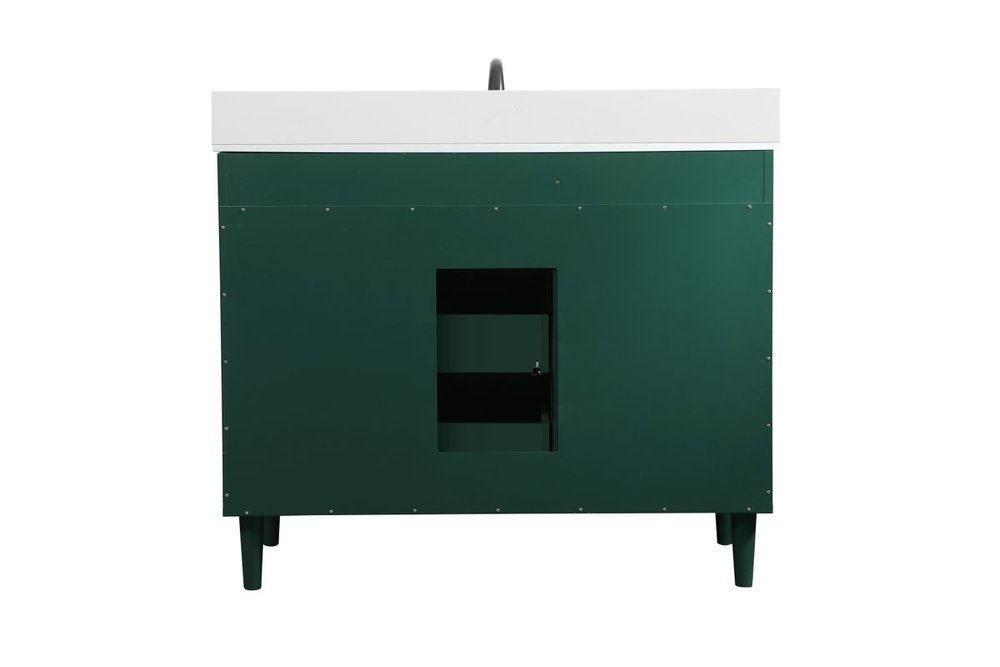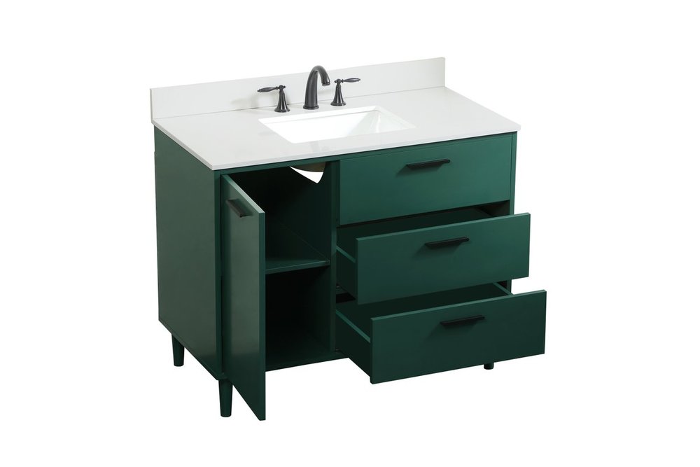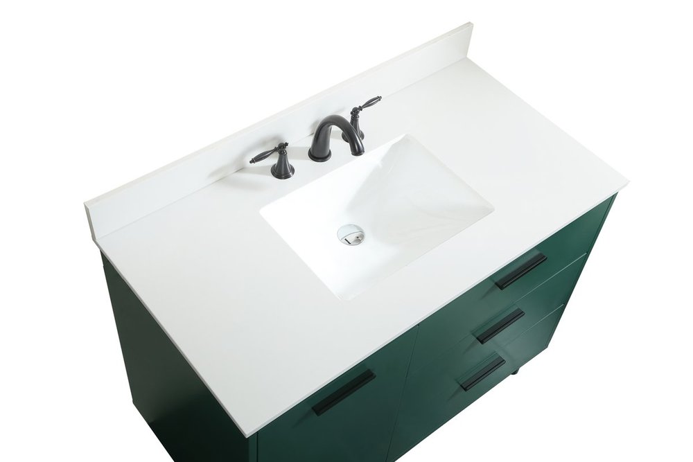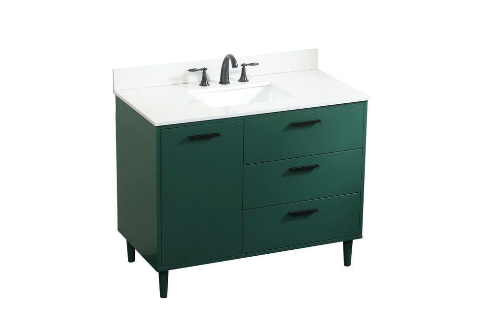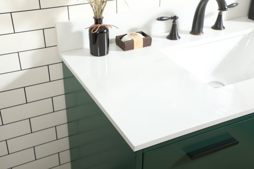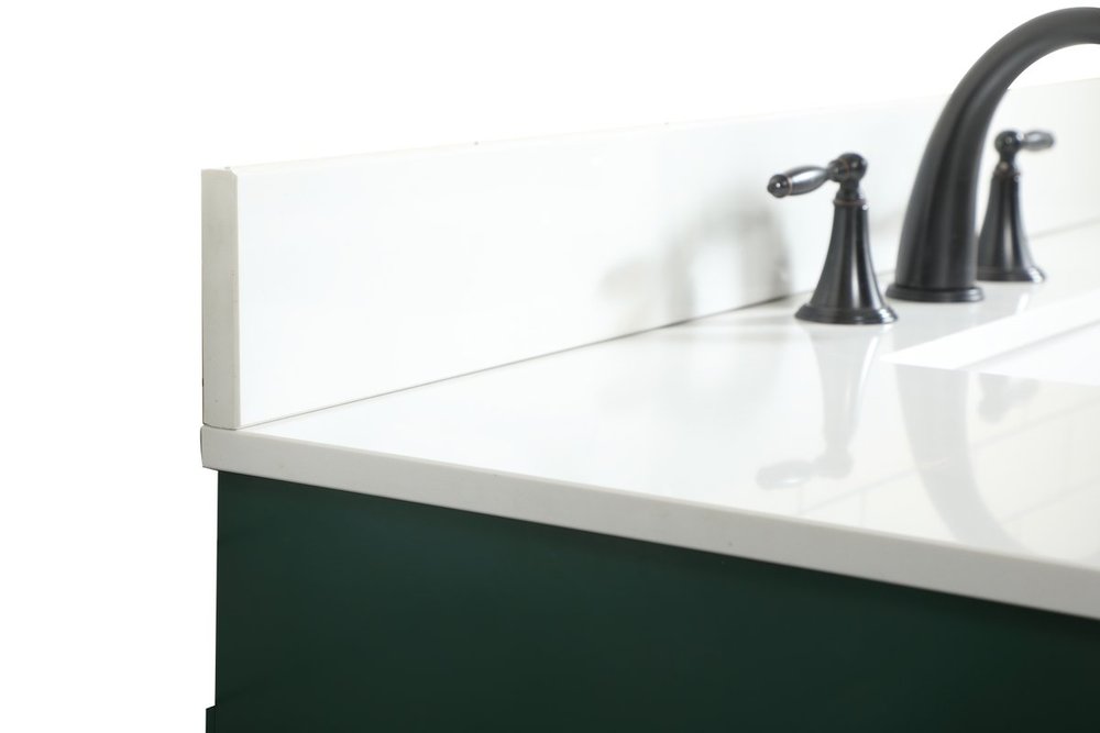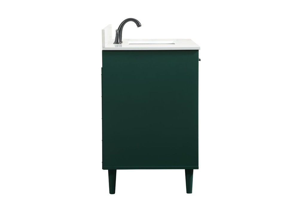 Modern sophistication is defined with the green finish and black barpulls of this vanity and slender tapered legs. Its length makes it the perfect addition to any sized home, and saves space with its storage area hidden behind the Single cabinet door and two bottom drawers. Topped with a highly durable engineered stone countertop and a porcelain undermount sink, this modern design will become your focal point of your bathroom. Comes with a matching backsplash to complete the look and protects your wall. Equipped with soft-closing drawer and doors adds a quiet functional touch.