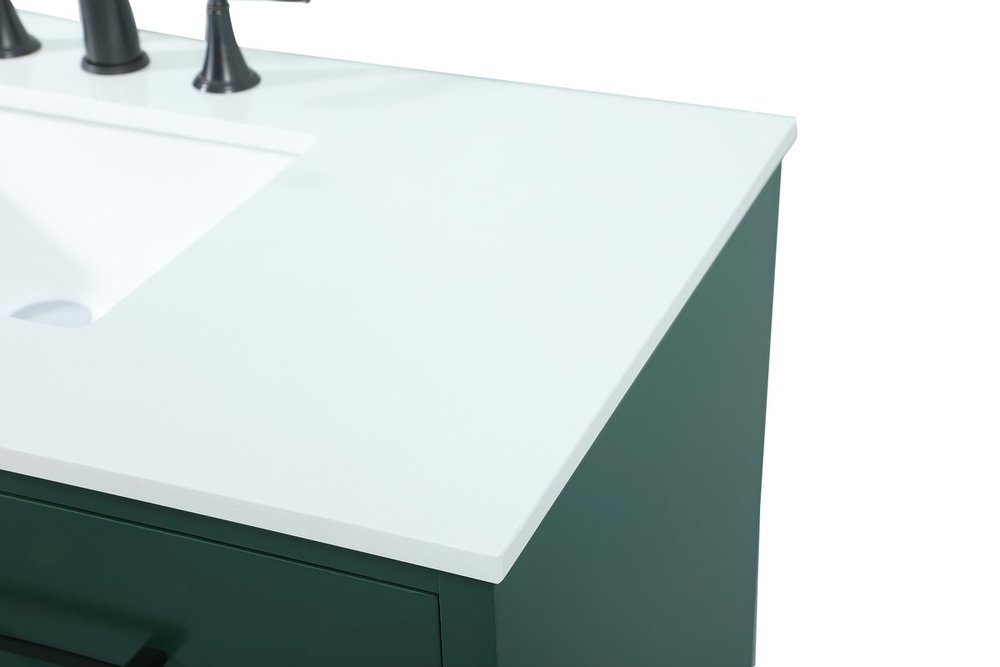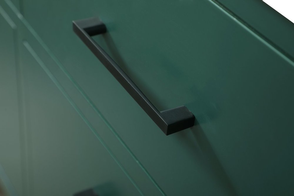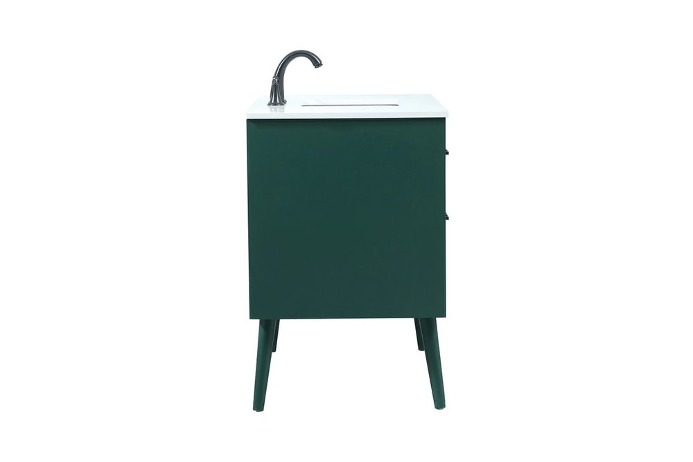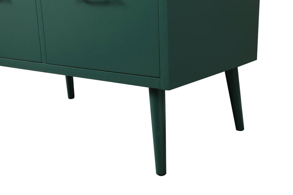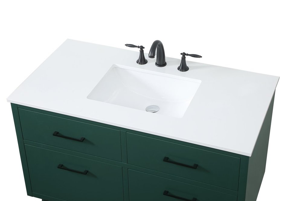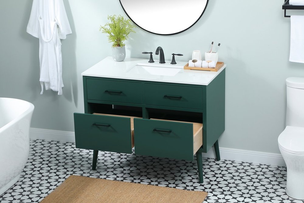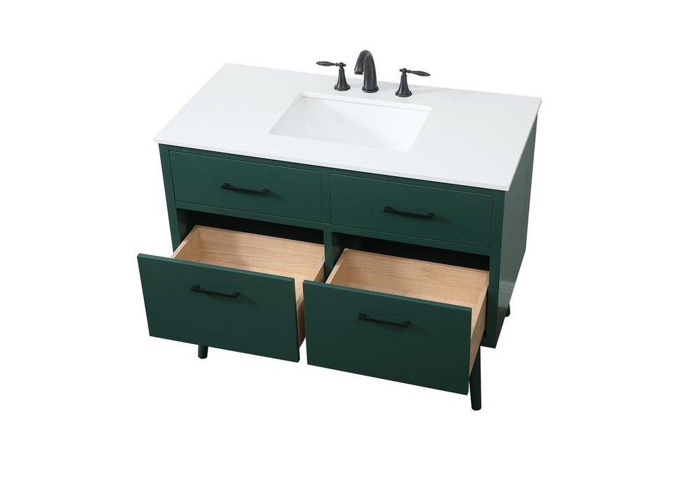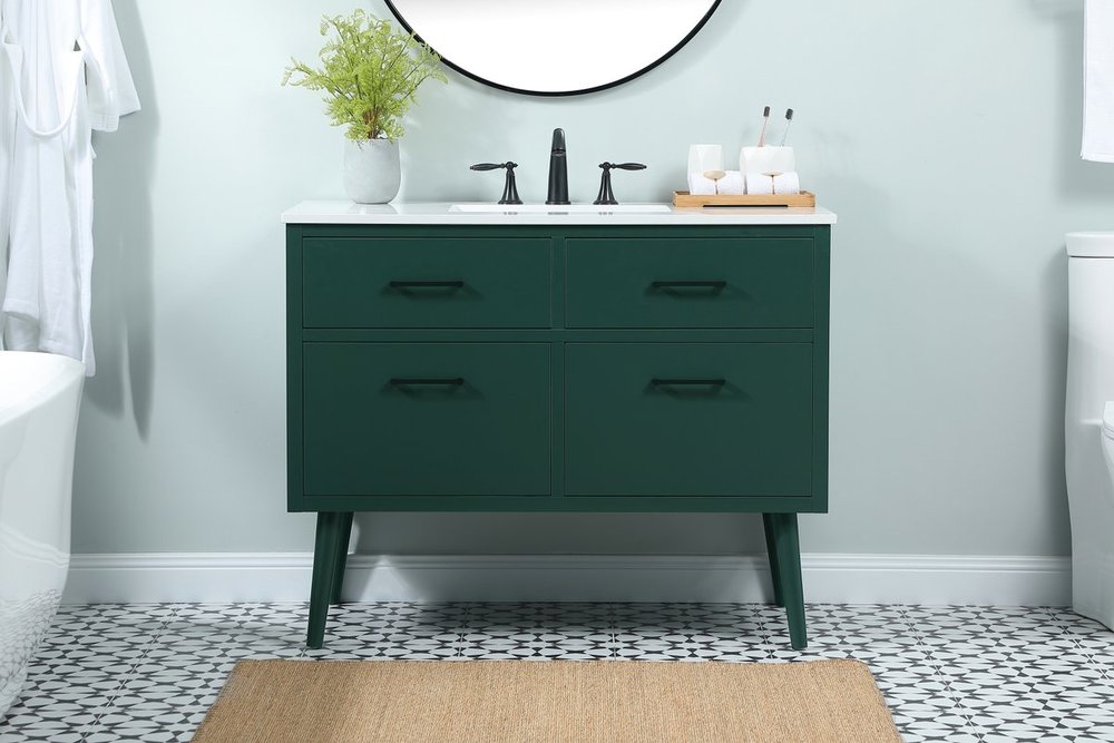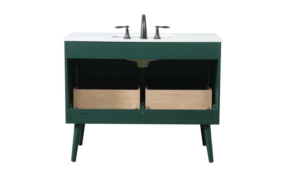 Delve into a world of minimalistic fashion and contemporary styling with this midcentury modern 42" vanity. The clean lines anchors the design, while the oblique tapered cylinder legs add subtle interest. However, the artful juxtaposition between the green and white creates a blend of bright modernity and classical traditions. A black handle adorns the top fake drawer hiding the base of the integrated porcelain sink while another one allows you to pull the bottom drawer out, letting you store your bathroom necessities and toiletries. The compact size makes it the perfect vanity for any bathroom or powder room, regardless of size.