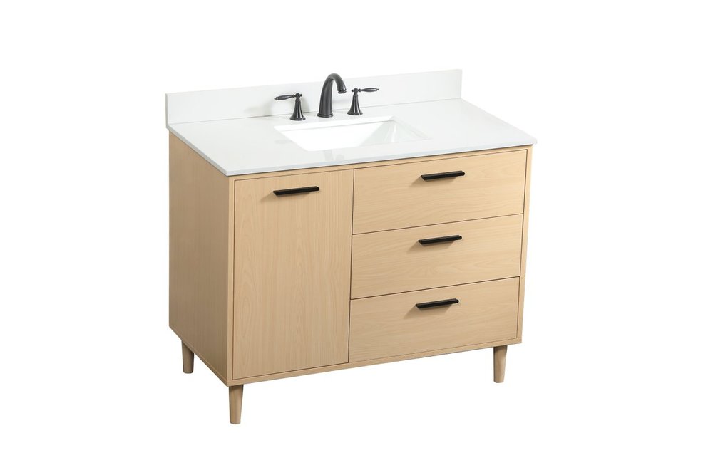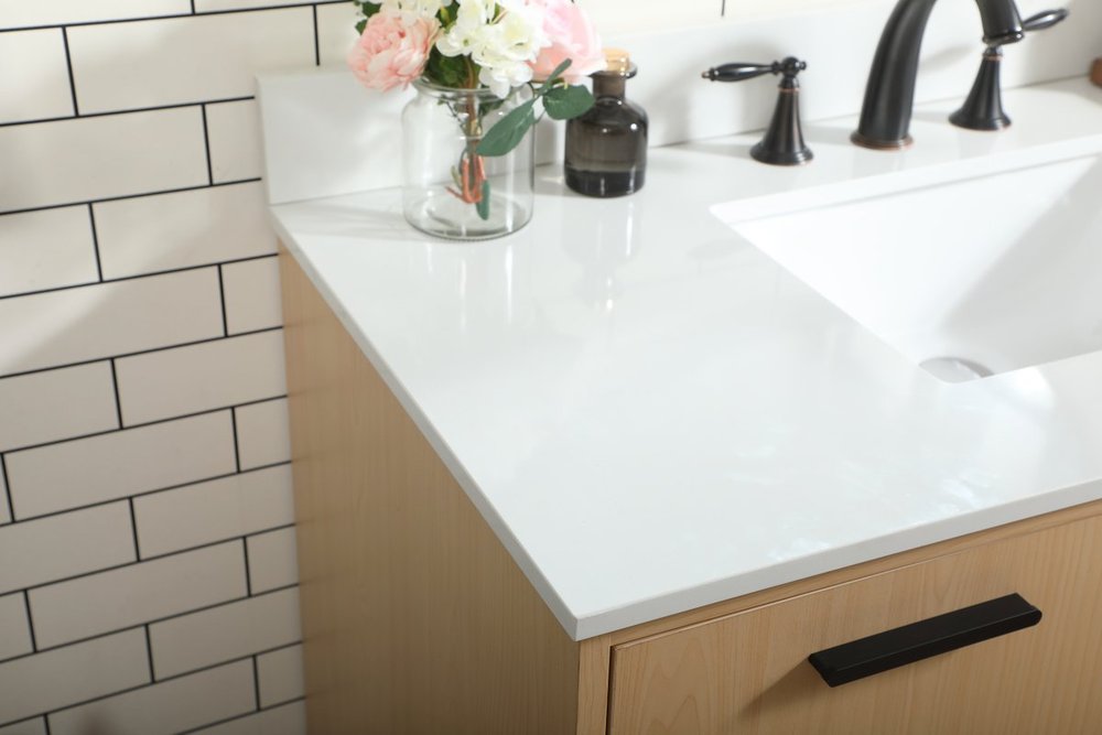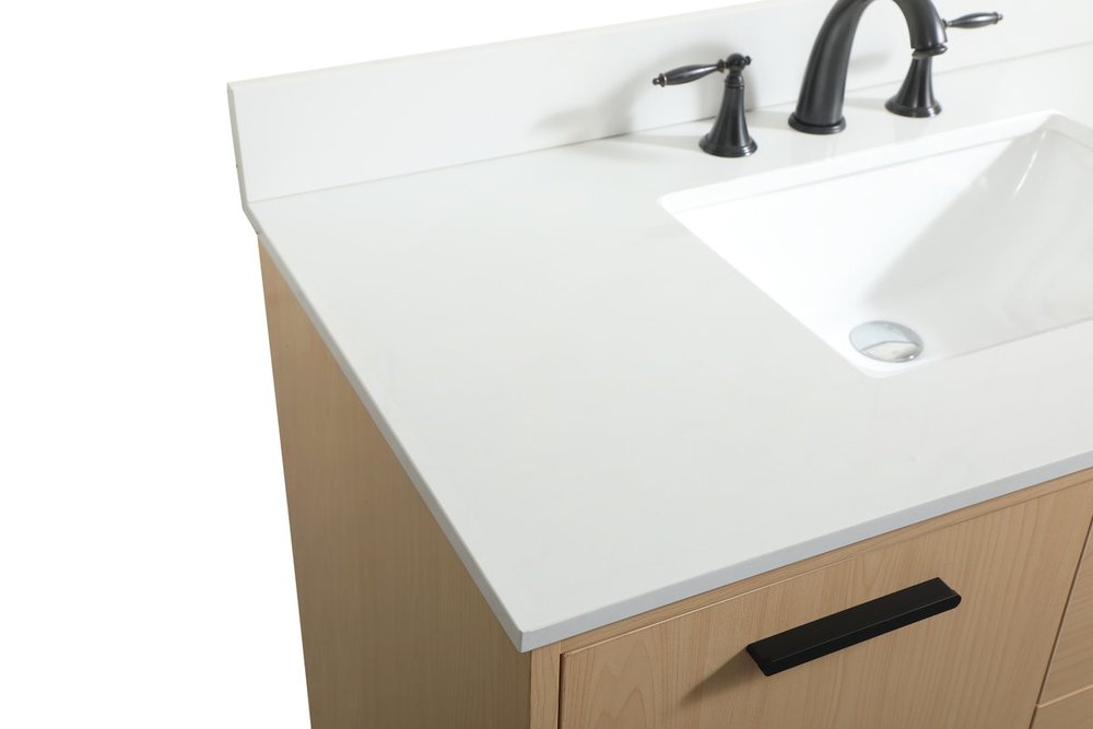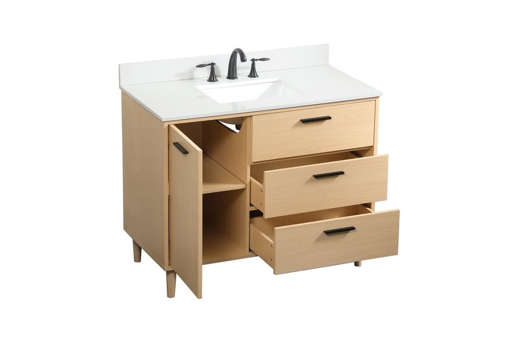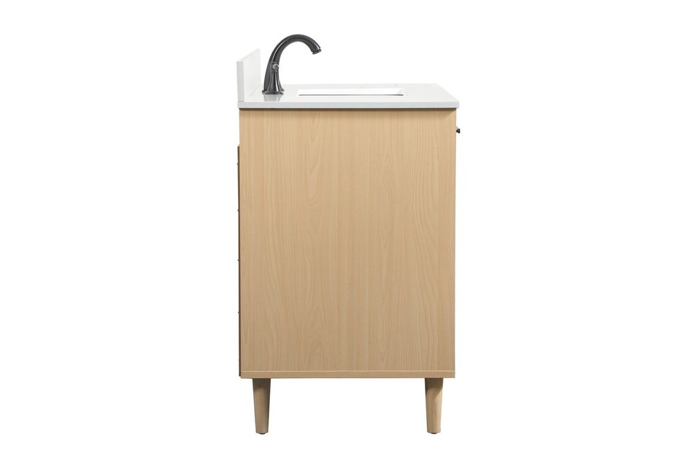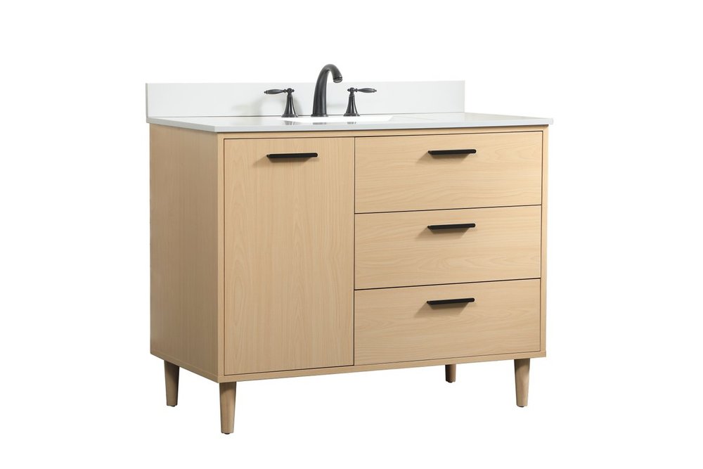 Modern sophistication is defined with the mape finish and black barpulls of this vanity and slender tapered legs. Its length makes it the perfect addition to any sized home, and saves space with its storage area hidden behind the Single cabinet door and two bottom drawers. Topped with a highly durable engineered stone countertop and a porcelain undermount sink, this modern design will become your focal point of your bathroom. Comes with a matching backsplash to complete the look and protects your wall.