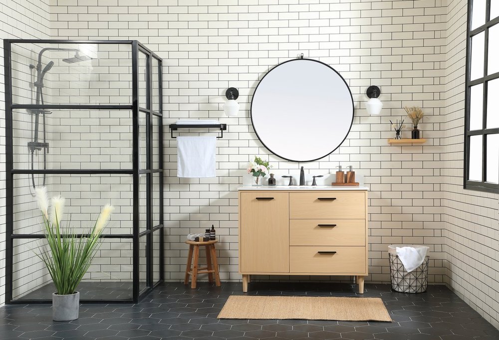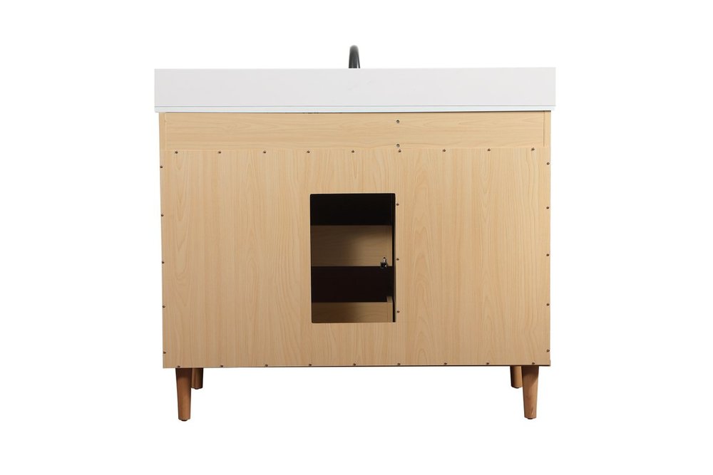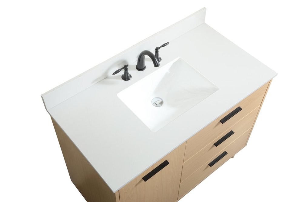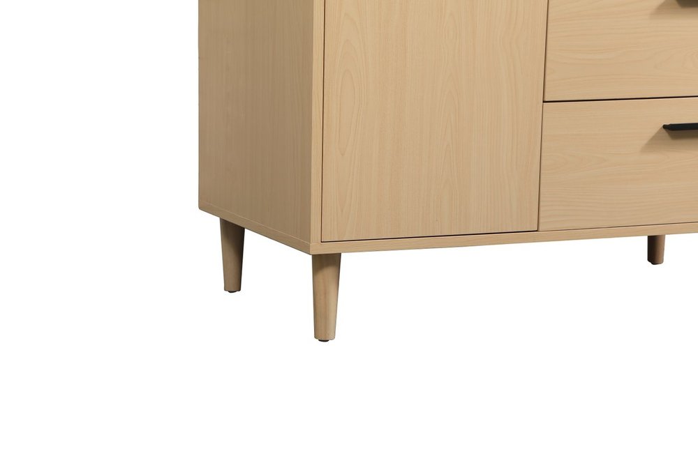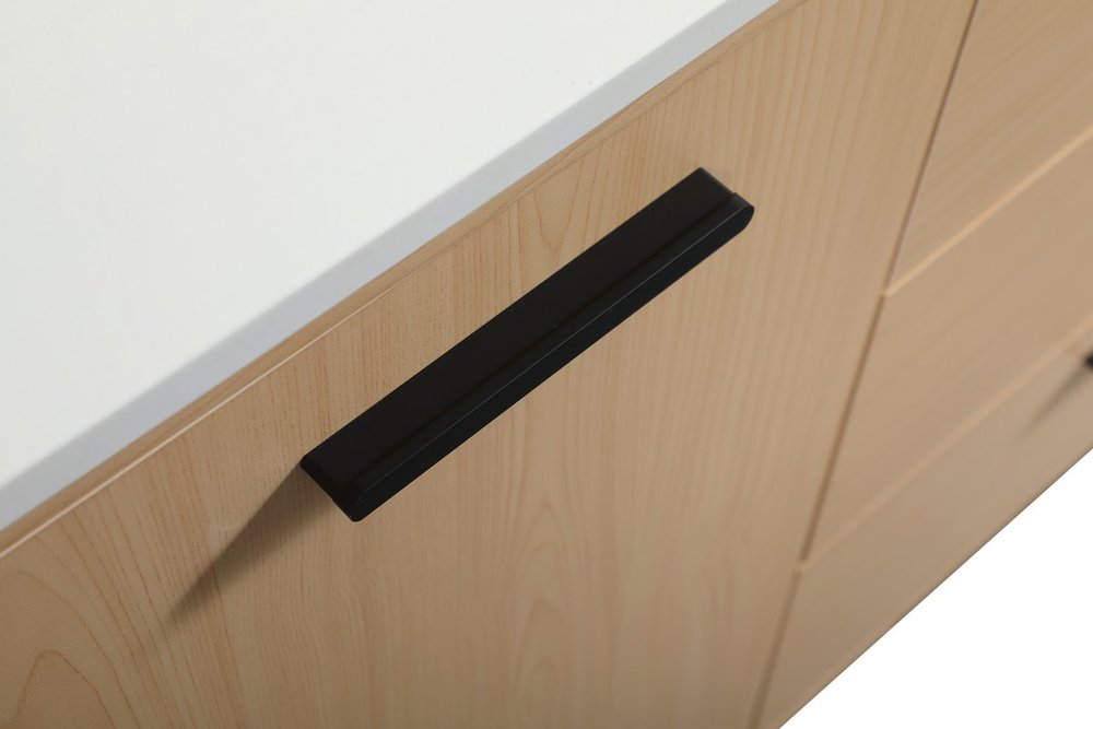 Modern sophistication is defined with the mape finish and black barpulls of this vanity and slender tapered legs. Its length makes it the perfect addition to any sized home, and saves space with its storage area hidden behind the Single cabinet door and two bottom drawers. Topped with a highly durable engineered stone countertop and a porcelain undermount sink, this modern design will become your focal point of your bathroom. Comes with a matching backsplash to complete the look and protects your wall.