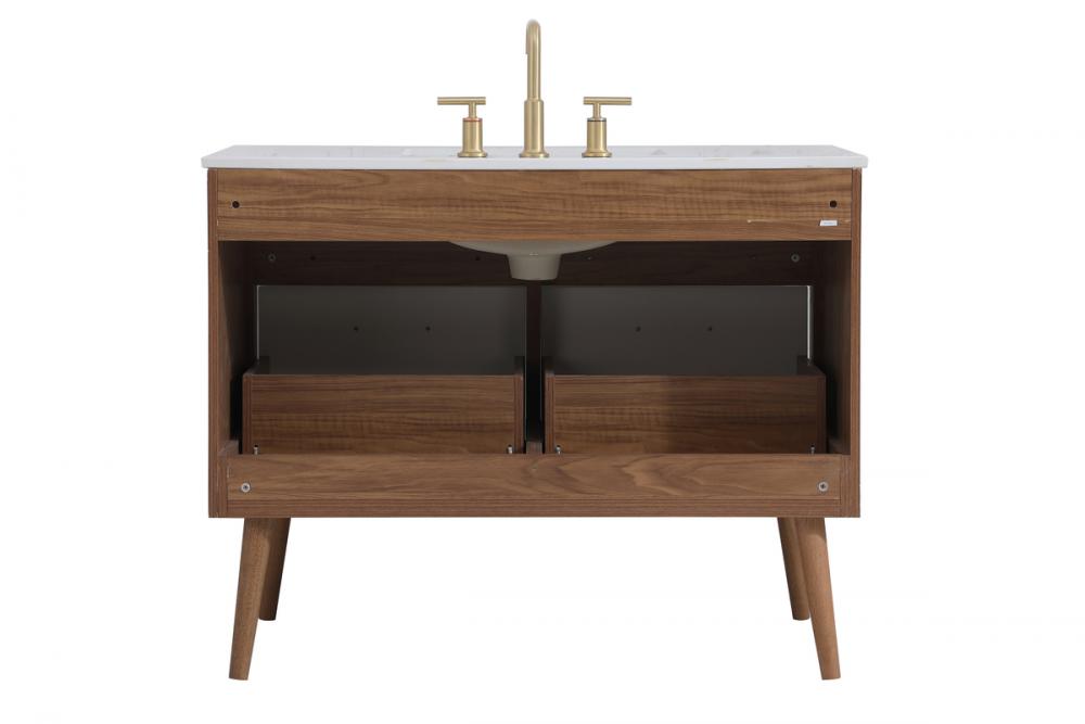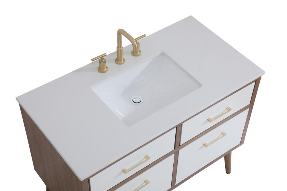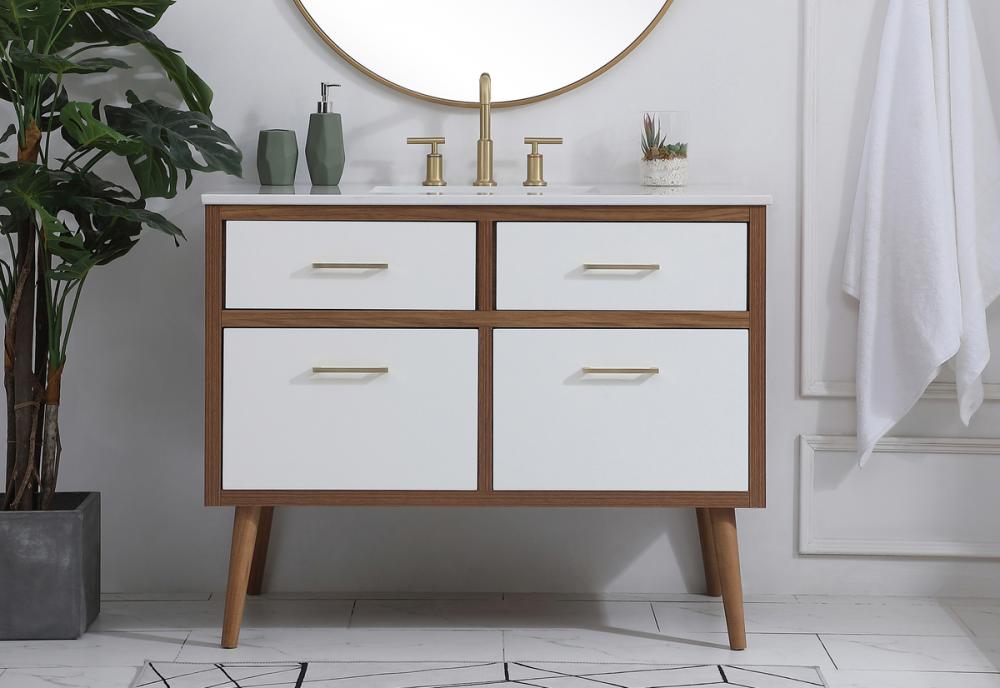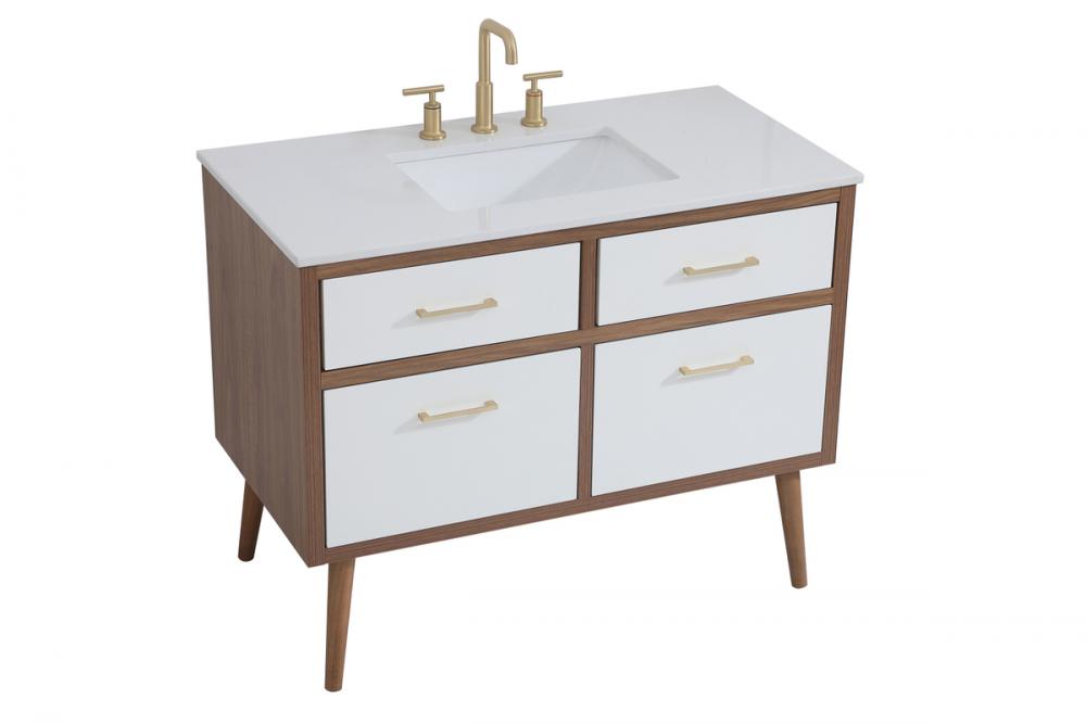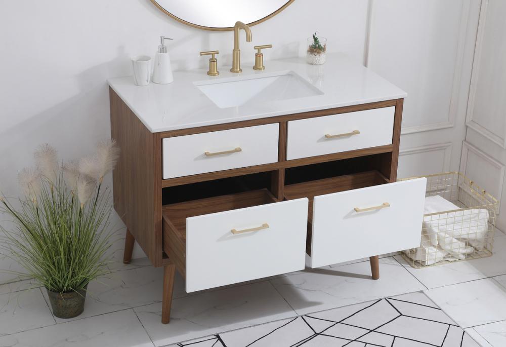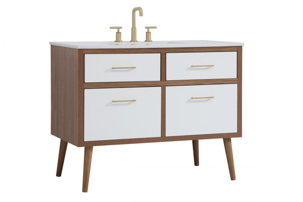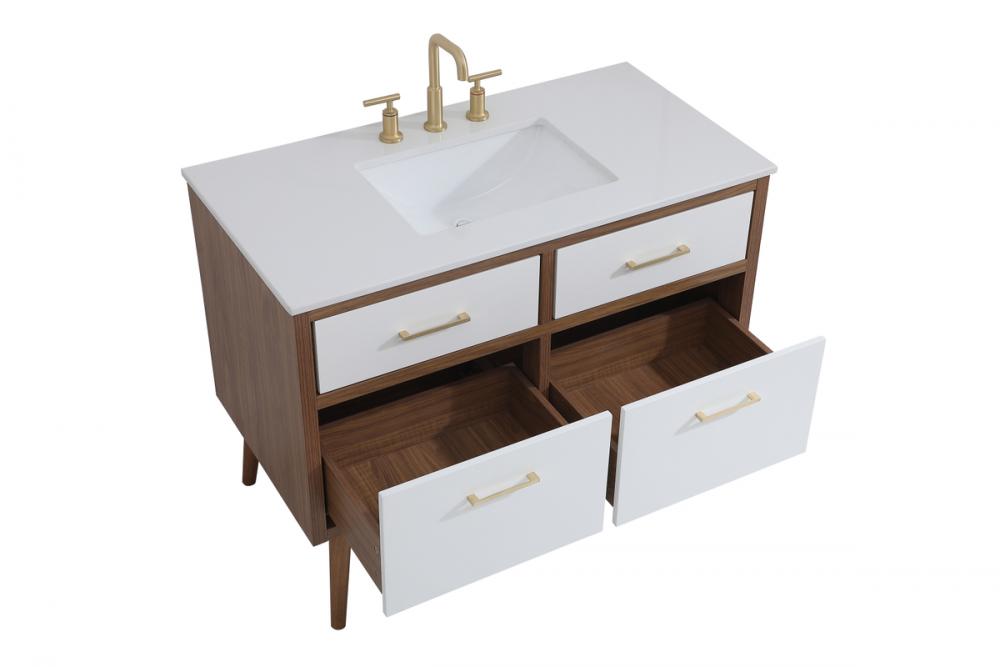 Delve into a world of minimalistic fashion and contemporary styling with this midcentury modern 42" vanity. The clean lines anchors the design, while the oblique tapered cylinder legs add subtle interest. However, the artful juxtaposition between the walnut brown and matte white creates a blend of bright modernity and classical traditions. A gold handle adorns the top fake drawer hiding the base of the undermount porcelain sink while another one allows you to pull the bottom drawer out, letting you store your bathroom necessities and toiletries. The compact size makes it the perfect vanity for any bathroom or powder room, regardless of size.