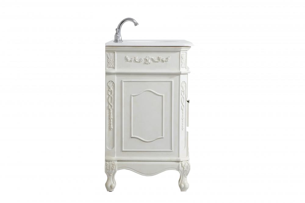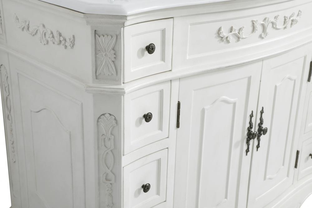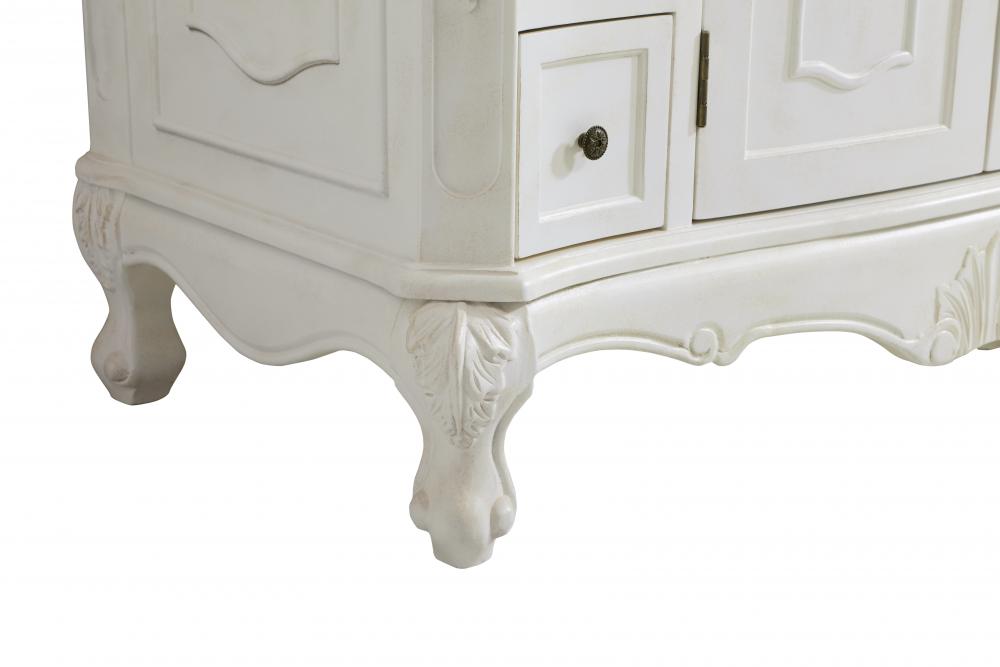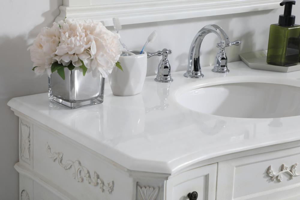 This superb balance of timeless tradition and opulent beauty in a engineered marble-topped vanity will certainly enhance the aesthetics of any home or office bathroom! Featuring an ivory white durable engineered marble countertop complimenting the hand painted cabinet with a delicate carved floral design, stands on stylishly carved solid wood French scroll feet. Don't let the design fool you, the engineered marble countertop and porcelain undermount sink allows for space to get ready, while the antique bronze hardware allows you to discover storage spaces with ease. You and your guests will marvel at this vanity that will both store away your bathroom essentials and enhance the aesthetics of your room.