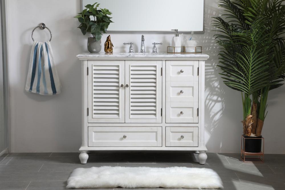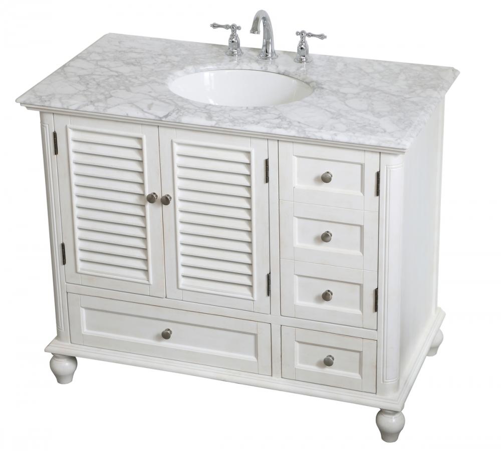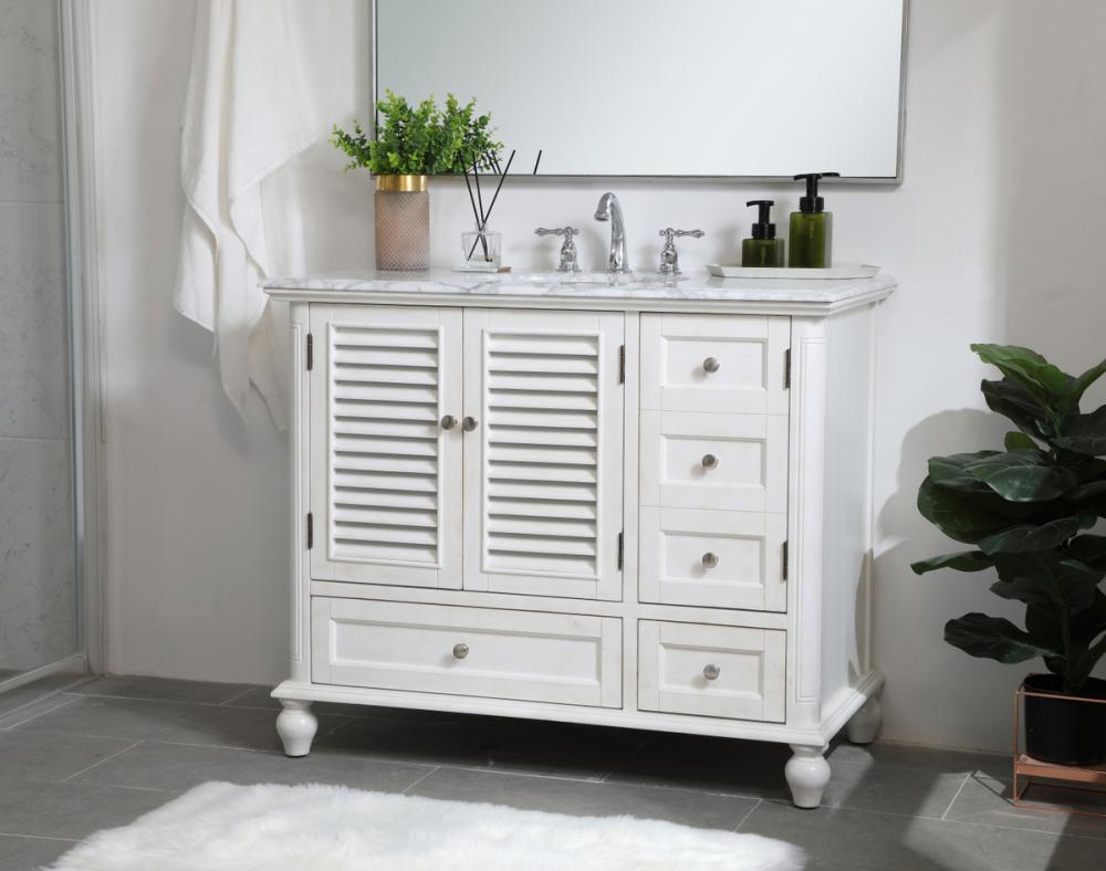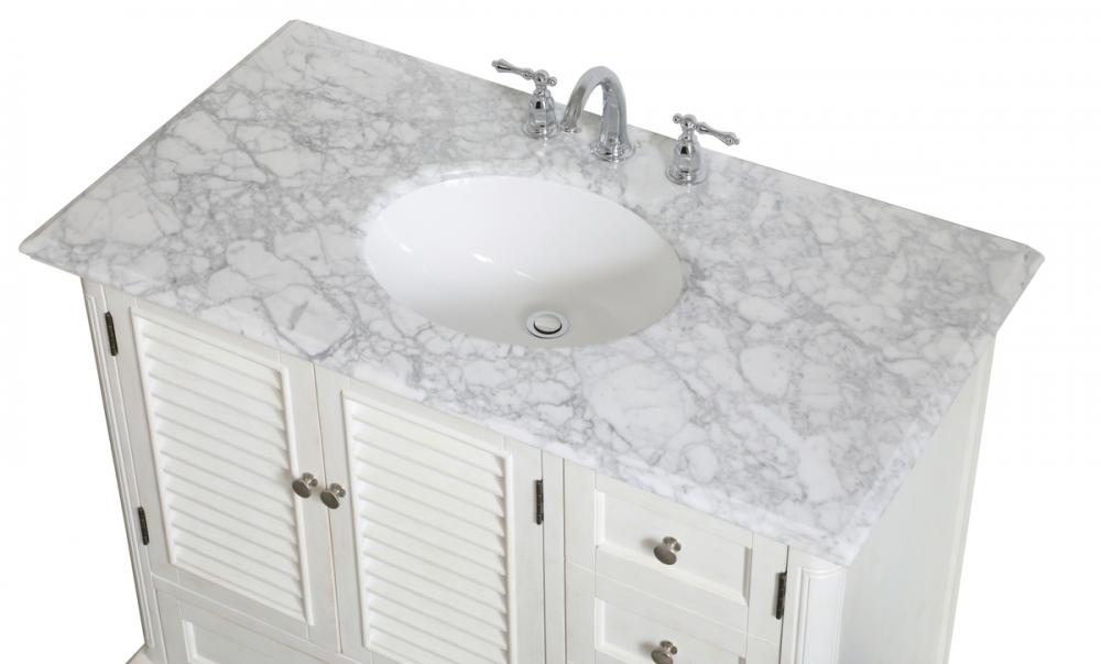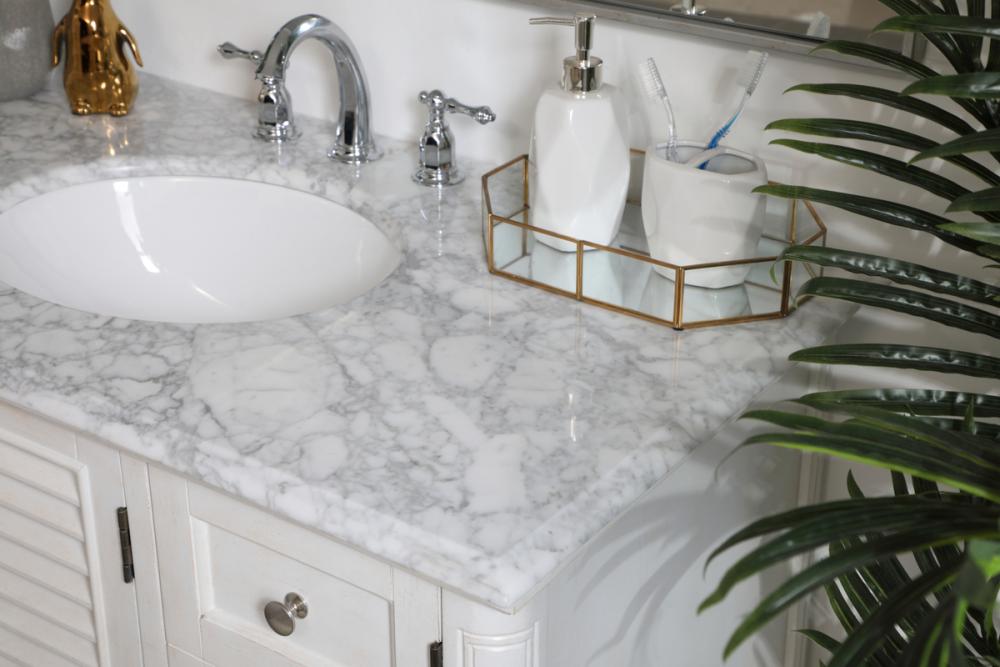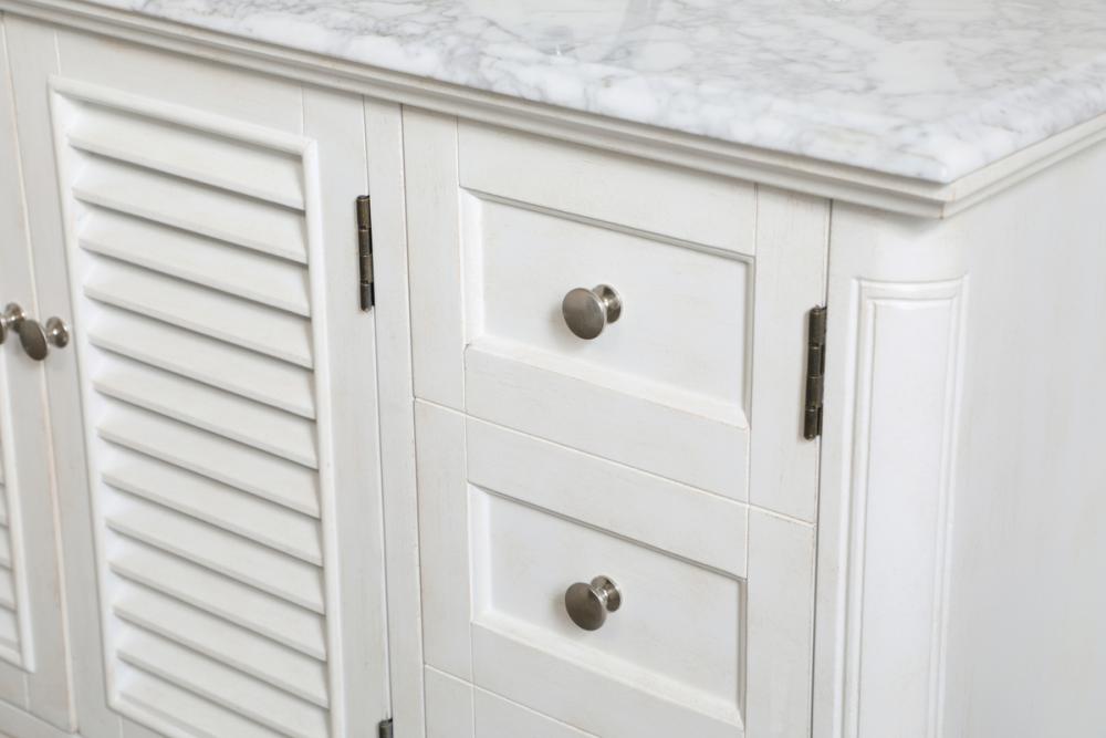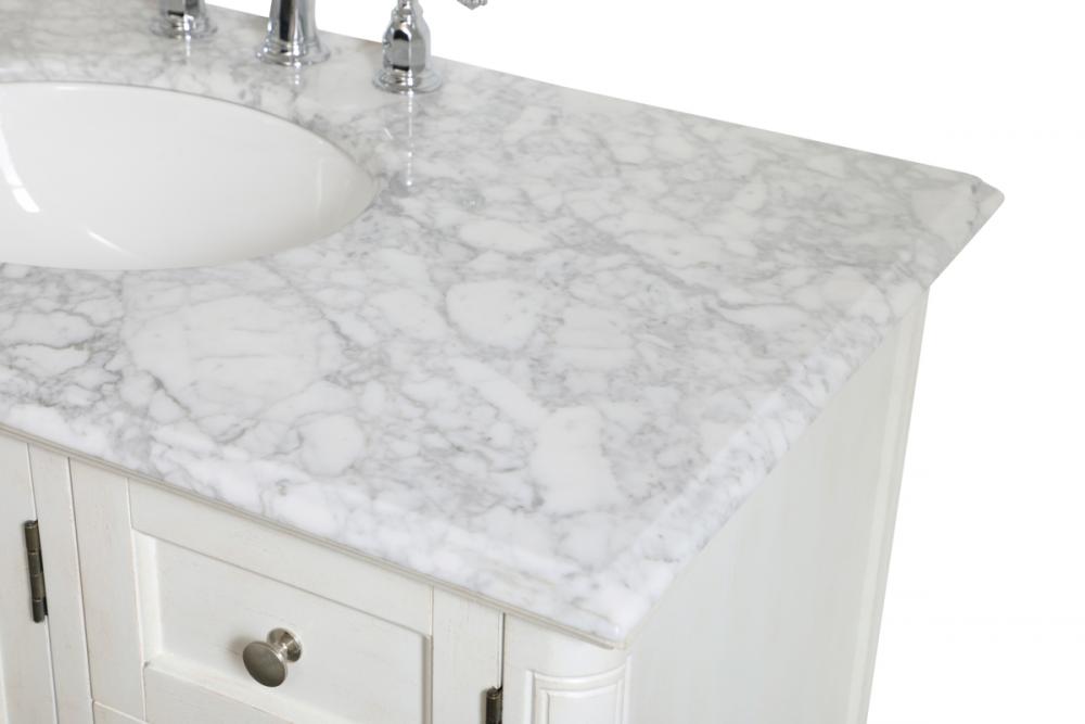 Distressed antique white finish with a luxurious carrara white marble countertop