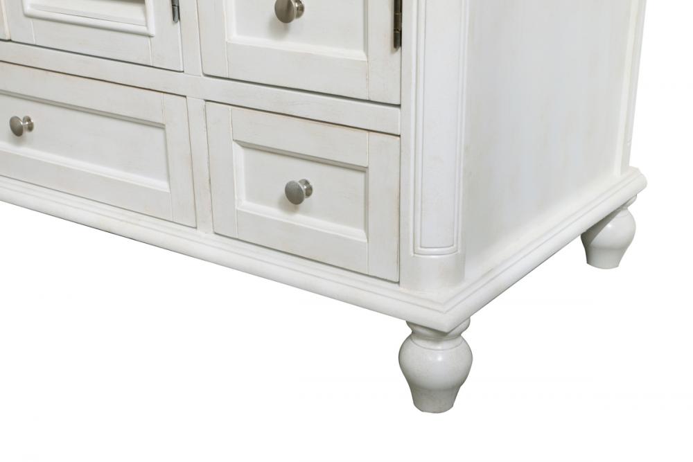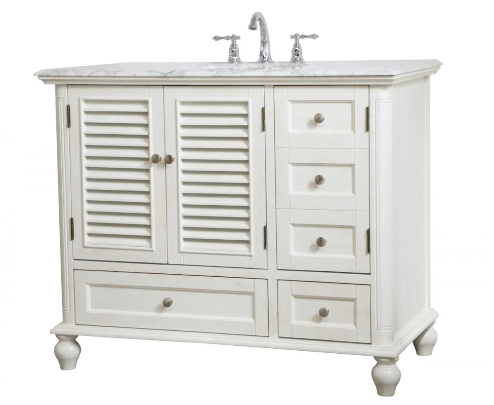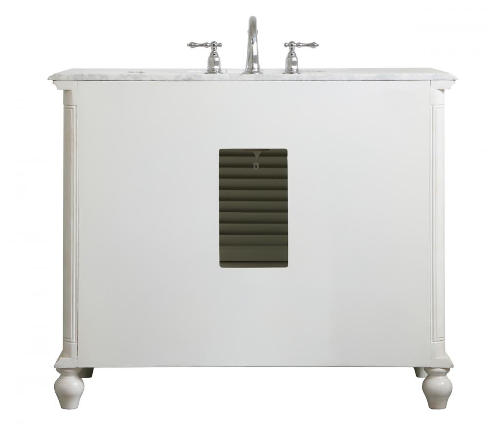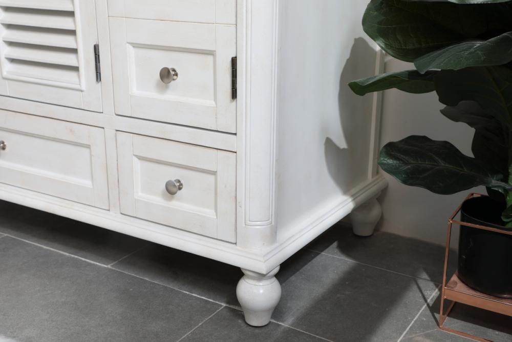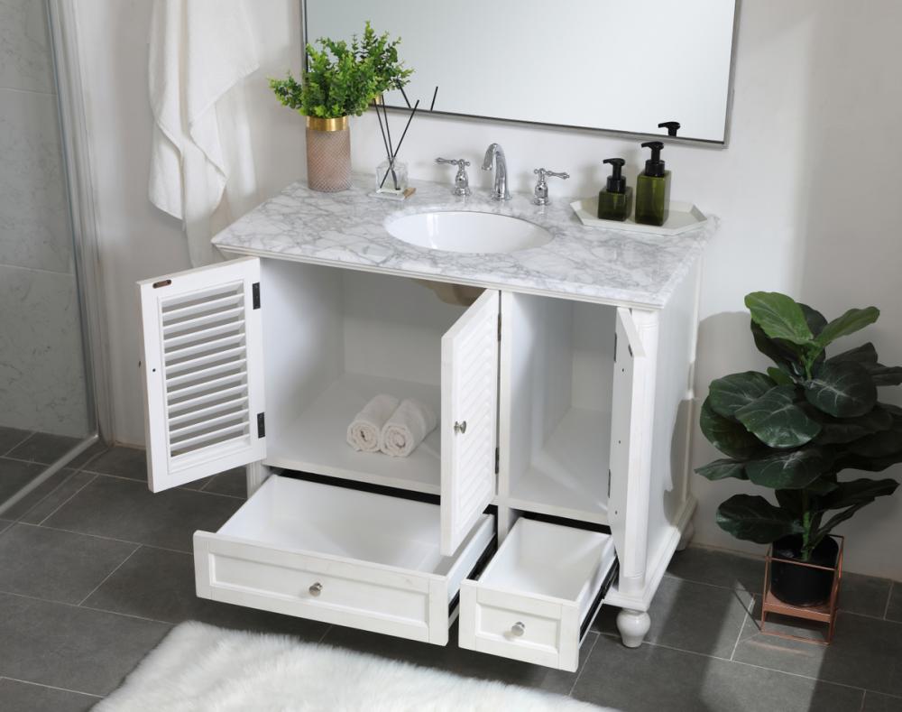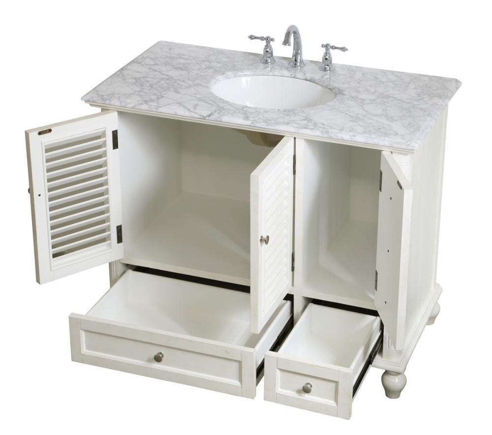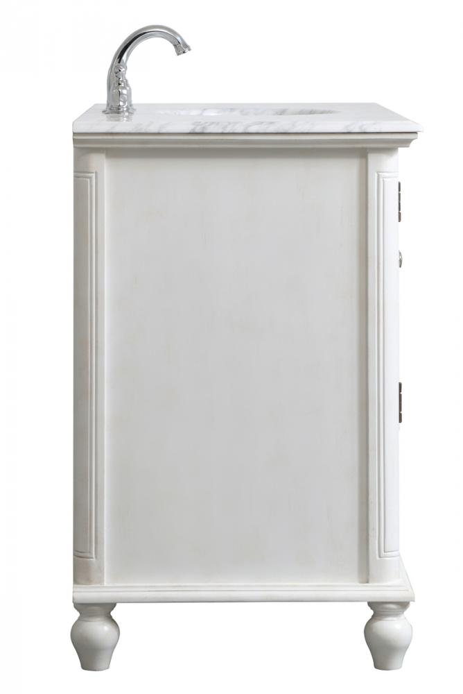 Never compromise beauty--the Rhodes collection stunning vanity in an antique white finish will add lovely sophistication and complement any bathroom or powder room, while utilizing its charm and function to provide you with ample storage spaces. Brushed nickel knobs gently adorn the two drawers at the base and the two shuttered cabinet doors, and the delightful surprising "hidden" cabinet door. Disguised as three drawers, the third cabinet door opens to reveal a space within. These storage areas allows for you to store away your bathroom essentials. The Carrara white marble countertop, porcelain undermount sink, dignified subtle engravings on the side edges, and rounded legs all come together to create contemporary beauty. Work with your space, and design a beautiful room, no matter the size.