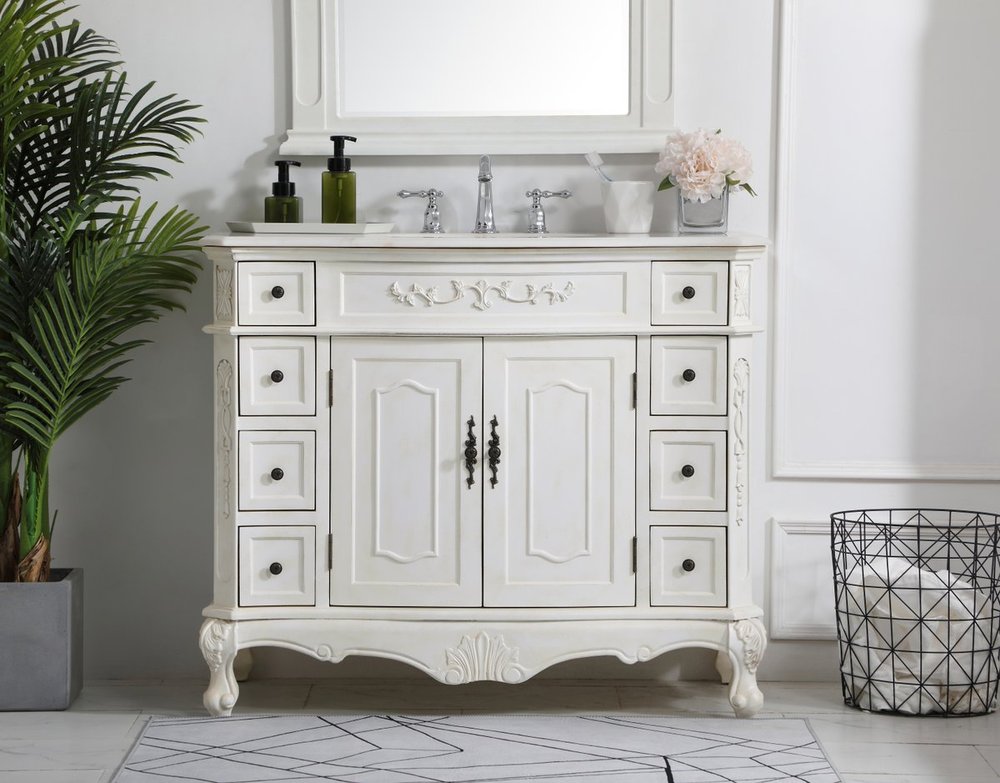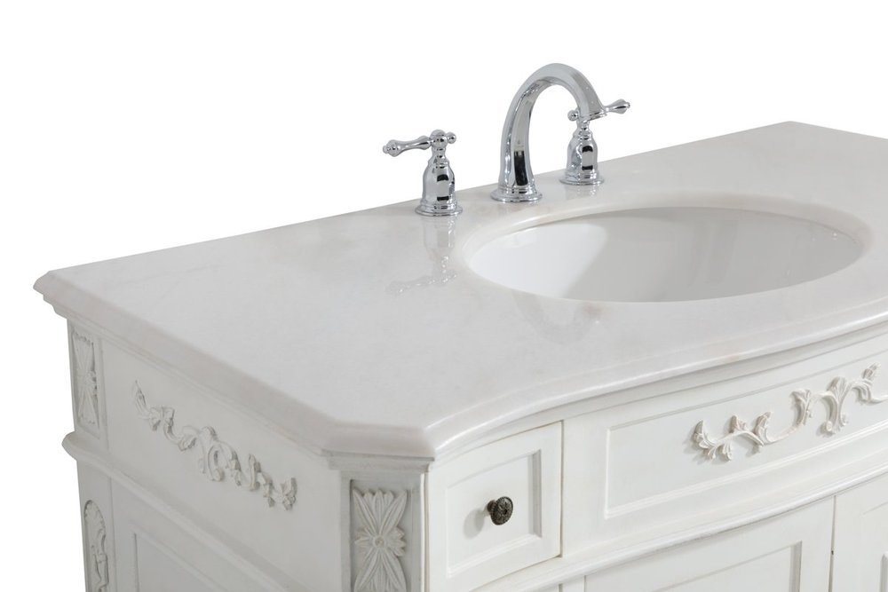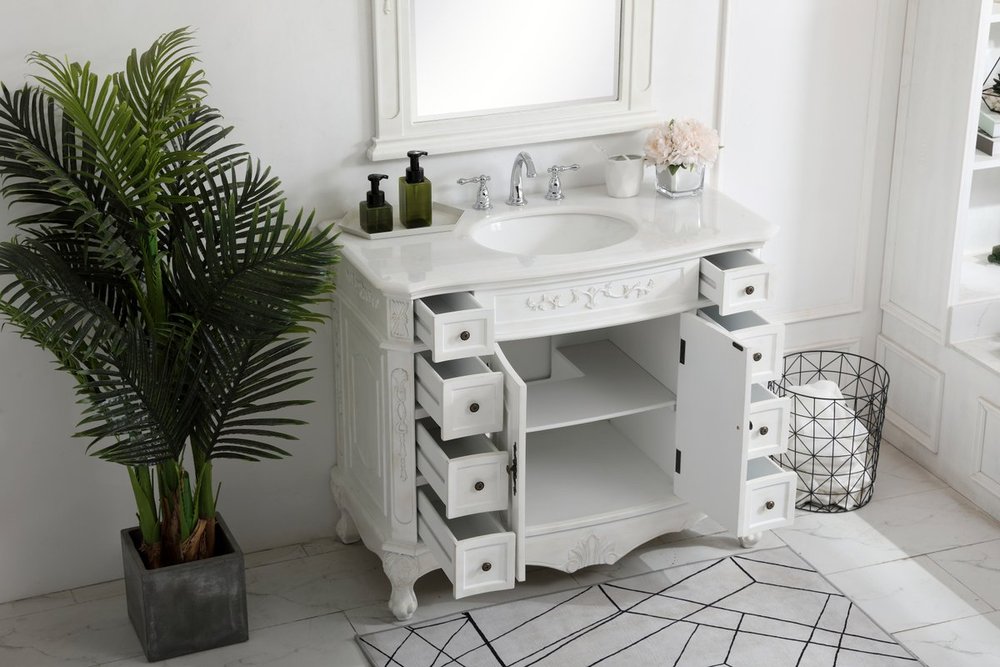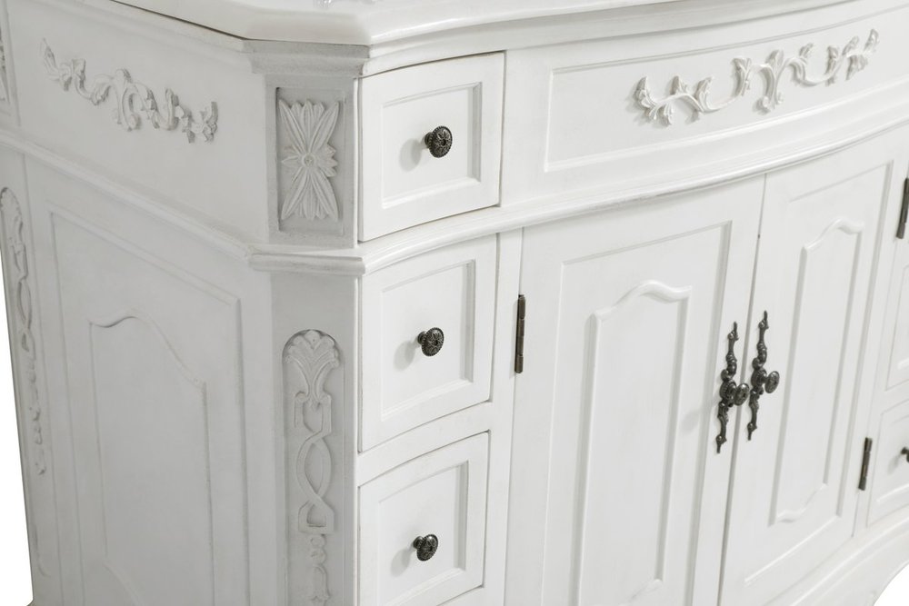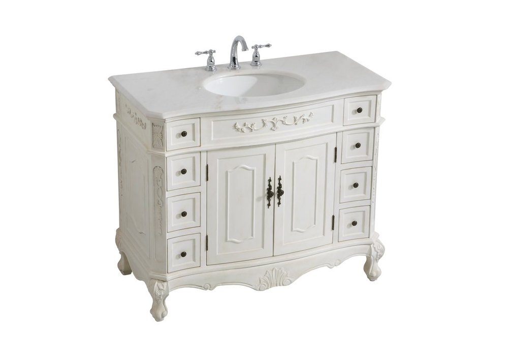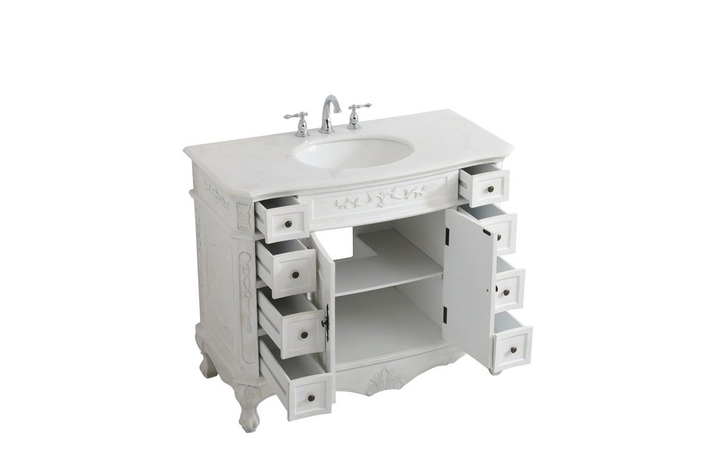 The Danville collection 42" vanity in an antique white finish brings about traditional beauty. Decorated with ornate filigrees and engravings throughout, your bathroom or powder room will exude refined beauty. Don't let the design fool you, the white marble countertop with subtle occasional coffee color veins and porcelain undermount sink allows for space to get ready, while the antique bronze hardware allows you to discover storage spaces with ease. The simple knobs allows you to glide the 8 side drawers out, while the ornate knobs help you open the two center cabinet doors. You and your guests will marvel at this vanity that will both store away your bathroom essentials and enhance the aesthetics of your room.