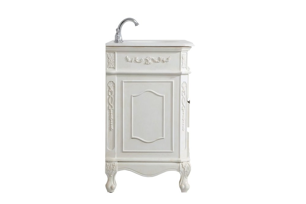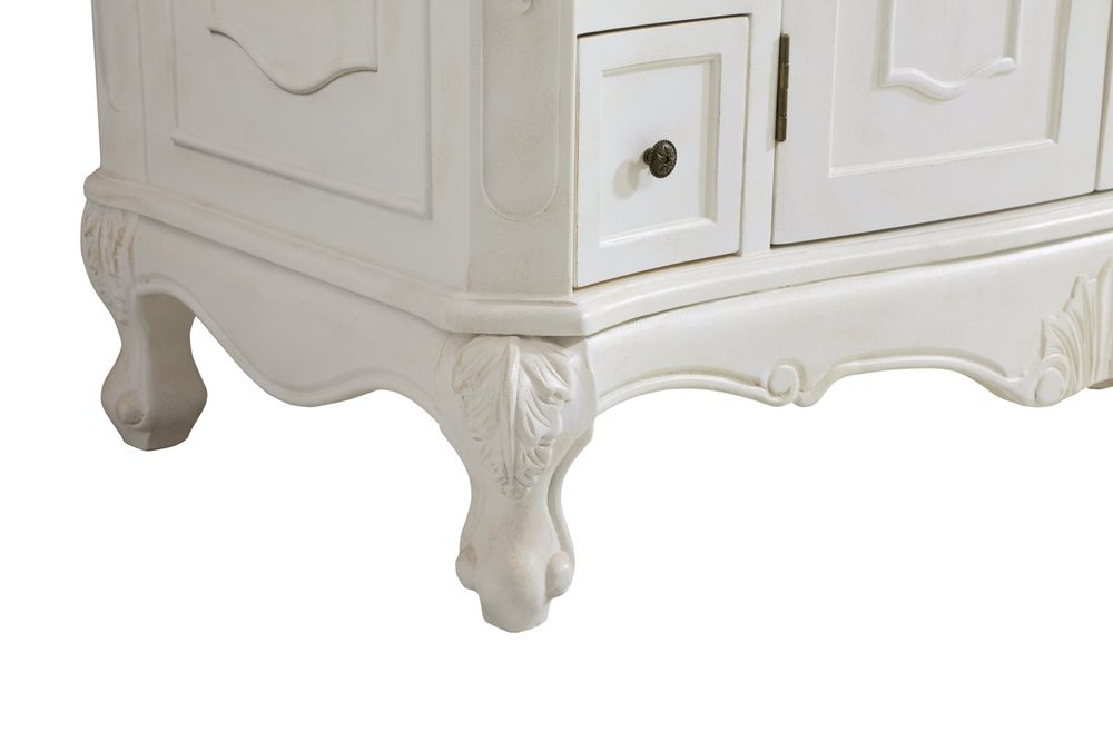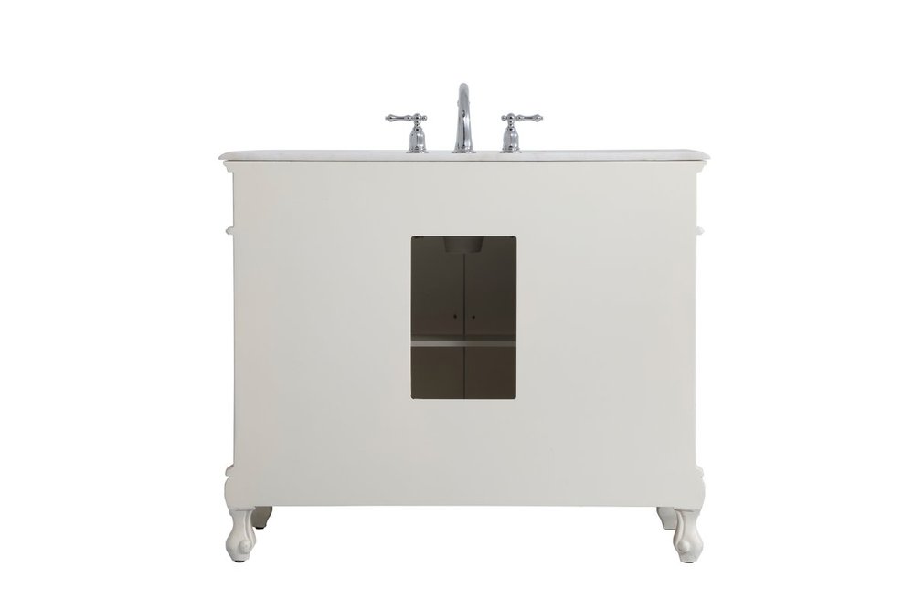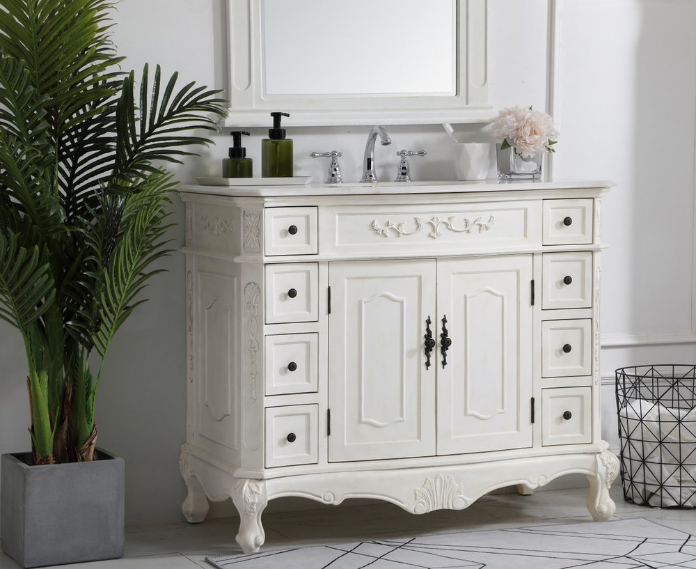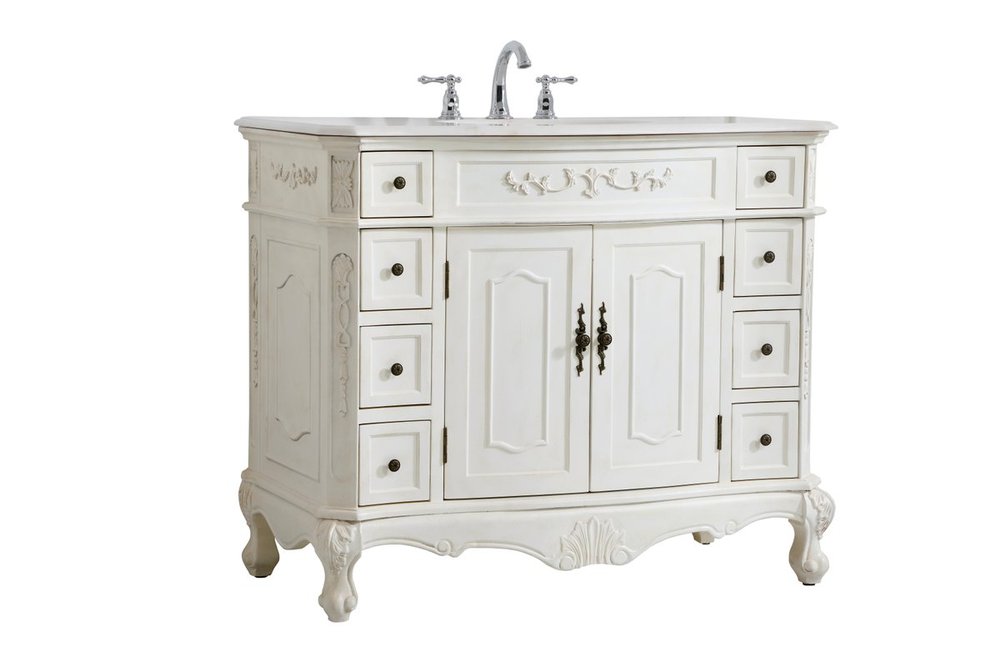 The Danville collection 42" vanity in an antique white finish brings about traditional beauty. Decorated with ornate filigrees and engravings throughout, your bathroom or powder room will exude refined beauty. Don't let the design fool you, the white marble countertop with subtle occasional coffee color veins and porcelain undermount sink allows for space to get ready, while the antique bronze hardware allows you to discover storage spaces with ease. The simple knobs allows you to glide the 8 side drawers out, while the ornate knobs help you open the two center cabinet doors. You and your guests will marvel at this vanity that will both store away your bathroom essentials and enhance the aesthetics of your room.