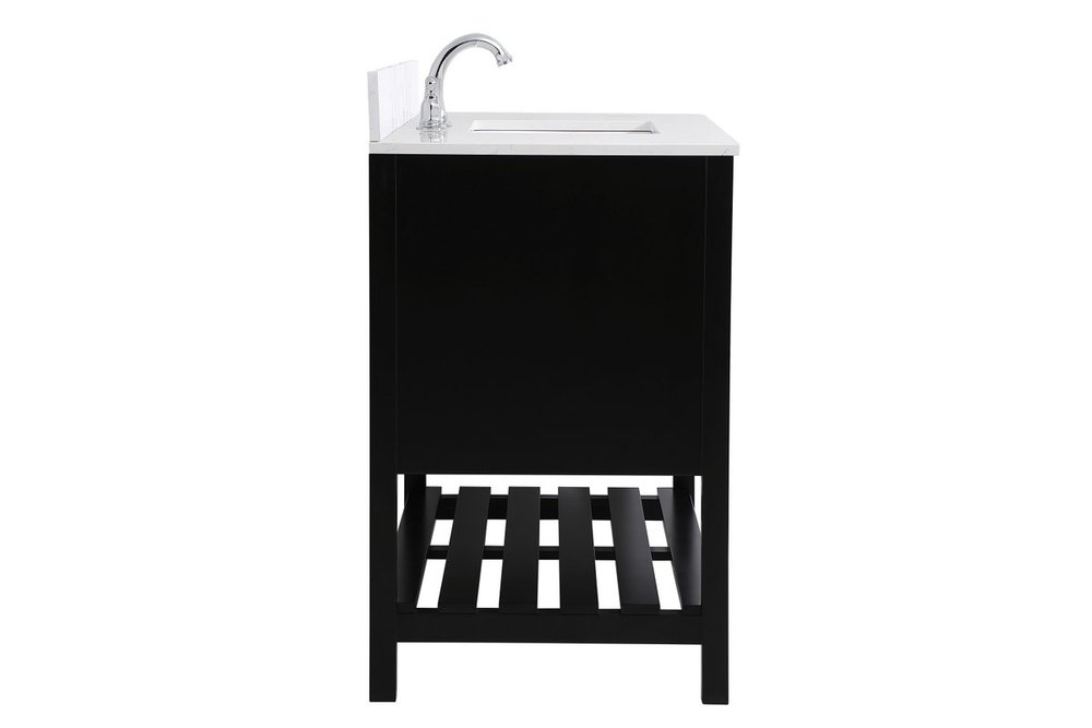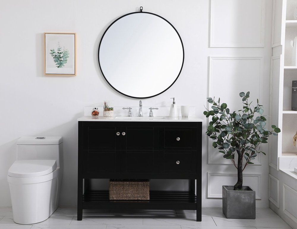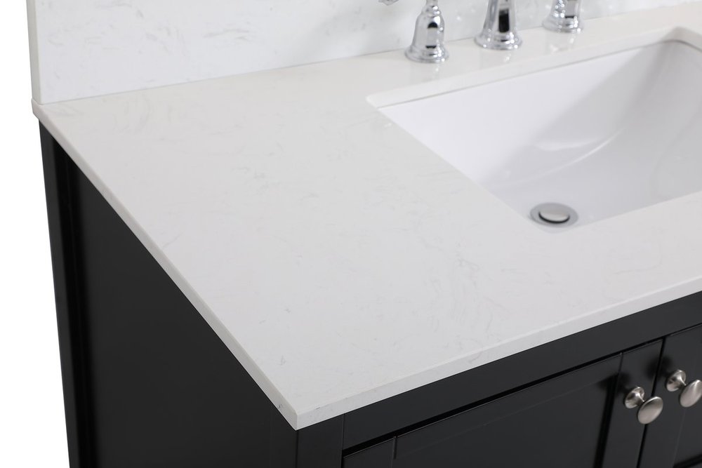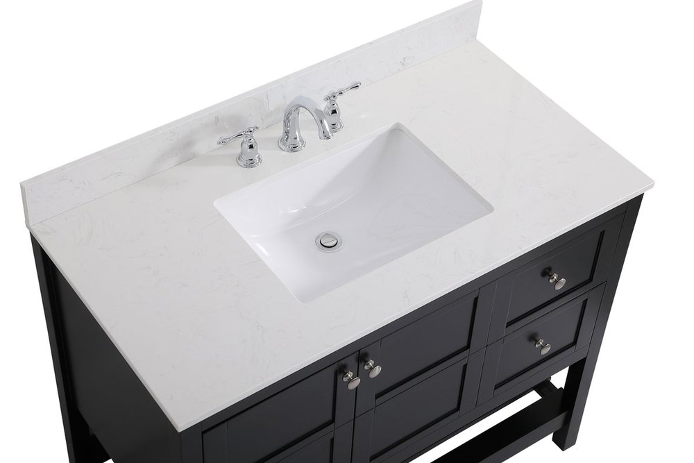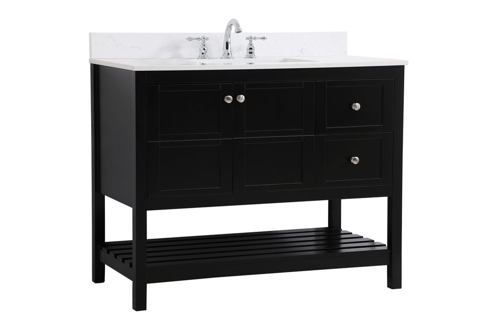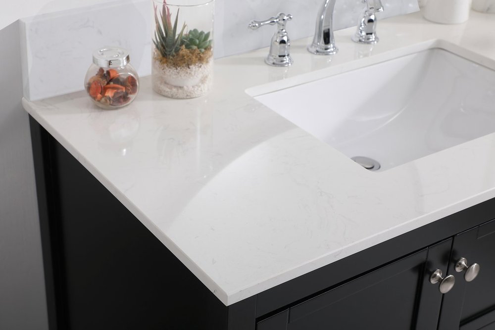 The subtle beauty of the Theo collection 42" vanity in a black finish exudes comfortable luxury. Its modern, yet traditional beauty will surely dress up your bathroom or powder room without any fuss. The white stone countertop and porcelain undermount sink shows quiet opulence, and the legs support upright without fail. Brushed Nickel hardware complements the trendy black finish, with pulls adorning the two cabinet doors and two drawers, showcasing ample storage space within. Slated shelf allows for additional space to organize your towels. Whether this vanity is in your bathroom or for guests, its presence will surely elevate the aesthetics of your room. Comes with a matching backsplash to complete the look and protects your wall.