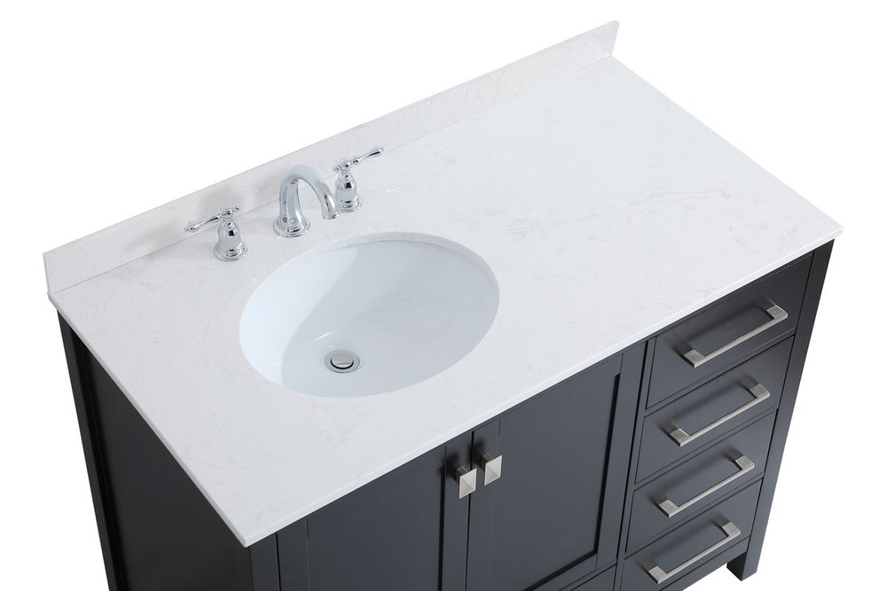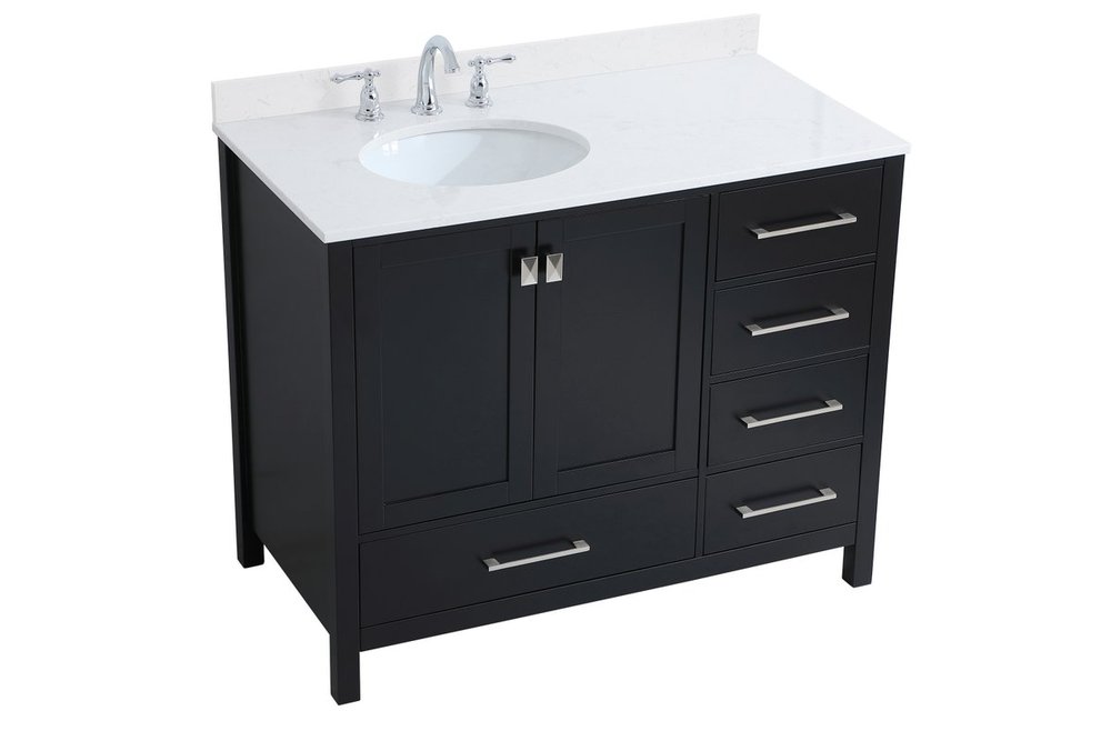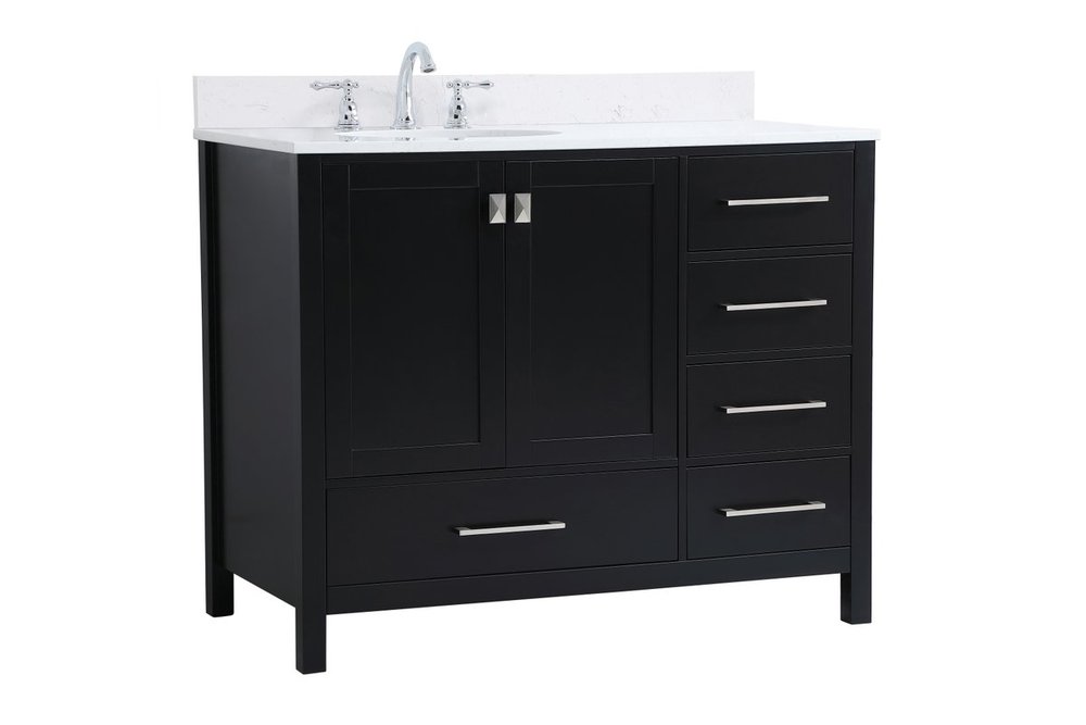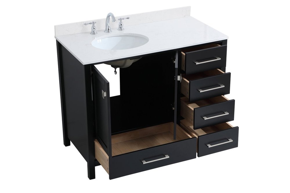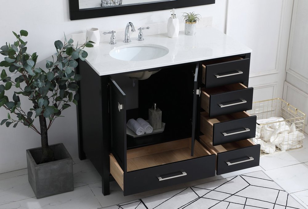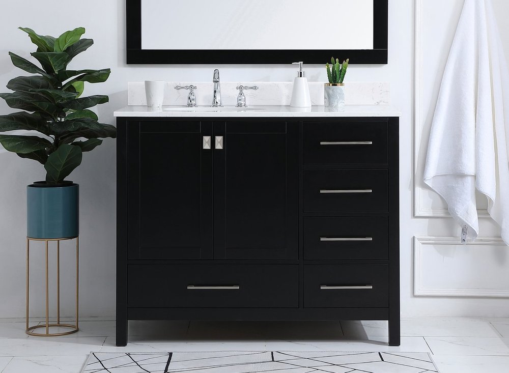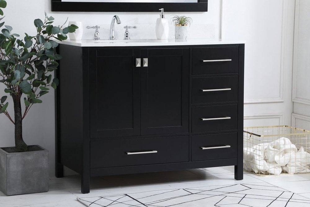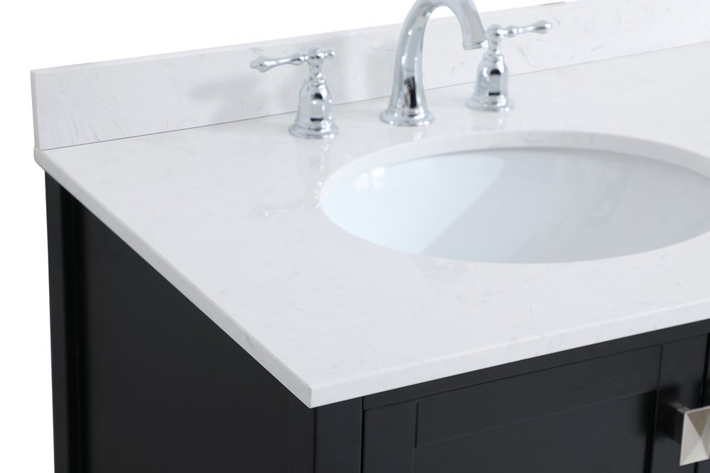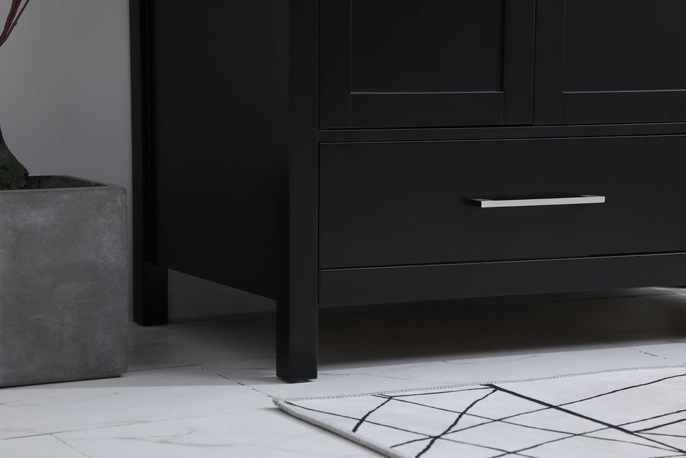 Never compromise beauty--the Irene collection stunning vanity in a black finish will add lovely sophistication and complement any bathroom or powder room, while utilizing its charm and function to provide you with ample storage spaces. Brushed nickel pulls gently adorn the minimalist cabinet doors and drawers at the base, allowing for you to store away your bathroom essentials. The calacatta engineered marble countertop, porcelain undermount sink, dignified subtle engravings on the side edges, and squared legs all come together to create contemporary beauty. Work with your space, and design a beautiful room, no matter the size. Comes with a matching backsplash to complete the look and protects your wall.