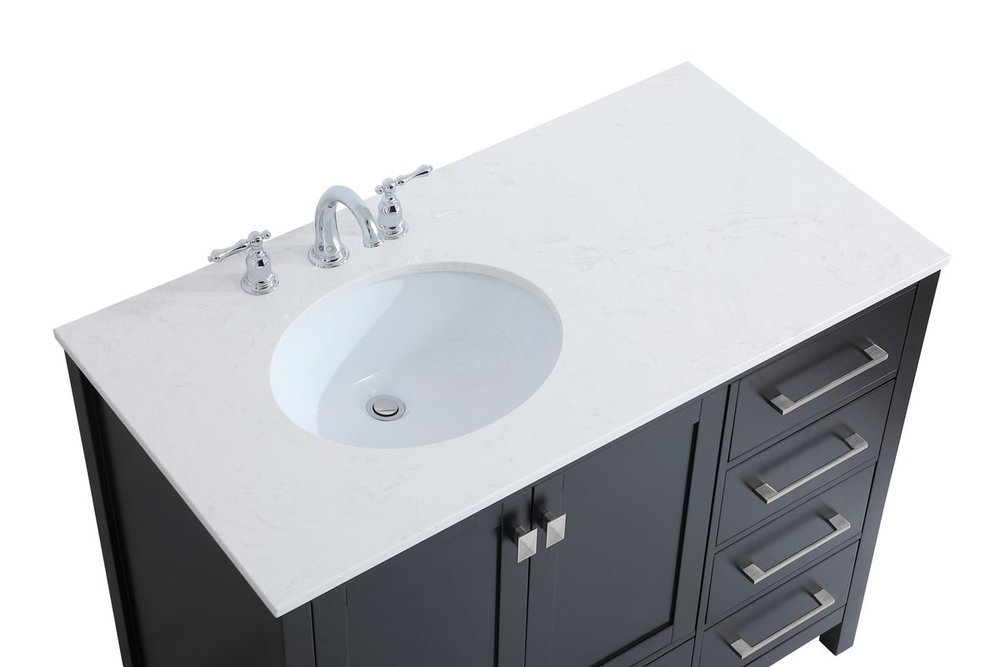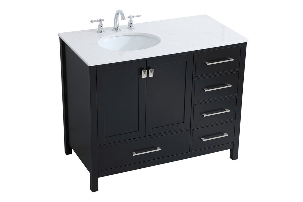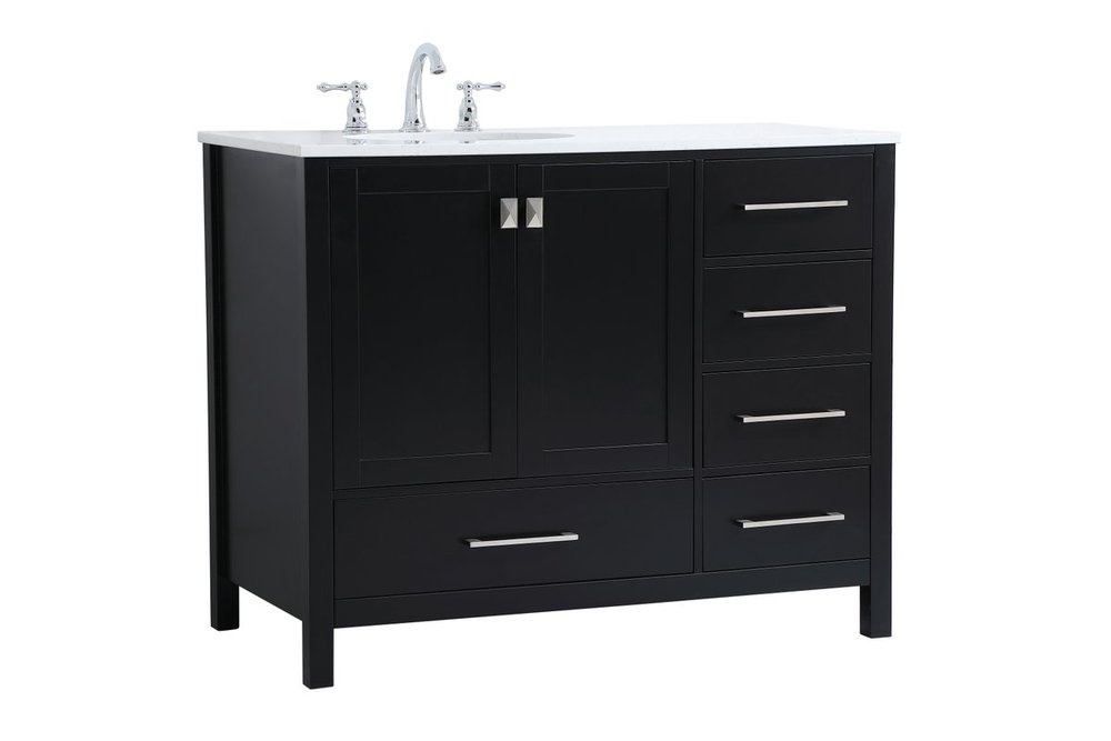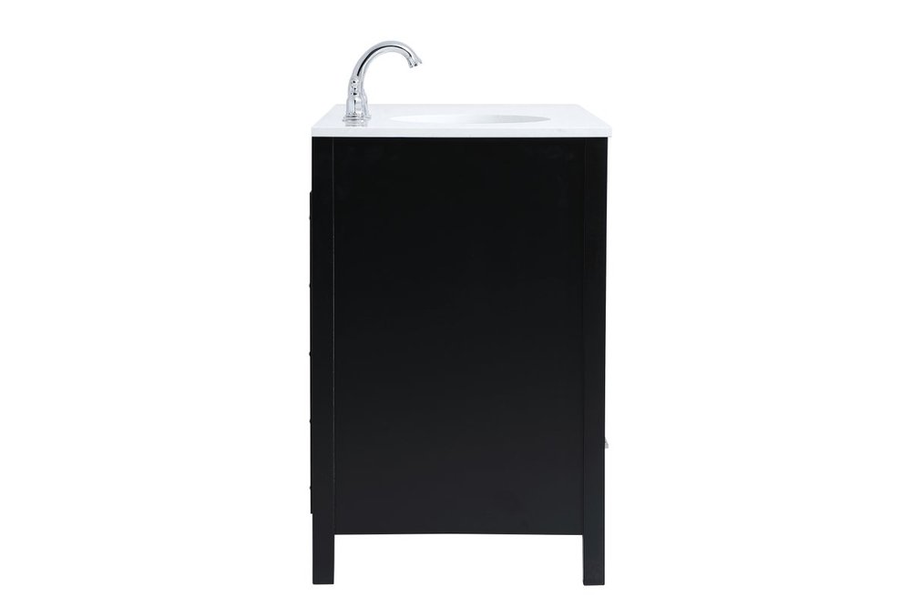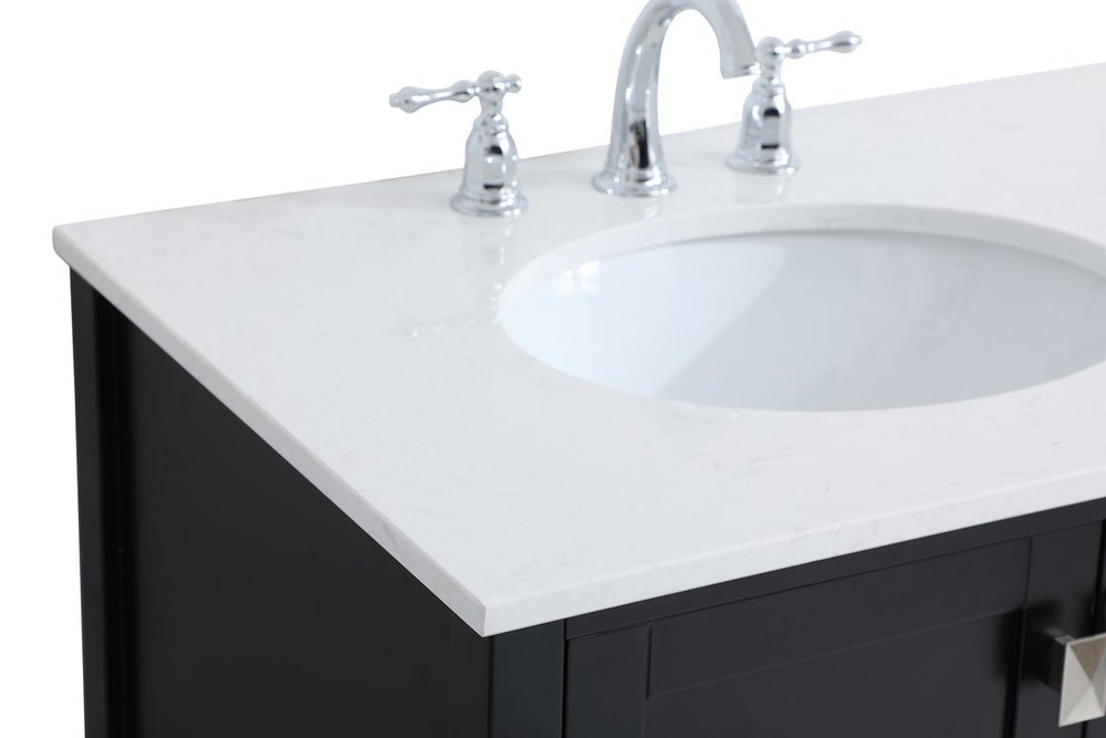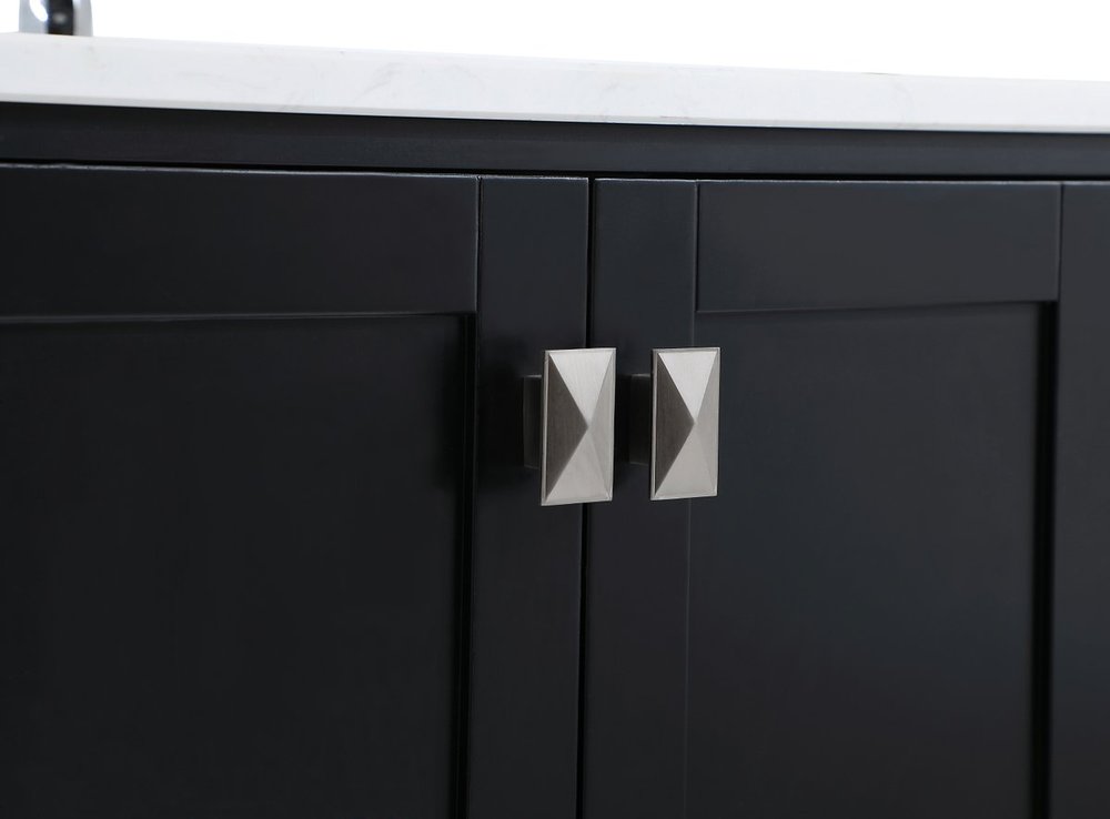 Never compromise beauty--the Irene collection stunning vanity in a black finish will add lovely sophistication and complement any bathroom or powder room, while utilizing its charm and function to provide you with ample storage spaces. Brushed nickel pulls gently adorn the minimalist cabinet doors and drawers at the base, allowing for you to store away your bathroom essentials. The calacatta engineered marble countertop, porcelain undermount sink, dignified subtle engravings on the side edges, and squared legs all come together to create contemporary beauty. Work with your space, and design a beautiful room, no matter the size.