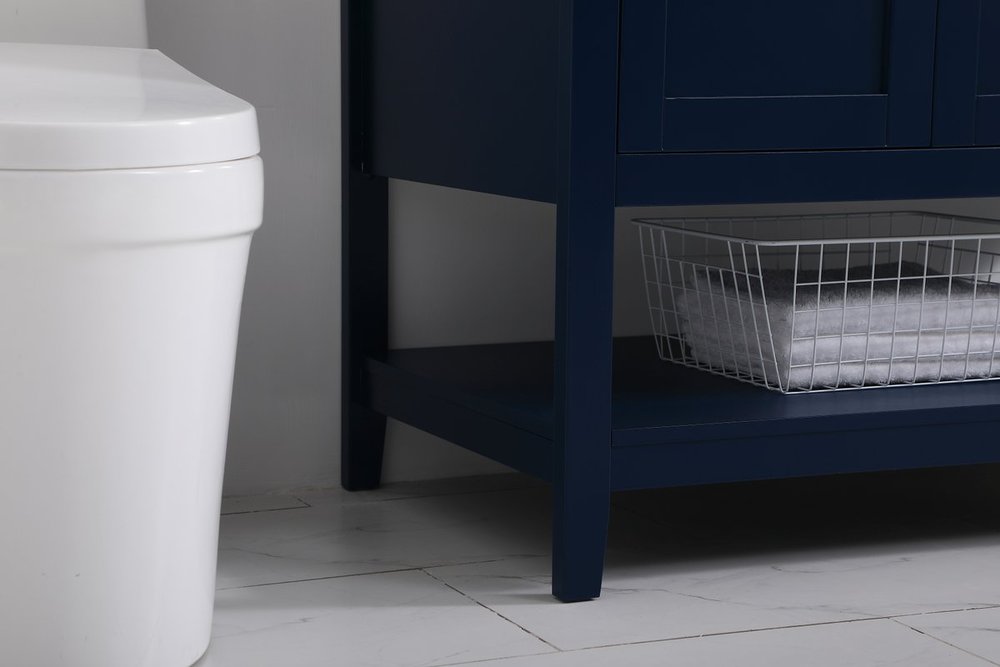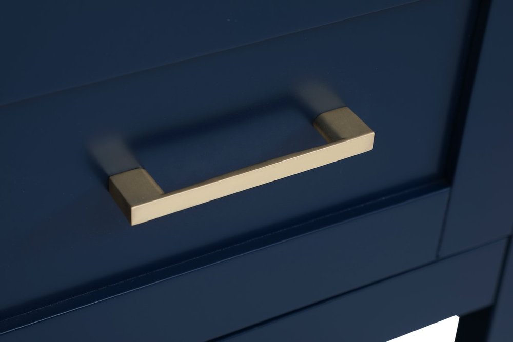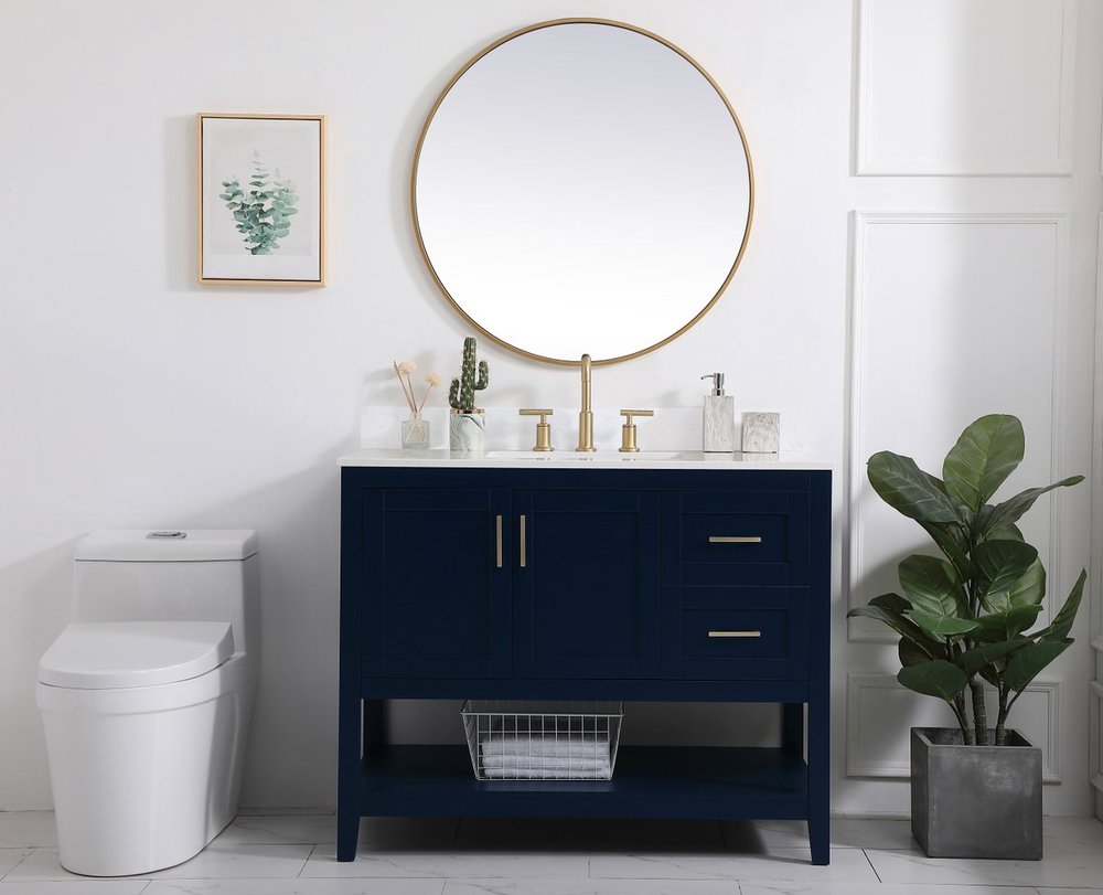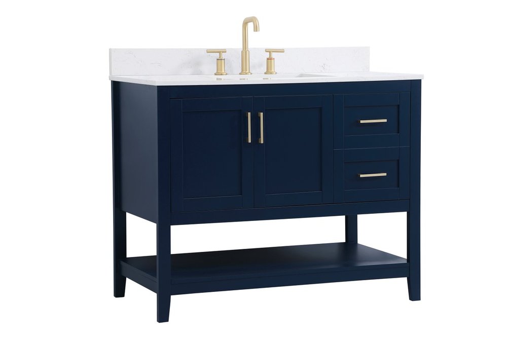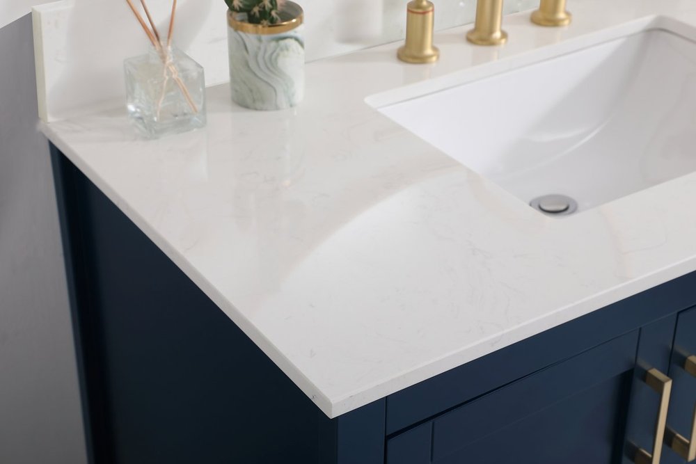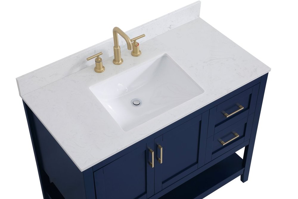 The nonchalant attitude of this 42" traditional Blue finish vanity will have you wanting more. The slender gold handle bars open the 3 cabinet doors to reveal ample storage space to put away and store bathroom essentials, and the open space below allows for you to place clean towels on the rack. Topped with a Calacatta engineered marble countertop, you and your guests will enjoy this easy going vanity. Comes with a matching backsplash to complete the look and protects your wall.