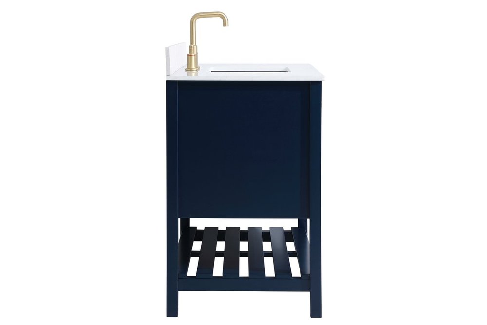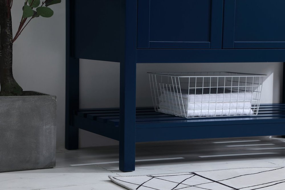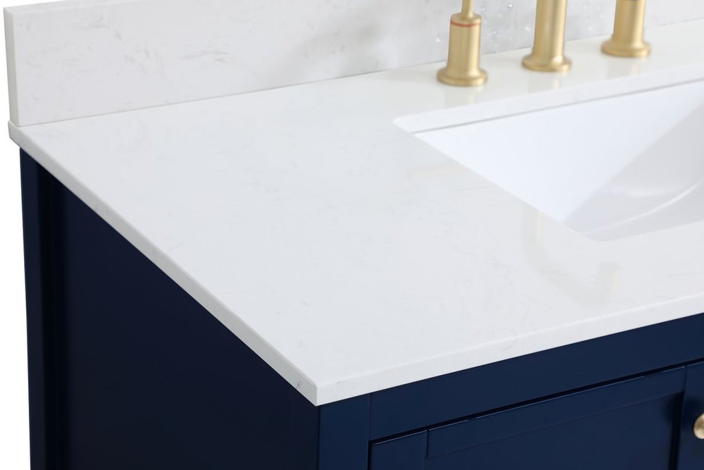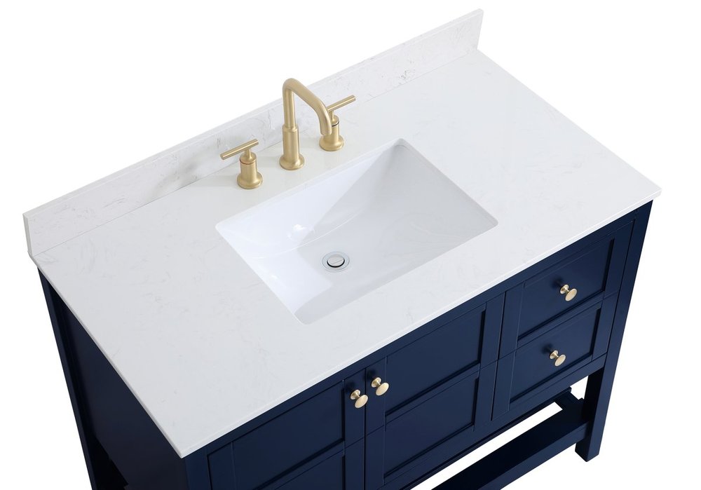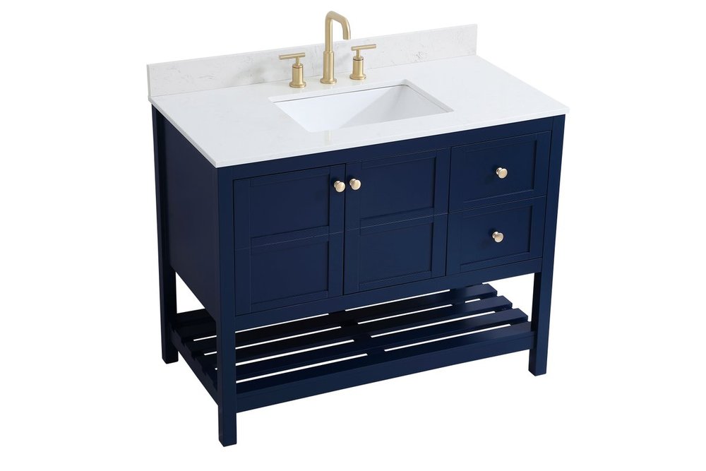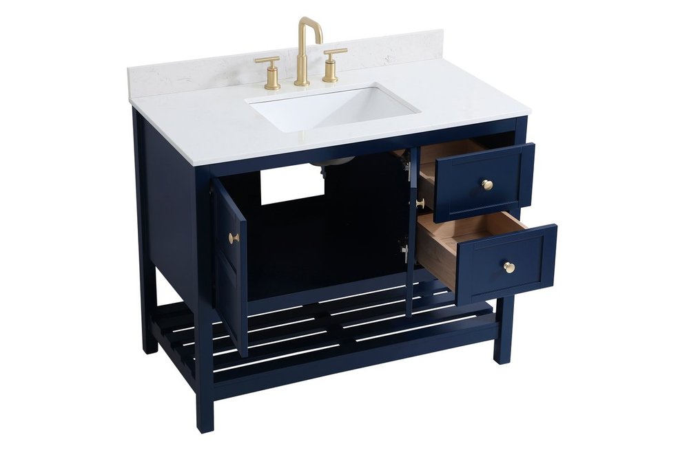 The subtle beauty of the Theo collection 42" vanity in a blue finish exudes comfortable luxury. Its modern, yet traditional beauty will surely dress up your bathroom or powder room without any fuss. The white stone countertop and porcelain undermount sink shows quiet opulence, and the legs support upright without fail. Gold hardware complements the trendy blue finish, with pulls adorning the two cabinet doors and two drawers, showcasing ample storage space within. Slated shelf allows for additional space to organize your towels. Whether this vanity is in your bathroom or for guests, its presence will surely elevate the aesthetics of your room. Comes with a matching backsplash to complete the look and protects your wall.