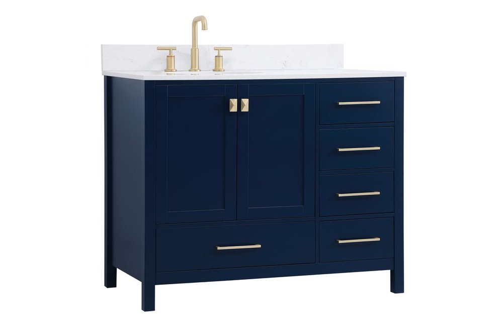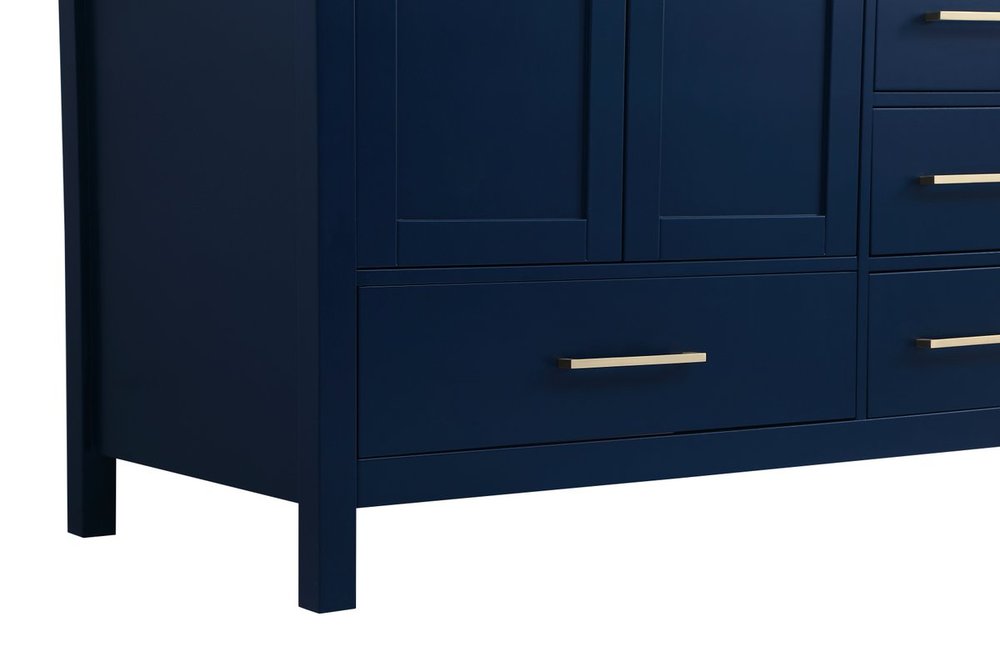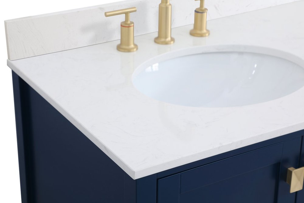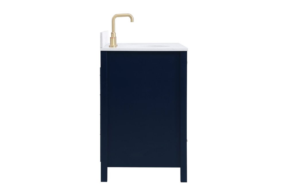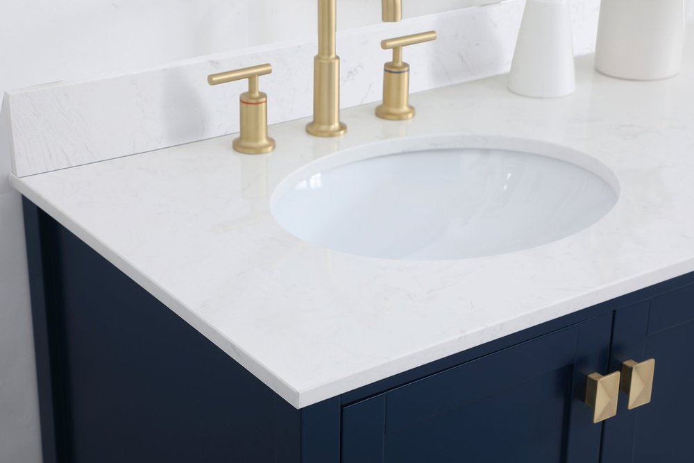Never compromise beauty--the Irene collection stunning vanity in a blue finish will add lovely sophistication and complement any bathroom or powder room, while utilizing its charm and function to provide you with ample storage spaces. Satin gold pulls gently adorn the minimalist cabinet doors and drawers at the base, allowing for you to store away your bathroom essentials. The calacatta engineered marble countertop, porcelain undermount sink, dignified subtle engravings on the side edges, and squared legs all come together to create contemporary beauty. Work with your space, and design a beautiful room, no matter the size. Comes with a matching backsplash to complete the look and protects your wall.