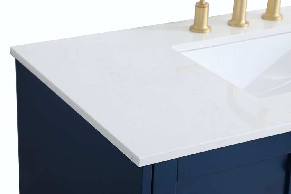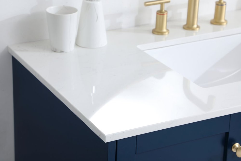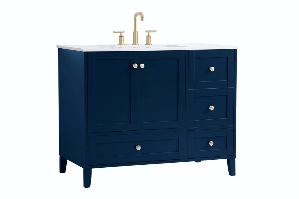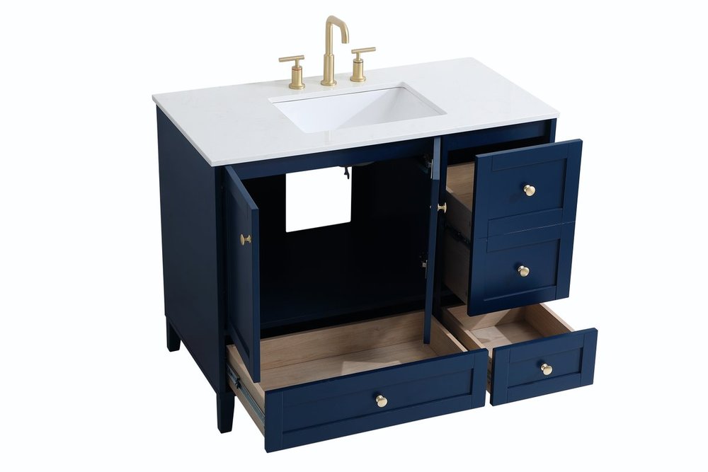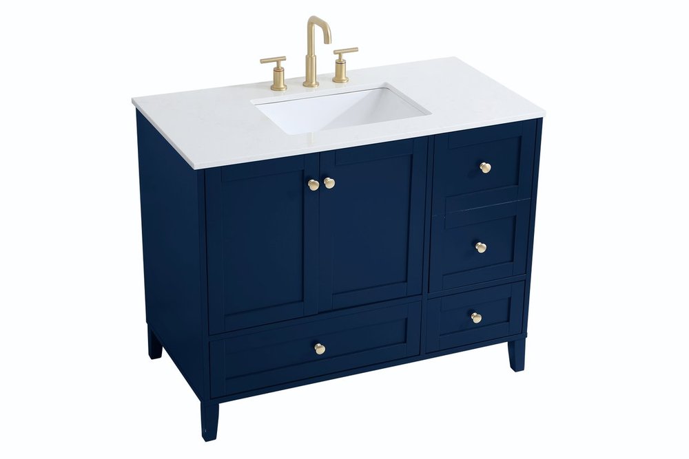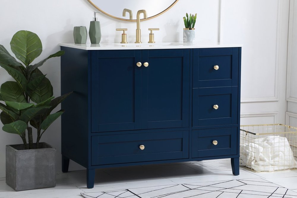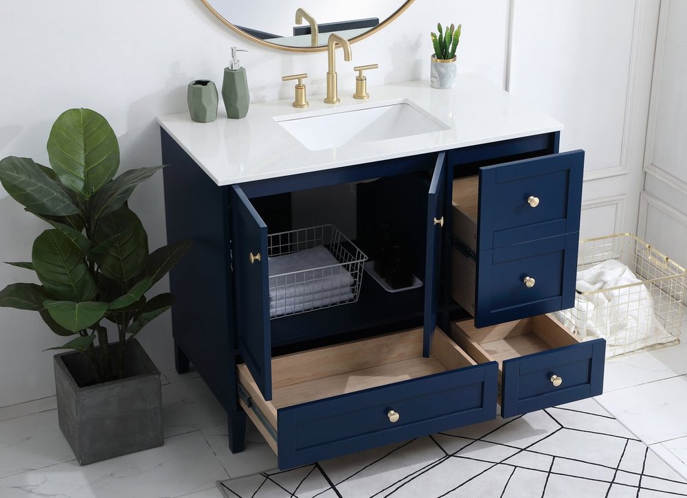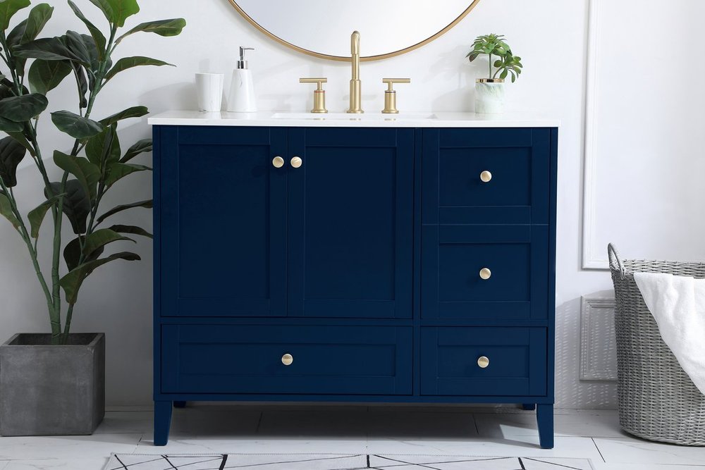 While unassuming, this 42" vanity in a Blue finish sure knows how to redefine luxury. The sleek gold knobs adorn the double cabinet doors and 3 drawers which allow you to store your bathroom toiletries and necessities. Standing strong on oblique legs and dressed with a Calacatta engineered marble countertop, this vanity will surely create beauty and casual elegance in your bathroom or powder room.