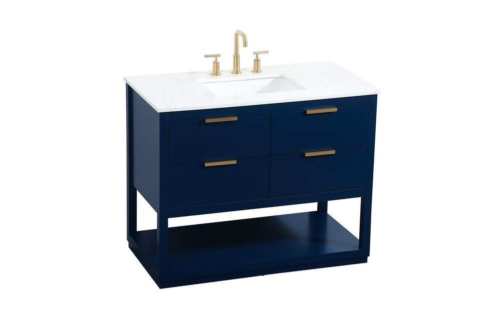Live in modern comfort with this 42" blue finish vanity. Dressed in a blue and sleek gold metal hardware, its contemporary style will have your bathroom or powder room elevated in modern sophistication. The open shelf at the base and four drawers reveal ample storage space for your bathroom essentials and miscellany. Clean lines create its own visual interest, adding trendy looks to your already chic room.