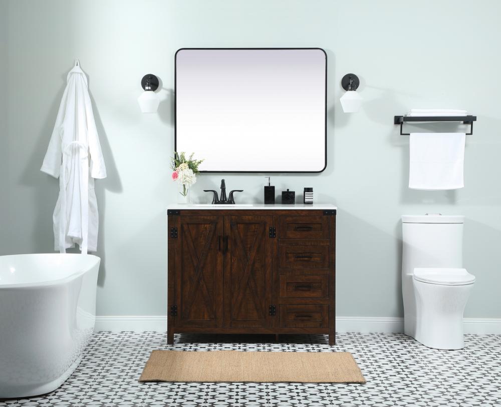 Reminiscent of barn doors, the two door cabinet and four drawers adds both stylistic charm and function with its plethora of storage options for all your bathroom essentials. Whether for your bathroom or the guests', everyone will marvel at its classic look for traditional and farmhouse aesthetics. A slab of engineered marble rounds out the piece up top, as well as the porcelain under mount sink and predrilled faucet holes. This vanity arrives fully assembled.