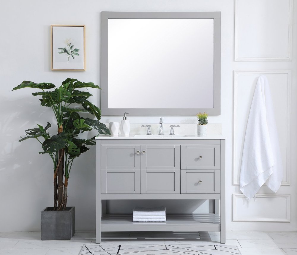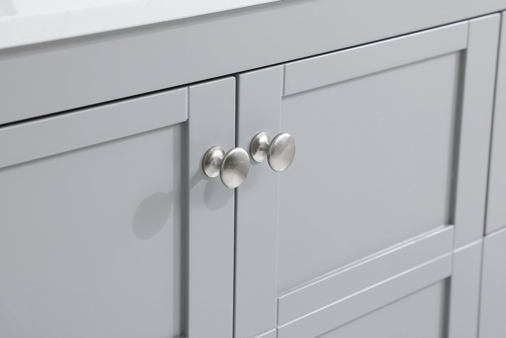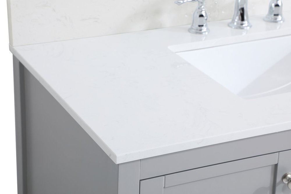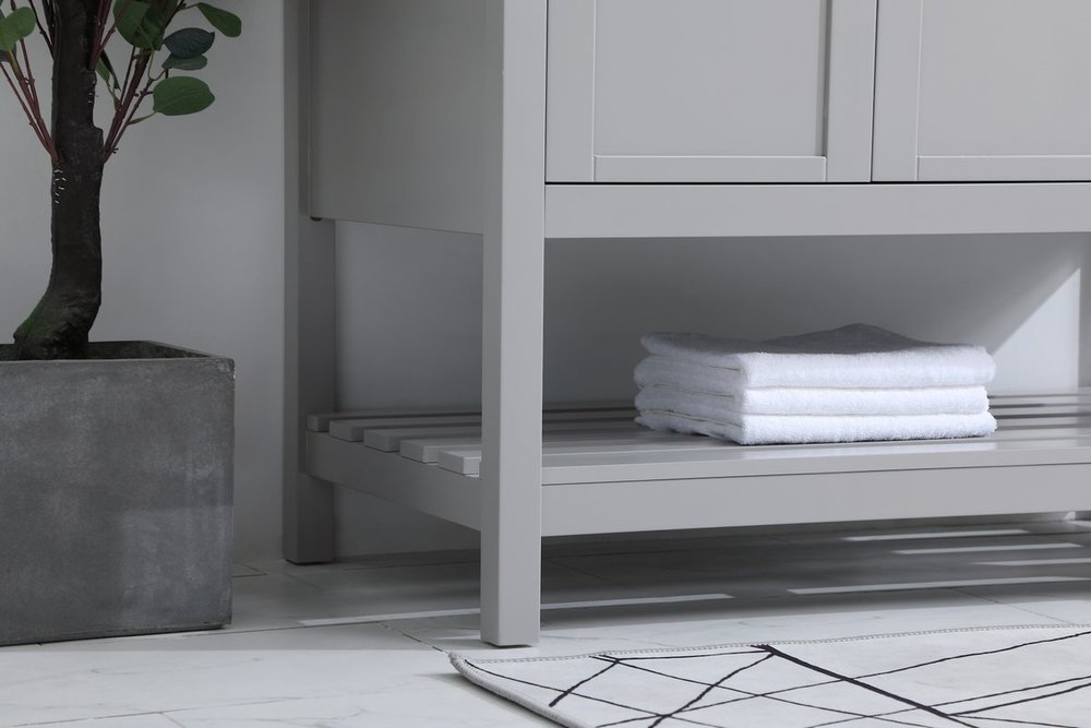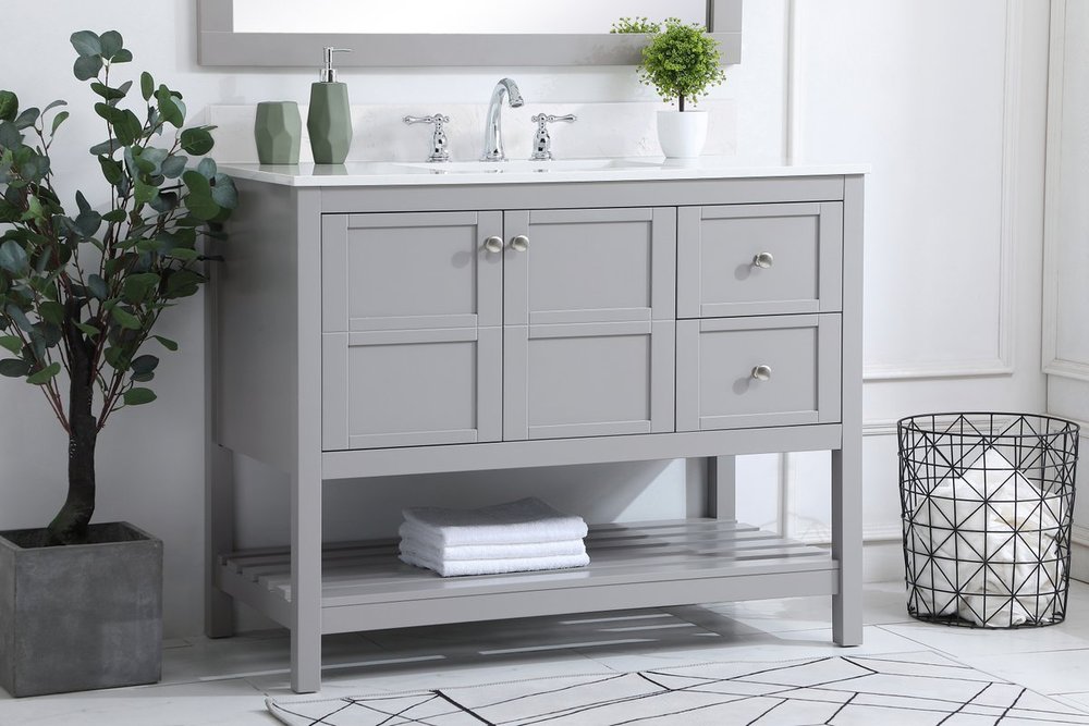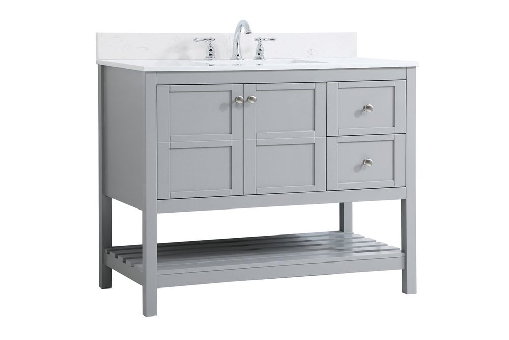 The subtle beauty of the Theo collection 42" vanity in a gray finish exudes comfortable luxury. Its modern, yet traditional beauty will surely dress up your bathroom or powder room without any fuss. The white stone countertop and porcelain undermount sink shows quiet opulence, and the legs support upright without fail. Brushed Nickel hardware complements the trendy gray finish, with pulls adorning the two cabinet doors and two drawers, showcasing ample storage space within. Slated shelf allows for additional space to organize your towels. Whether this vanity is in your bathroom or for guests, its presence will surely elevate the aesthetics of your room. Comes with a matching backsplash to complete the look and protects your wall.
