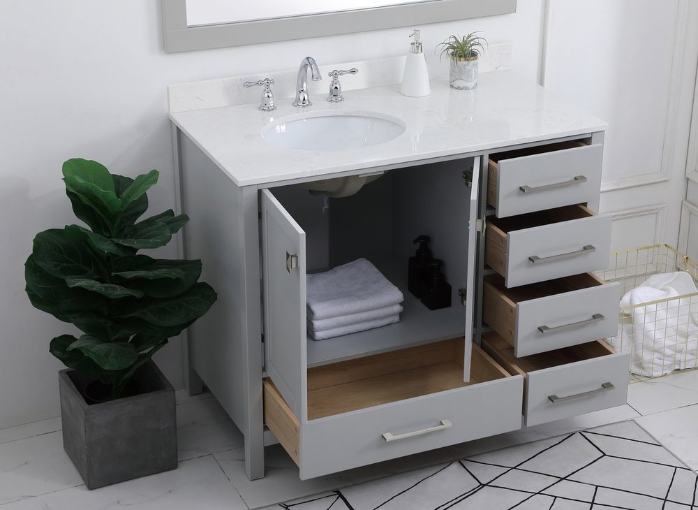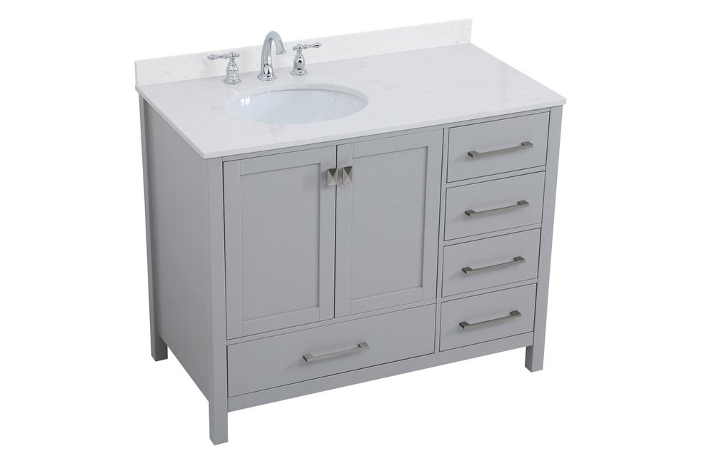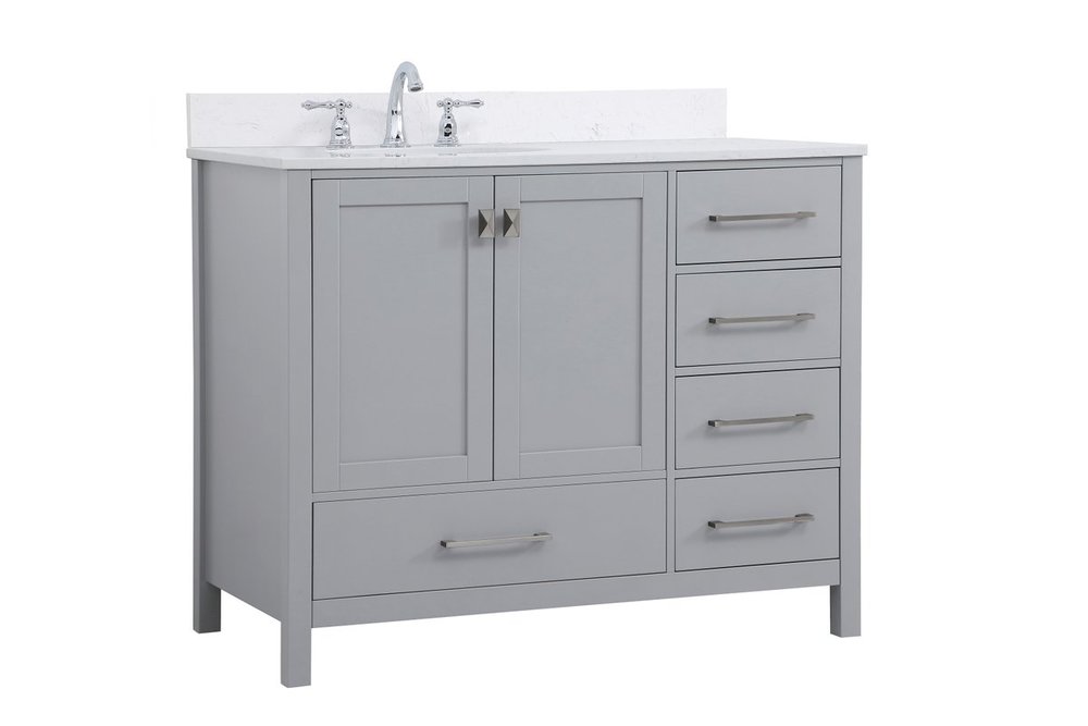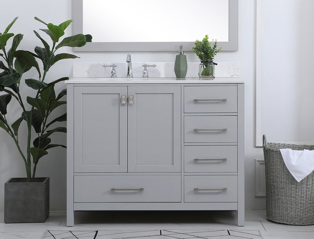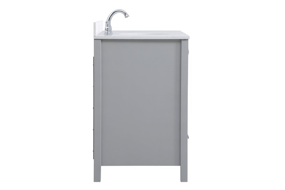 Never compromise beauty--the Irene collection stunning vanity in a gray finish will add lovely sophistication and complement any bathroom or powder room, while utilizing its charm and function to provide you with ample storage spaces. Brushed nickel pulls gently adorn the minimalist cabinet doors and drawers at the base, allowing for you to store away your bathroom essentials. The calacatta engineered marble countertop, porcelain undermount sink, dignified subtle engravings on the side edges, and squared legs all come together to create contemporary beauty. Work with your space, and design a beautiful room, no matter the size. Comes with a matching backsplash to complete the look and protects your wall.