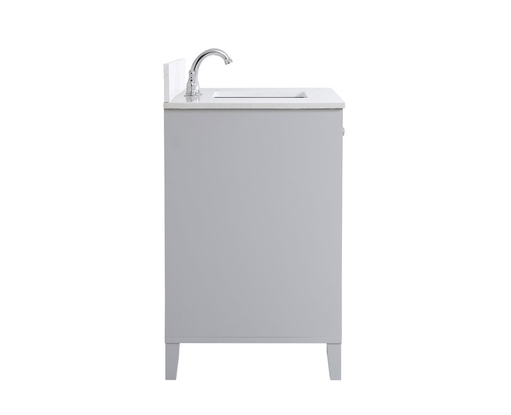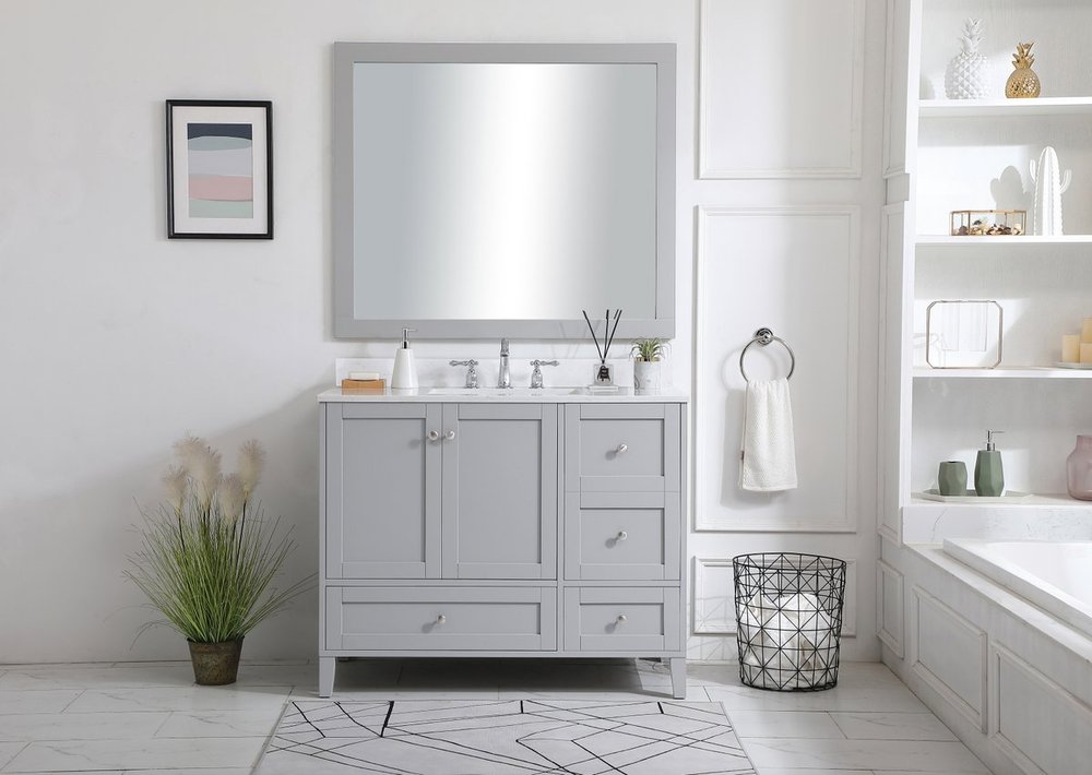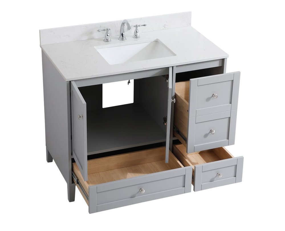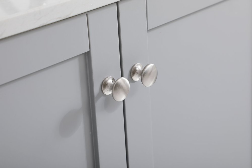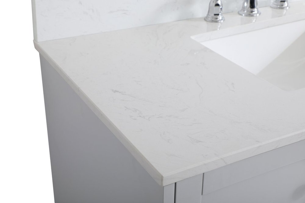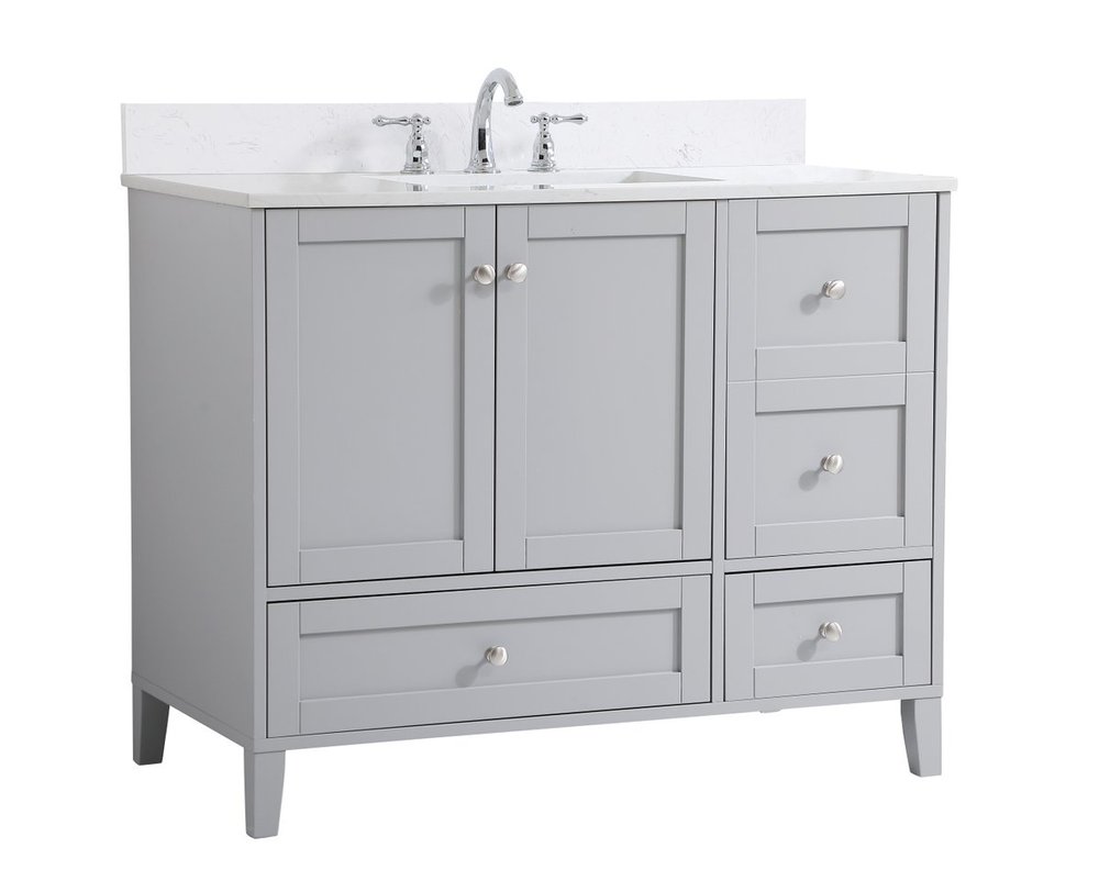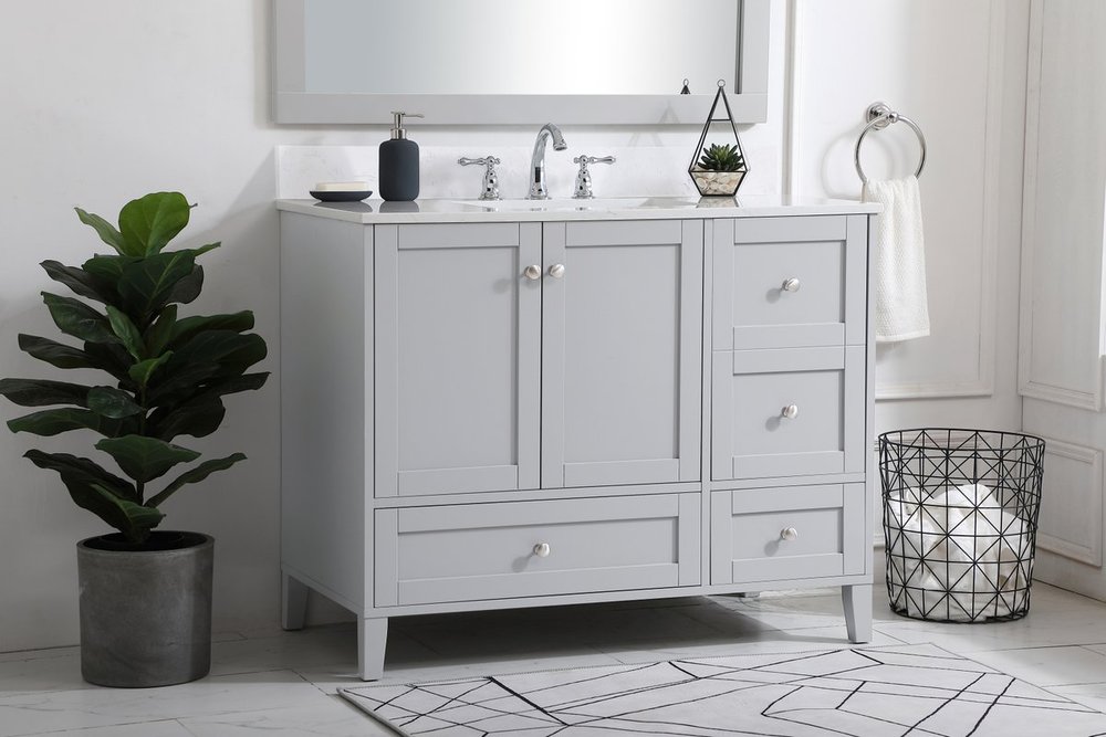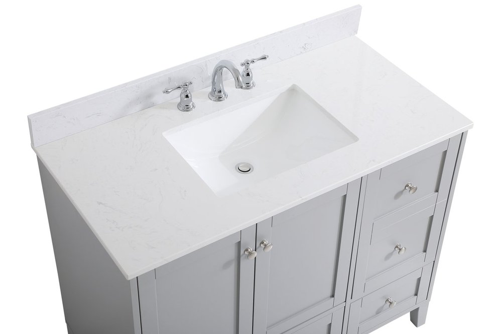 While unassuming, this 42" vanity in a grey finish sure knows how to redefine luxury. The sleek brushed nickel knobs adorn the double cabinet doors and 3 drawers which allow you to store your bathroom toiletries and necessities. Standing strong on oblique legs and dressed with a Calacatta engineered marble countertop, this vanity will surely create beauty and casual elegance in your bathroom or powder room. Comes with a matching backsplash to complete the look and protects your wall.