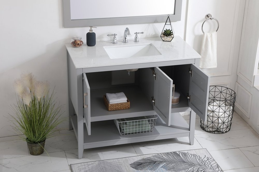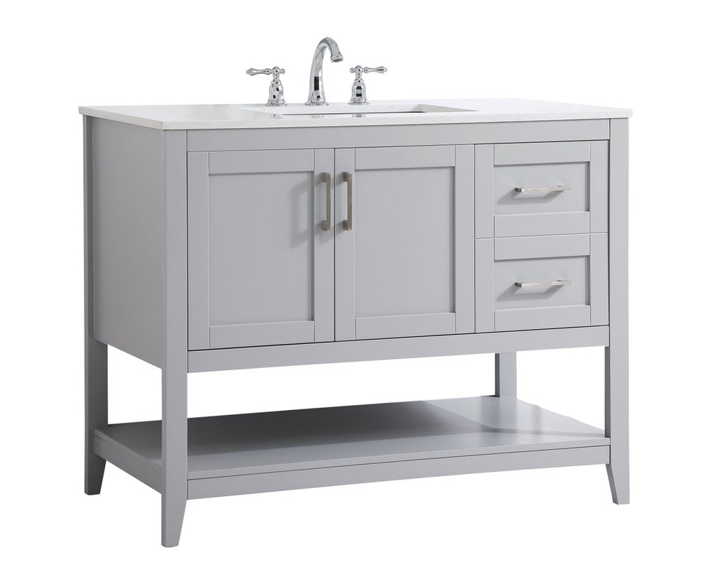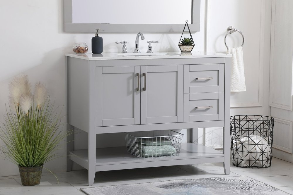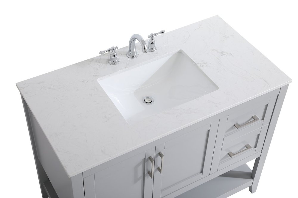 The nonchalant attitude of this 42" traditional grey finish vanity will have you wanting more. The slender brushed nickel handle bars open the 3 cabinet doors to reveal ample storage space to put away and store bathroom essentials, and the open space below allows for you to place clean towels on the rack. Topped with a Calacatta engineered marble countertop, you and your guests will enjoy this easy going vanity.