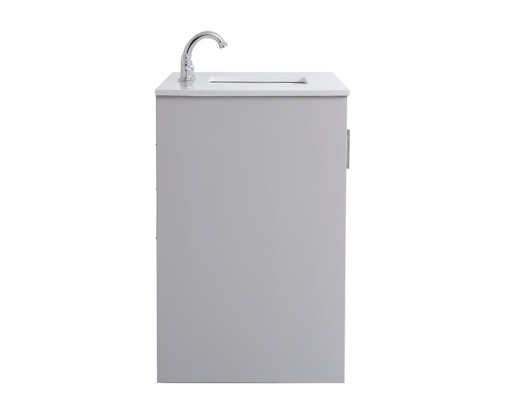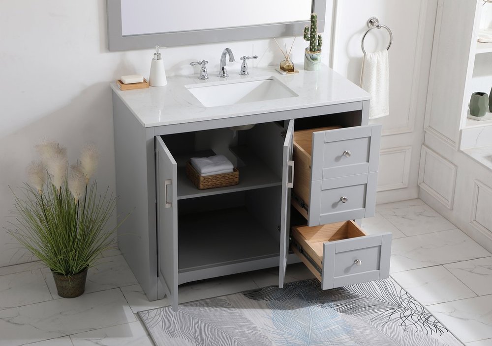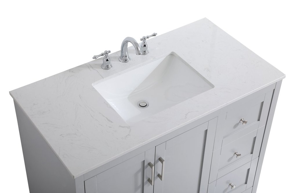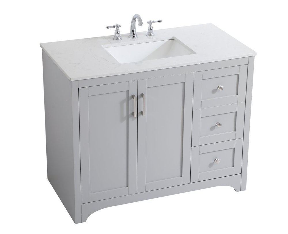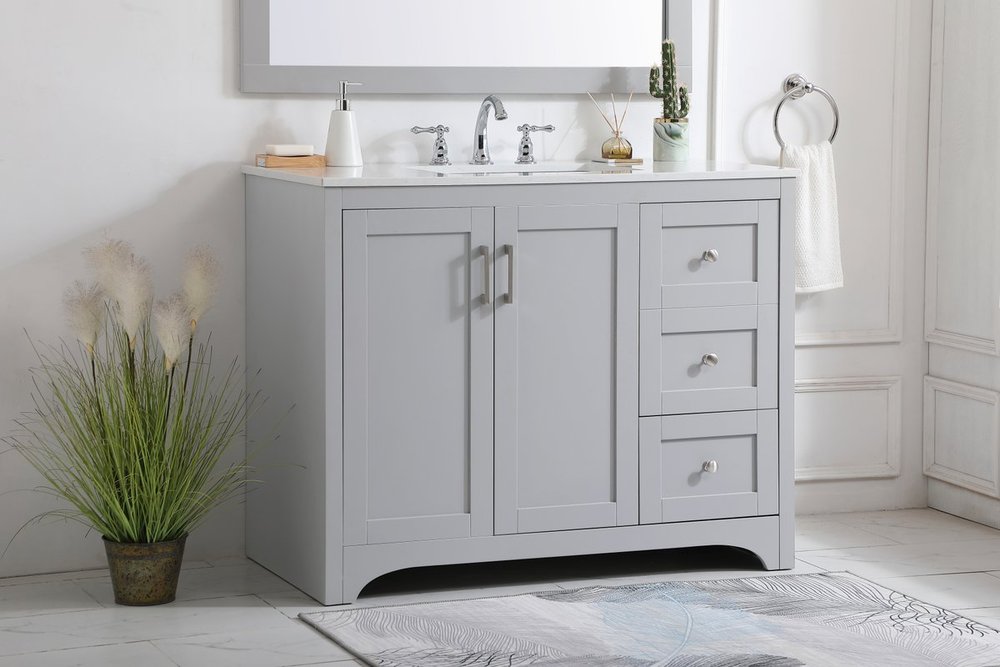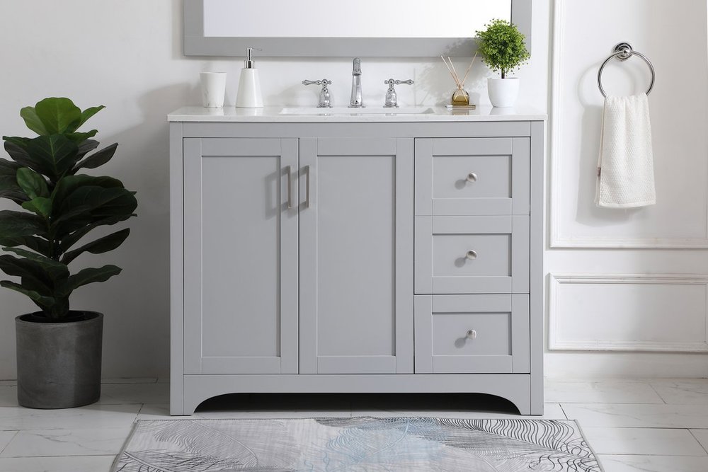 The refined simplicity of this 42" grey finish vanity creates a peaceful, yet stylish, atmosphere. Its traditional modernity adds a mature beauty that will elevate any bathroom or powder room--the Calacatta engineered marble counter top adds refined luxe while the brushed nickel handle bars open the double cabinet doors and 2 side drawers, revealing ample storage space to store and hide away an assortment of bathroom essentials. Whether your home is large or small, this vanity will surely fit in well.
