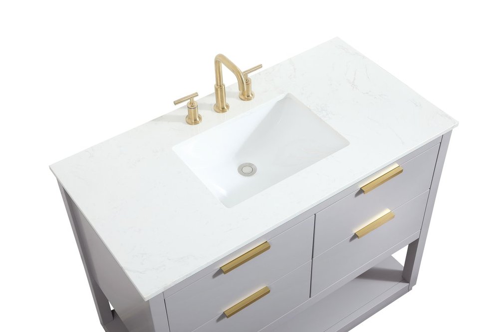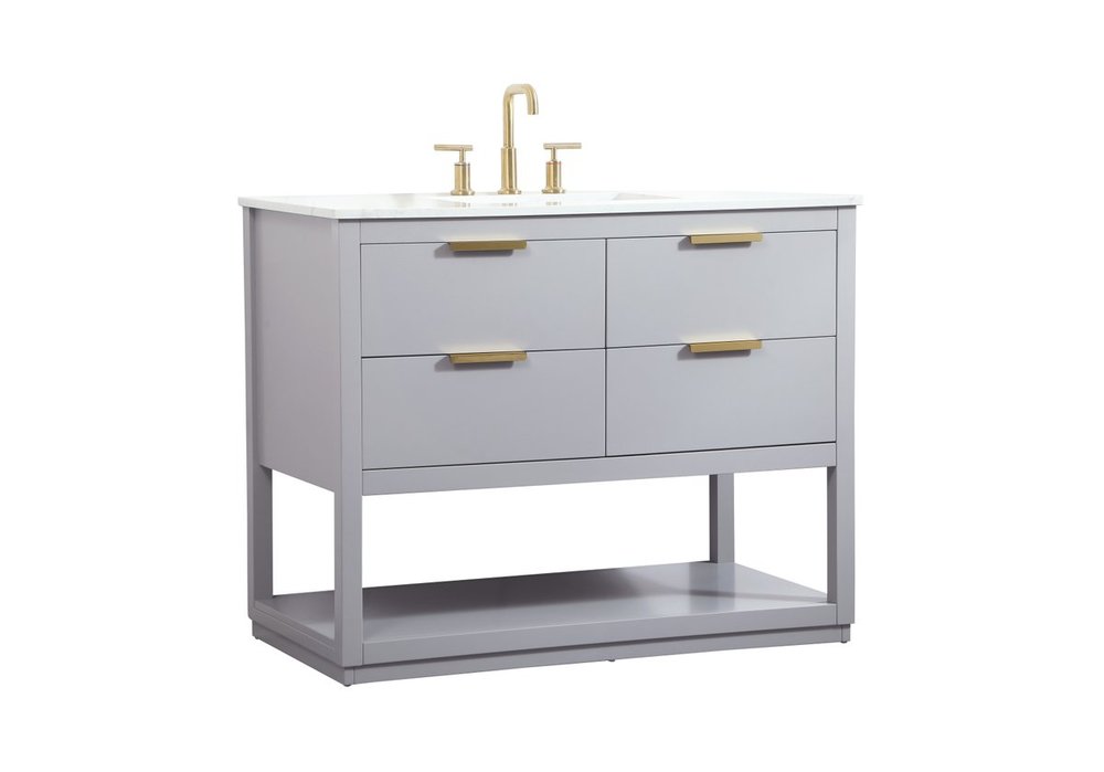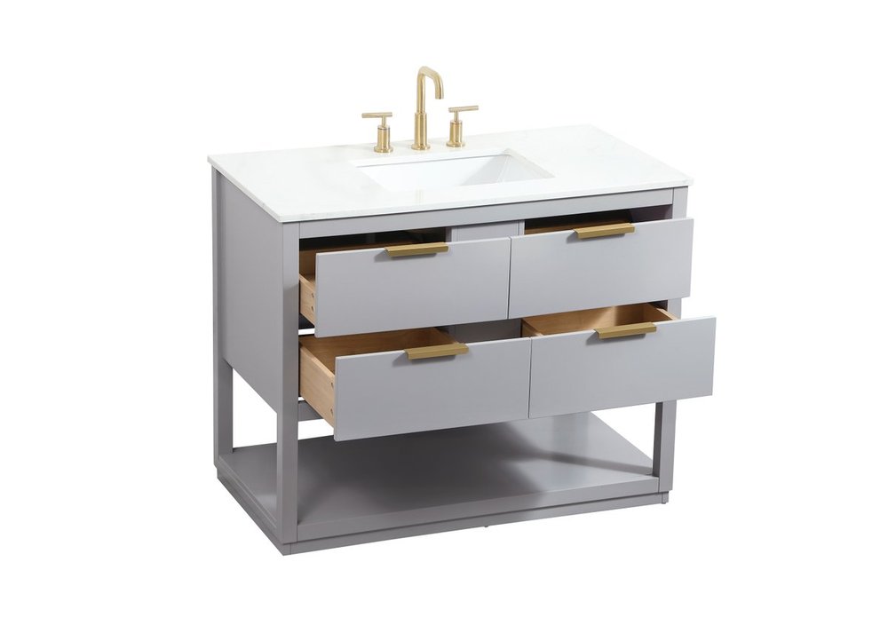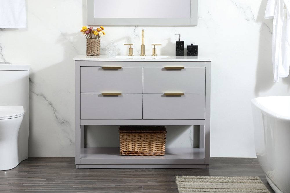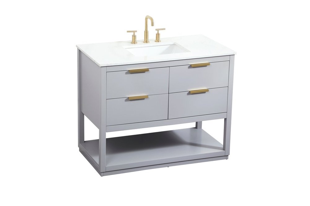 Live in modern comfort with this 42" gray finish vanity. Dressed in a gray and sleek gold metal hardware, its contemporary style will have your bathroom or powder room elevated in modern sophistication. The open shelf at the base and four drawers reveal ample storage space for your bathroom essentials and miscellany. Clean lines create its own visual interest, adding trendy looks to your already chic room.