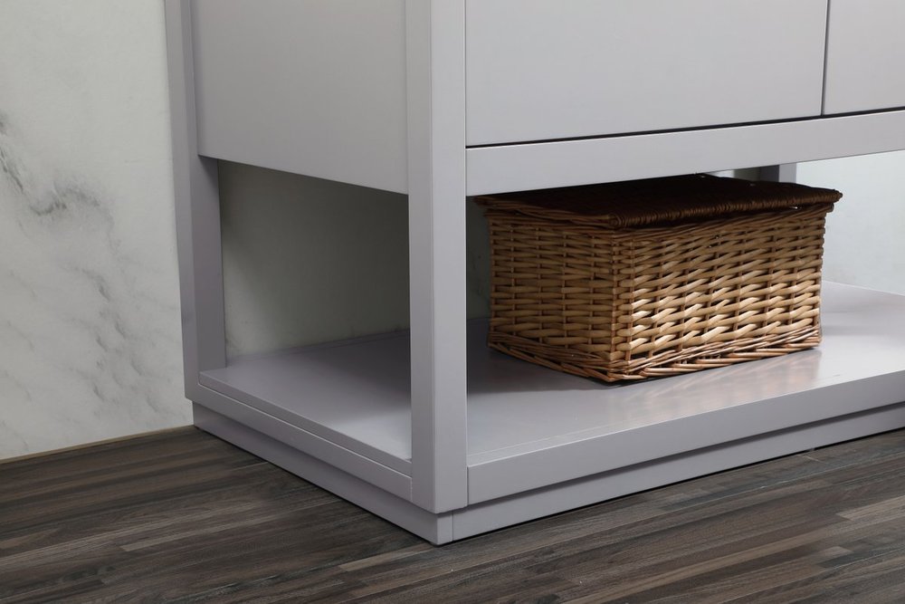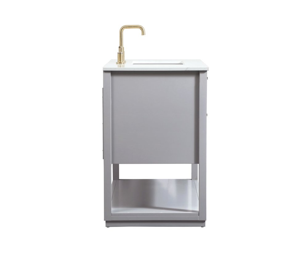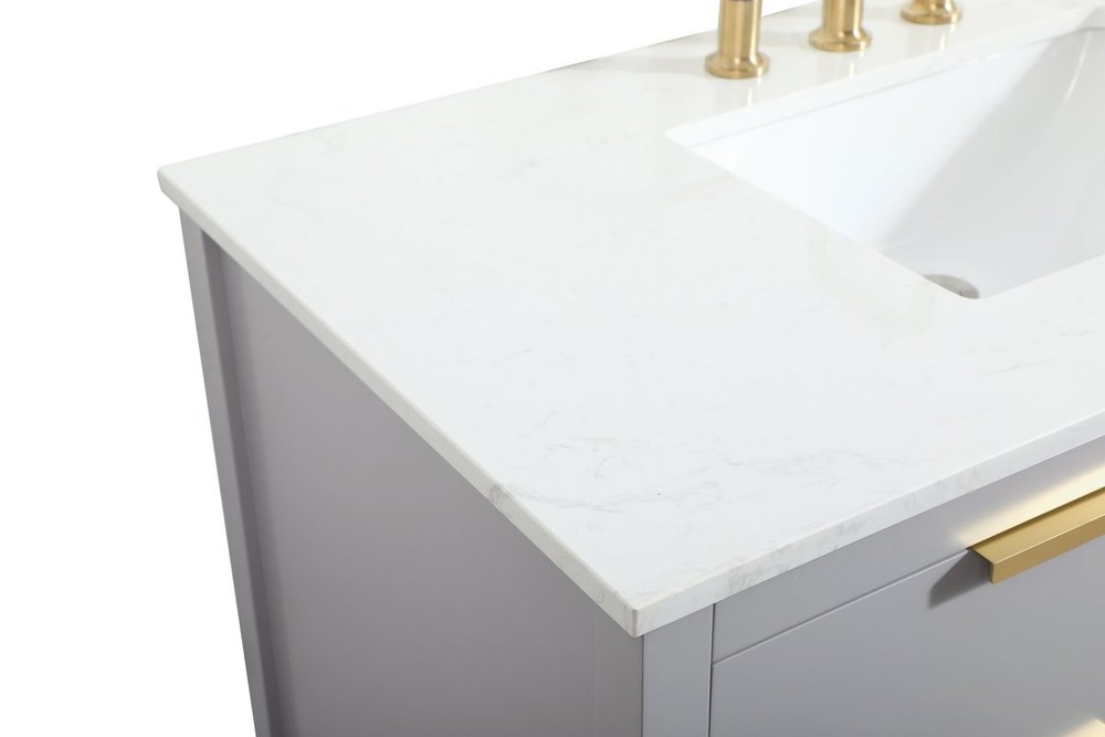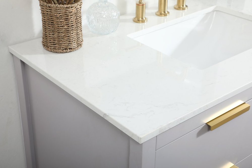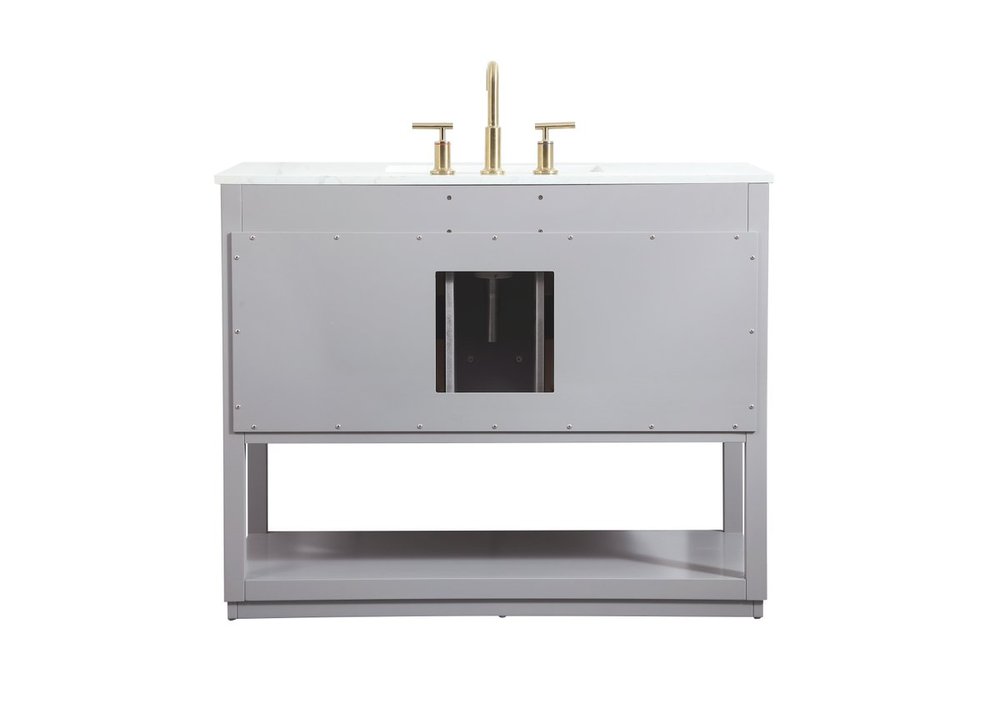 Live in modern comfort with this 42" gray finish vanity. Dressed in a gray and sleek gold metal hardware, its contemporary style will have your bathroom or powder room elevated in modern sophistication. The open shelf at the base and four drawers reveal ample storage space for your bathroom essentials and miscellany. Clean lines create its own visual interest, adding trendy looks to your already chic room.