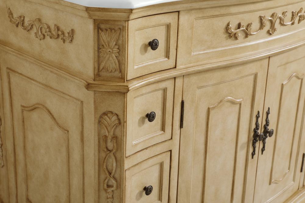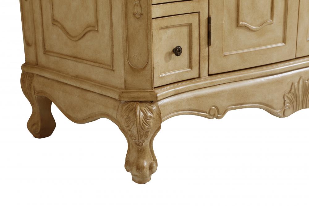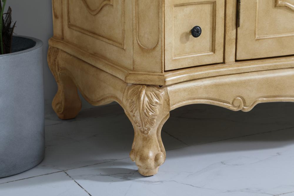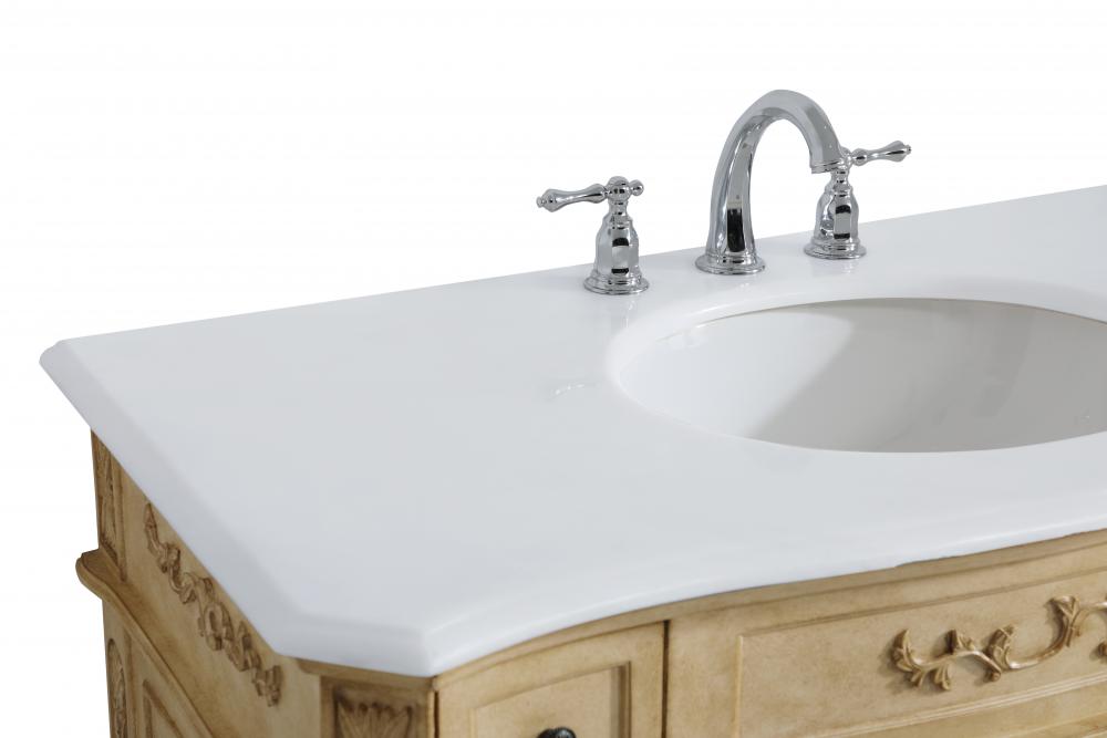 This superb balance of timeless tradition and opulent beauty in a engineered marble-topped vanity will certainly enhance the aesthetics of any home or office bathroom! Featuring an ivory white durable engineered marble countertop complimenting the hand painted cabinet with a delicate carved floral design, stands on stylishly carved solid wood French scroll feet. Don't let the design fool you, the engineered marble countertop and porcelain undermount sink allows for space to get ready, while the antique bronze hardware allows you to discover storage spaces with ease. You and your guests will marvel at this vanity that will both store away your bathroom essentials and enhance the aesthetics of your room.