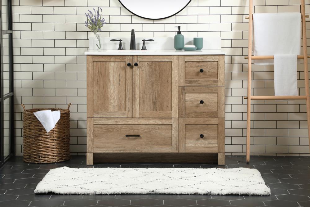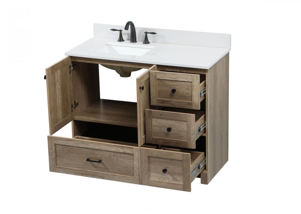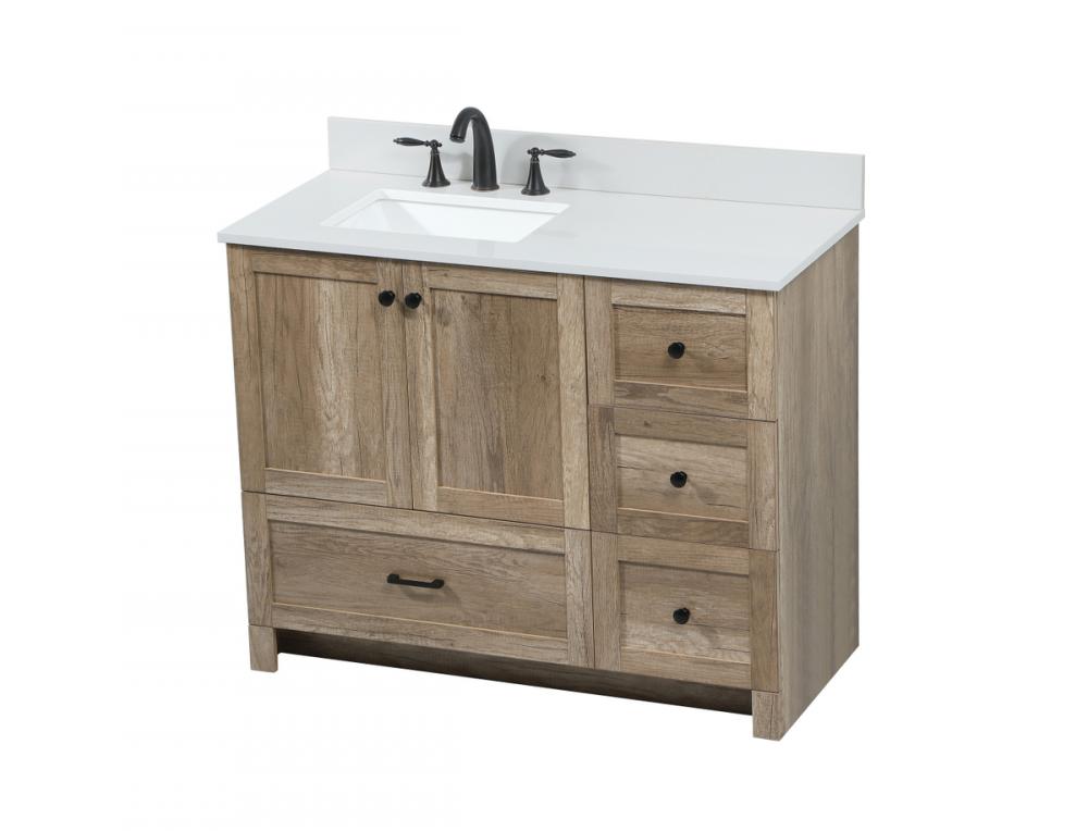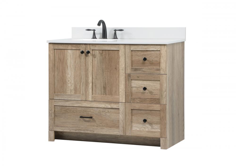 Delve into a world of minimalistic fashion and contemporary styling with this farmhouse 42" vanity. The clean faux lines anchors the weathered design. Black handle adorns the two doors hiding the base of the integrated porcelain sink while the bottom drawer and side drawers allow you to store your bathroom necessities and toiletries. It is the perfect vanity for any bathroom, regardless of size. Comes with a matching backsplash to complete the look and protects your wall.
