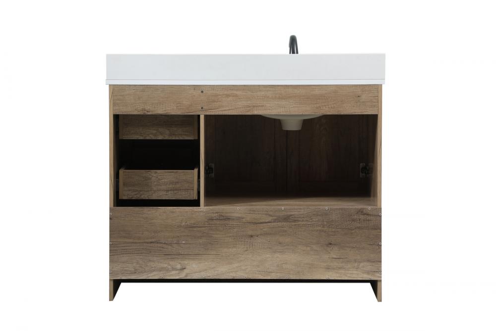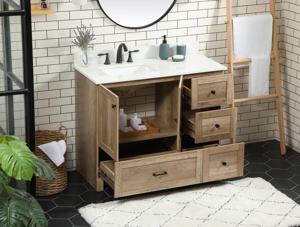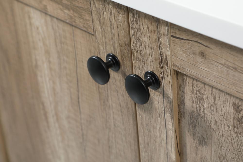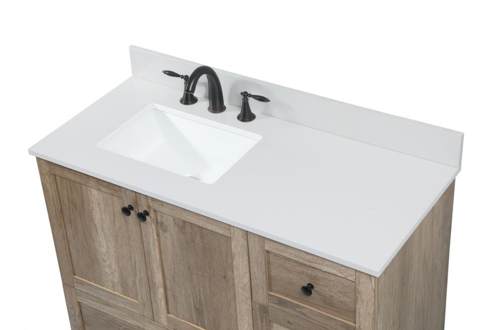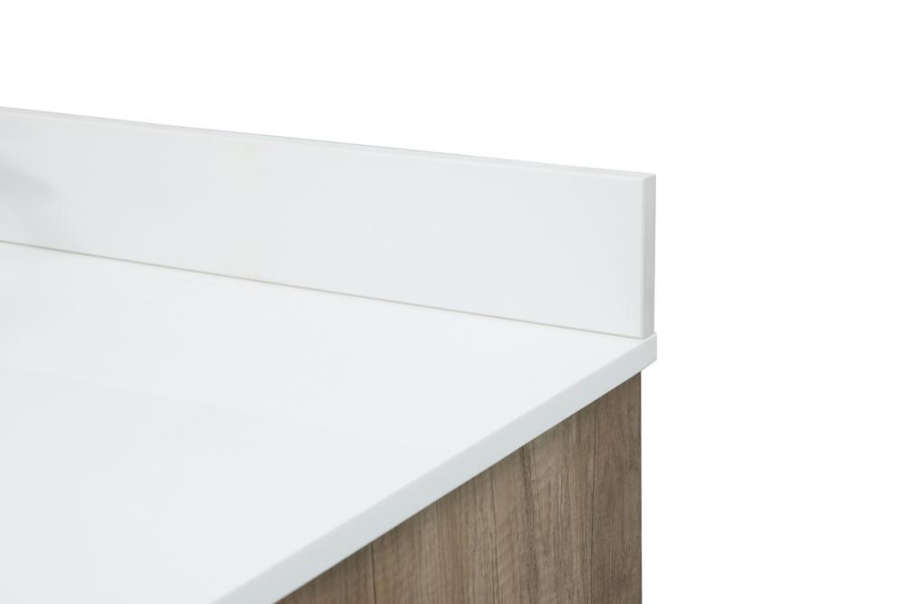 Delve into a world of minimalistic fashion and contemporary styling with this farmhouse 42" vanity. The clean faux lines anchors the weathered design. Black handle adorns the two doors hiding the base of the integrated porcelain sink while the bottom drawer and side drawers allow you to store your bathroom necessities and toiletries. It is the perfect vanity for any bathroom, regardless of size. Comes with a matching backsplash to complete the look and protects your wall.