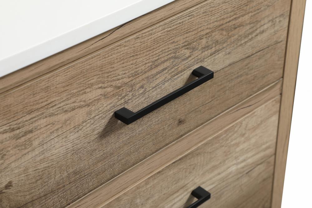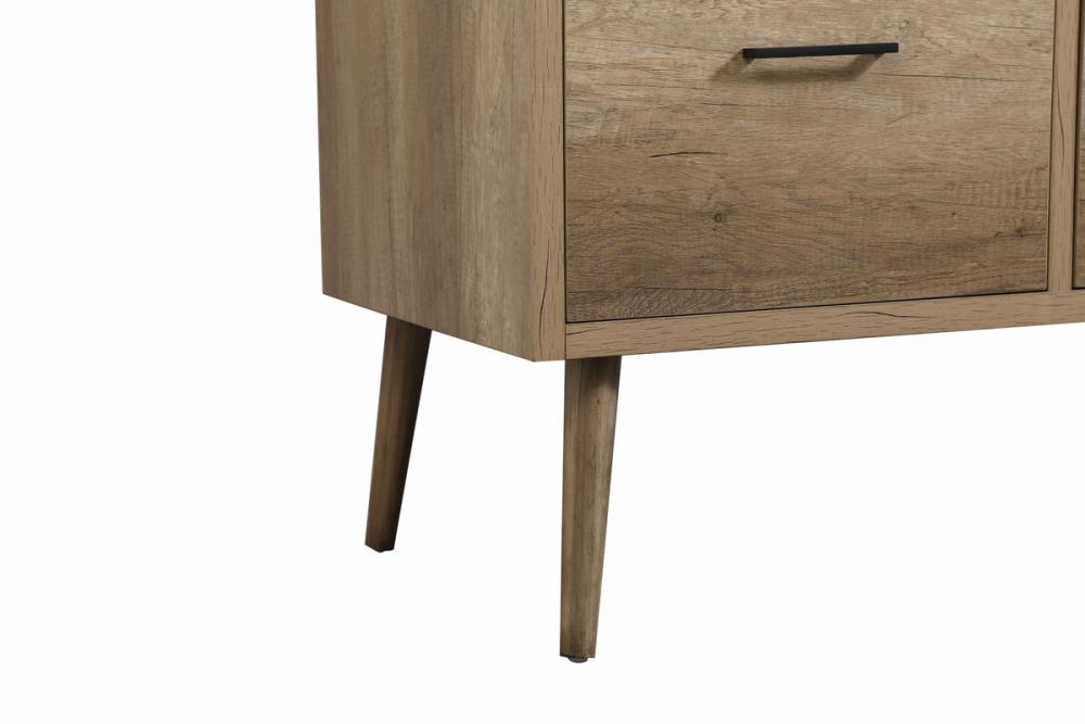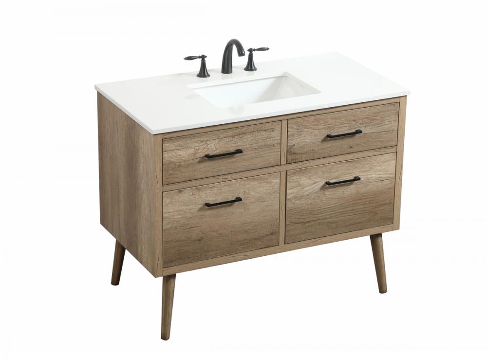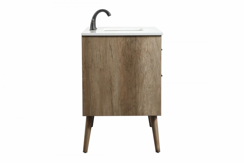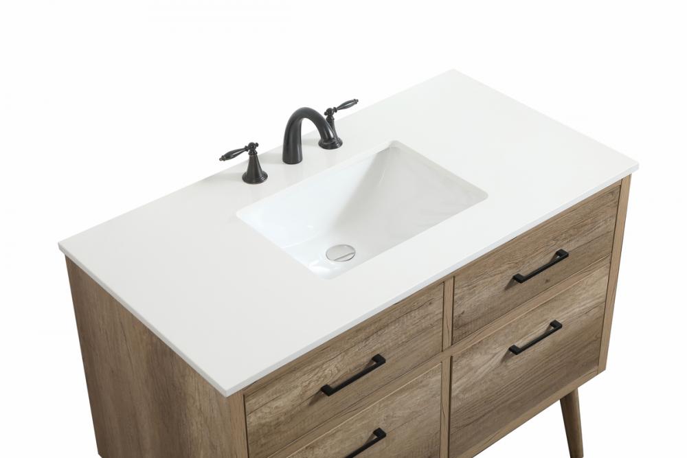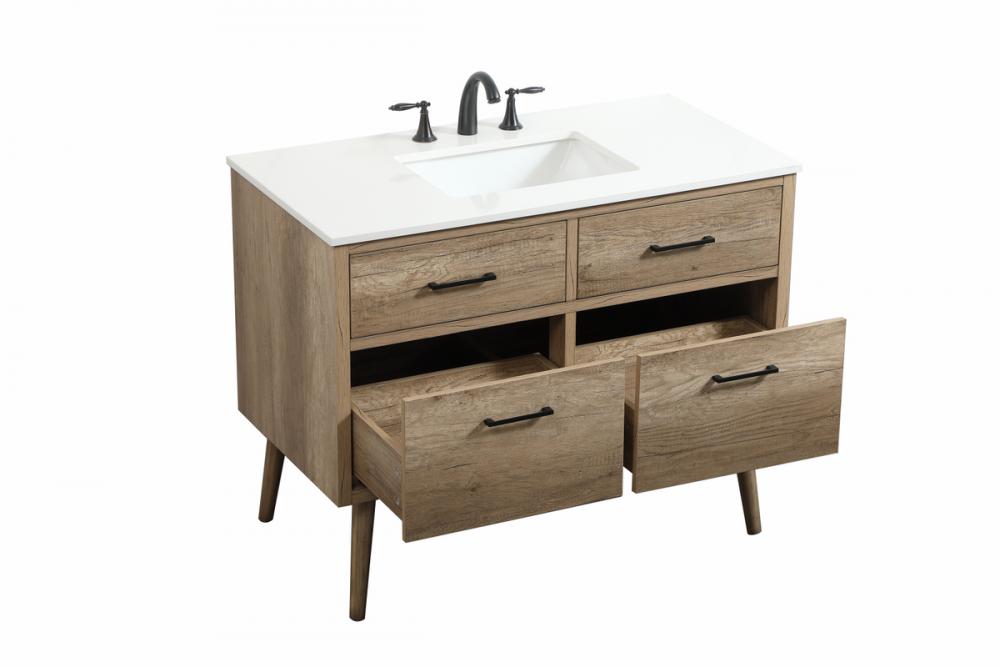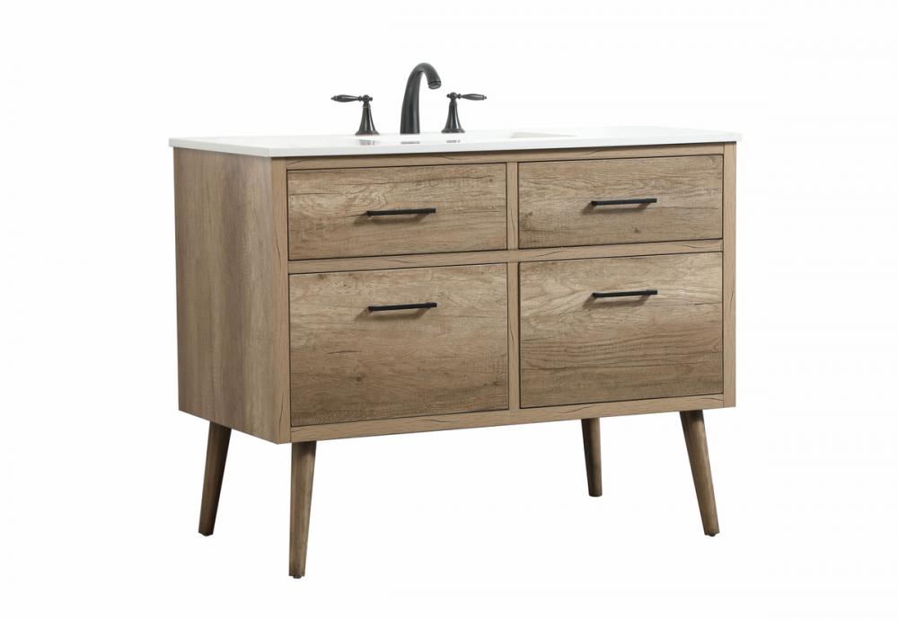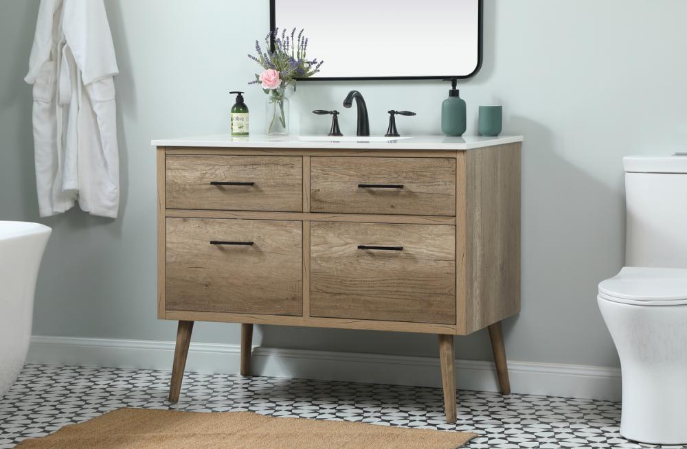 This bathroom vanity is a perfect way to outfit your home in authetic midcentury modern style. The clean lines anchors the design, while the oblique tapered cylinder legs add subtle interest. A black handle adorns the top drawer hiding the base of the undermount porcelain sink while another one allows you to pull the bottom drawer out, letting you store your bathroom necessities and toiletries. The storage drawers provide much needed function and can be used for stowing items like extra toothbrushes, hairbrushes, and other bathroom essentials to help you get ready to face the day. This vanity is a quick update for your bathroom with trendy style.