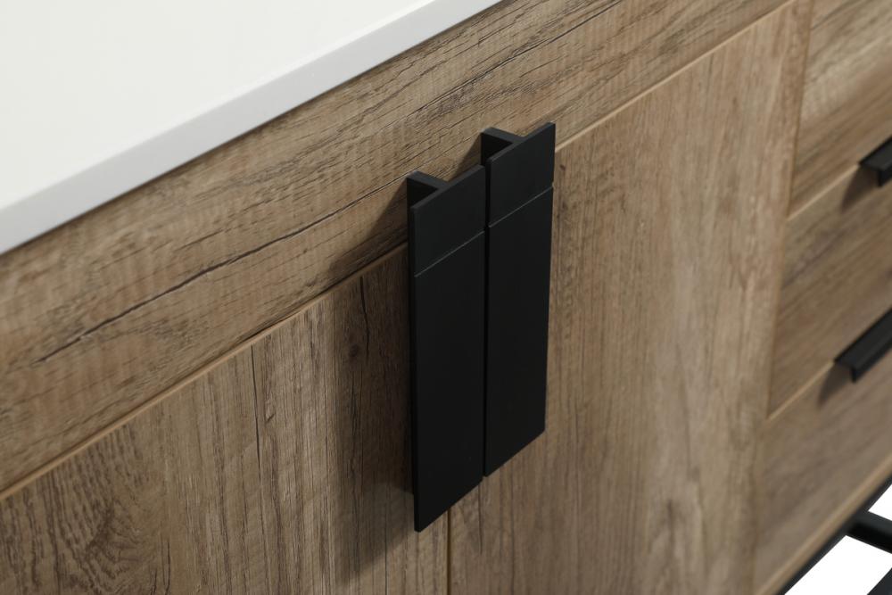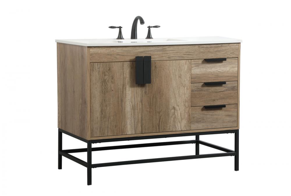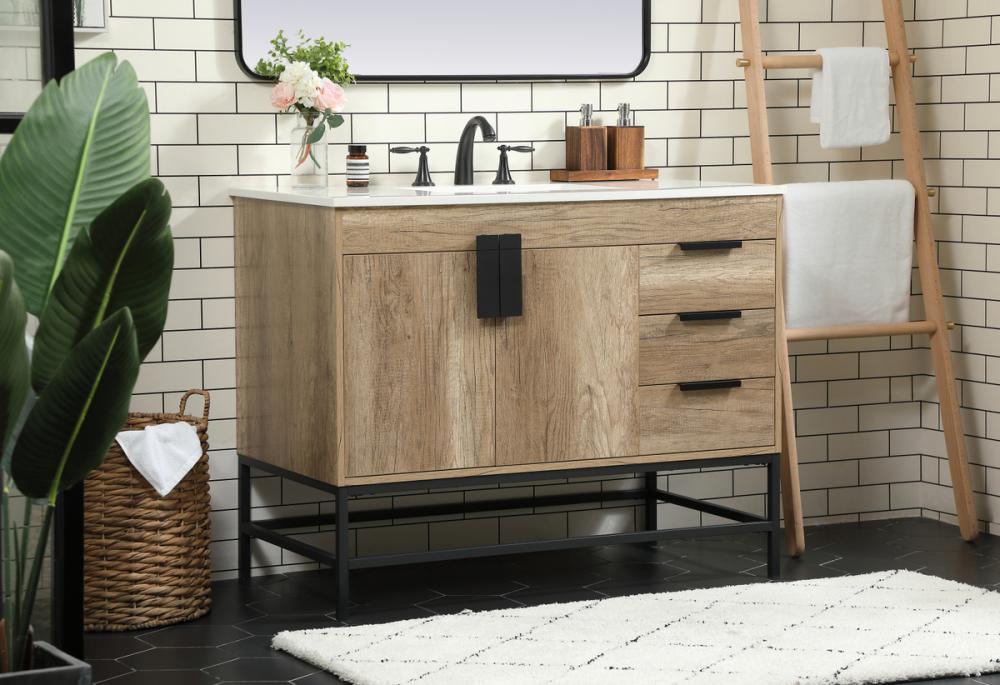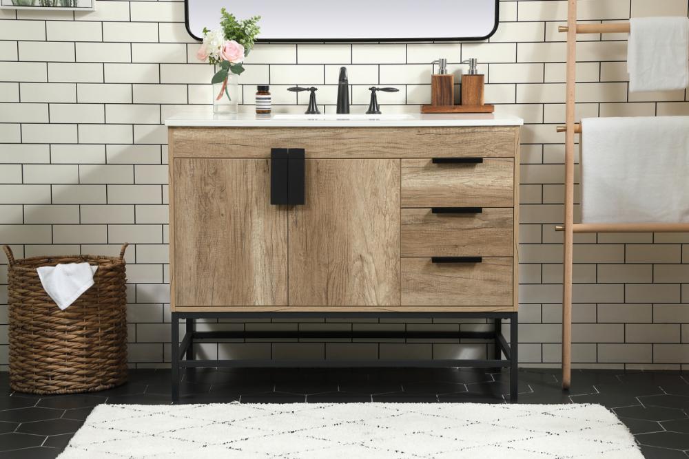 This vanity is a sleek-looking piece of bathroom furniture that is easy to incorporate into your design scheme. The cabinet features a smooth door panel with an oversized steel handle and soft close hinges provide ample room for accessories. Constructed of engineered wood, the powder-coated metal rod legs are an urban industrial look that we love. Minor assembly of the metal legs needed to get this vanity up and running.