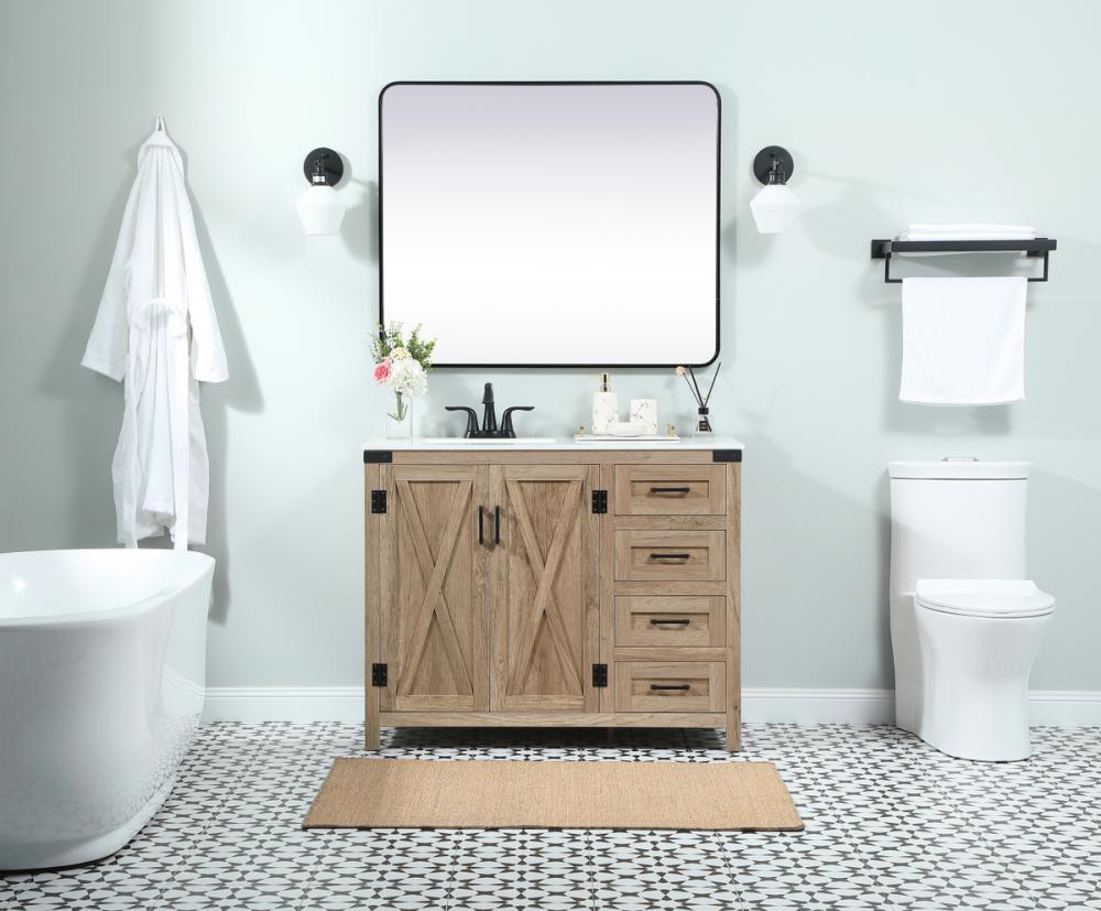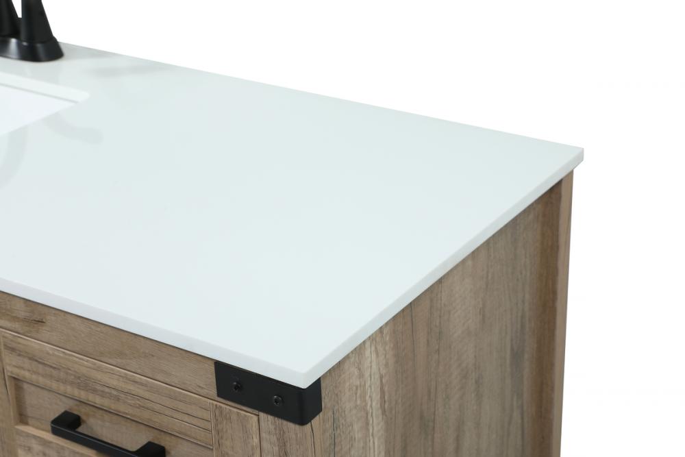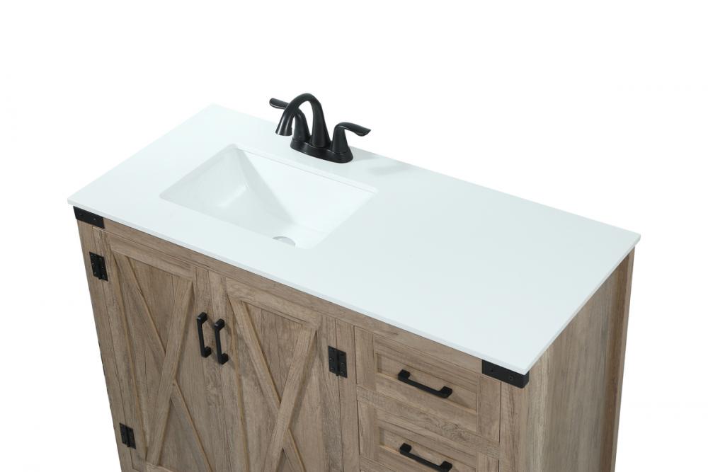Reminiscent of barn doors, the two door cabinet and four drawers adds both stylistic charm and function with its plethora of storage options for all your bathroom essentials. Whether for your bathroom or the guests', everyone will marvel at its classic look for traditional and farmhouse aesthetics. A slab of engineered marble rounds out the piece up top, as well as the porcelain under mount sink and predrilled faucet holes. This vanity arrives fully assembled.