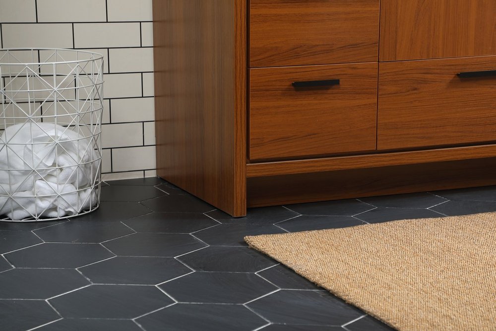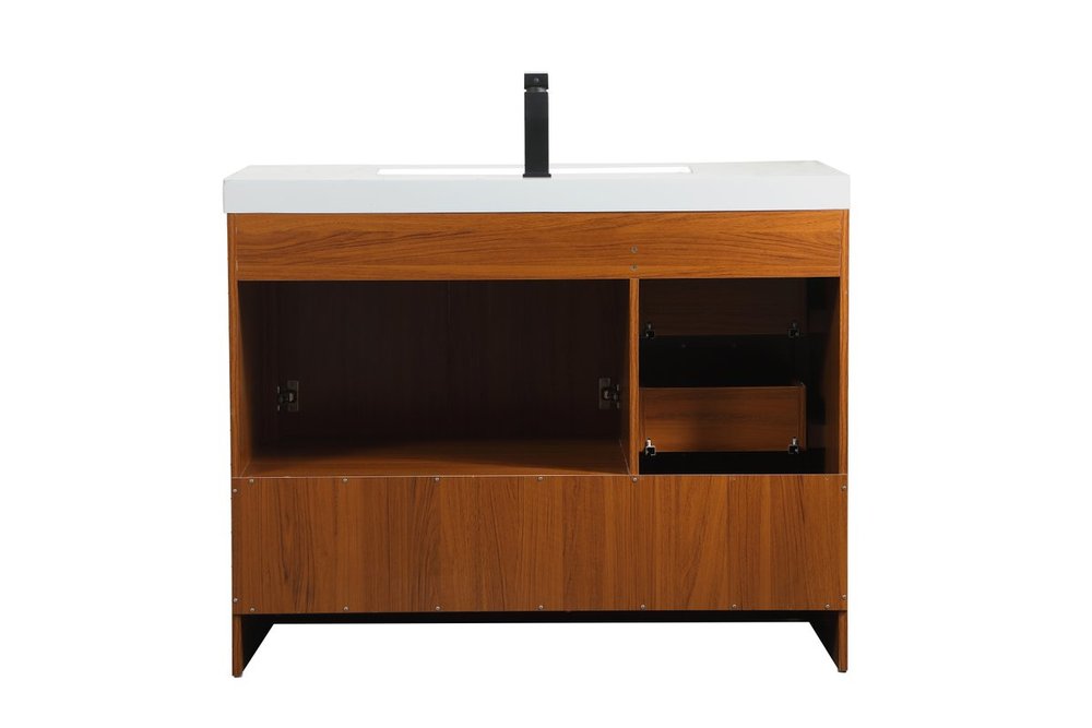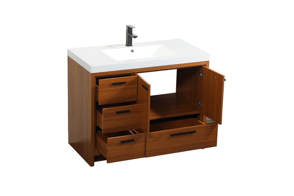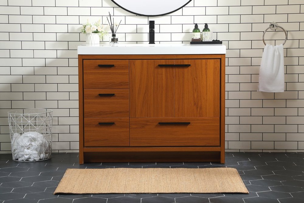 Modern sophistication is defined within the teak finish and black barpulls of this vanity. Its length makes it the perfect addition to any sized home, and saves space with its storage area hidden behind the double cabinet doors and one bottom drawers. Topped with a highly durable resin white counter top and an integrated sink, this modern design will add everlasting class to your bathroom and powder room.