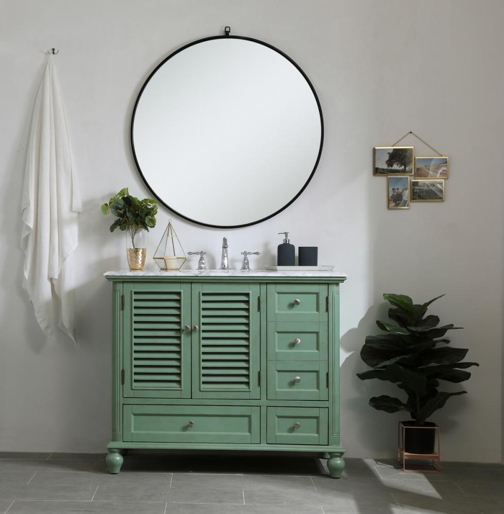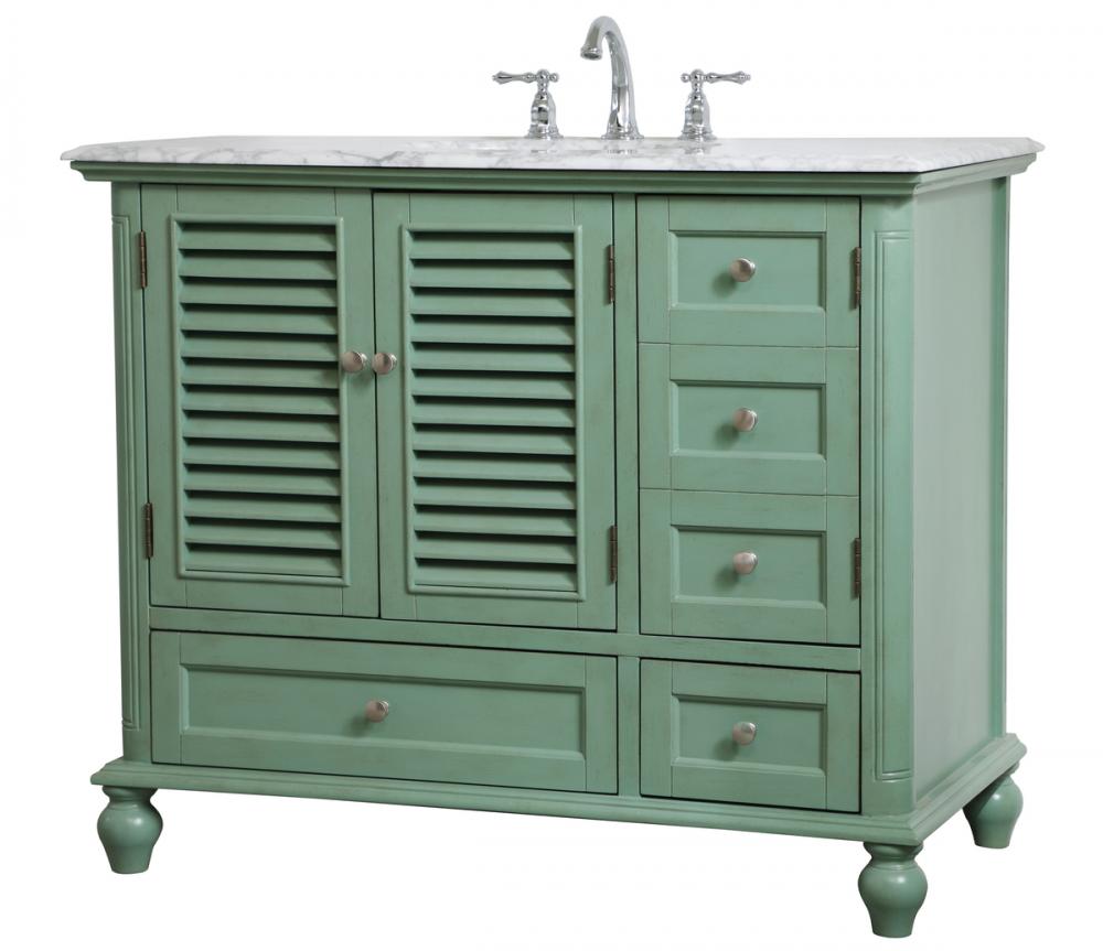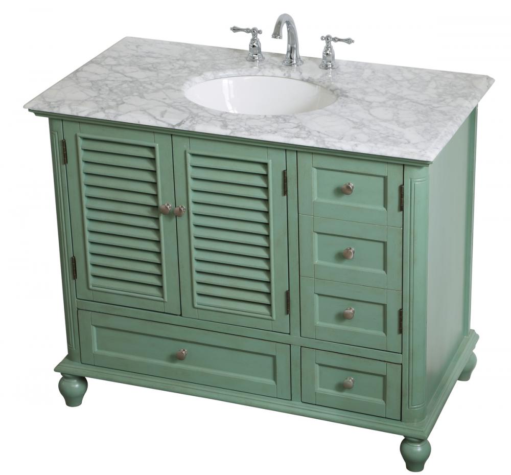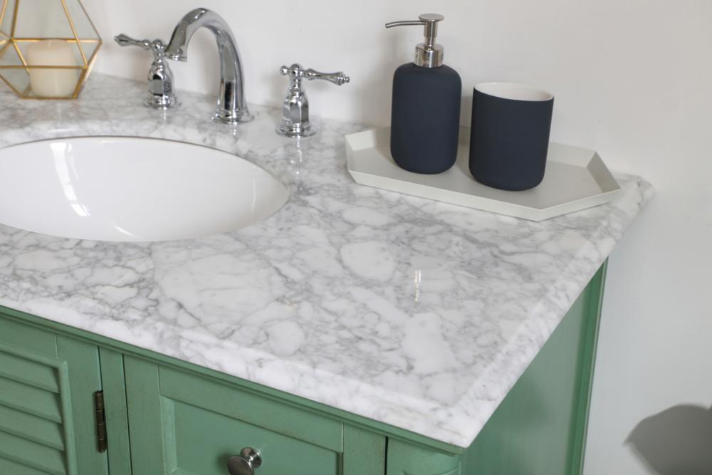 Distressed vintage mint finish with a luxurious carrara white marble countertop