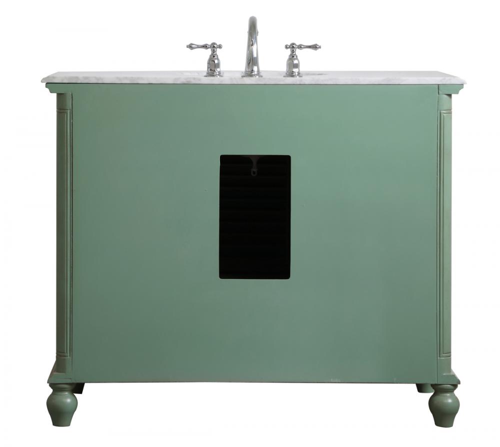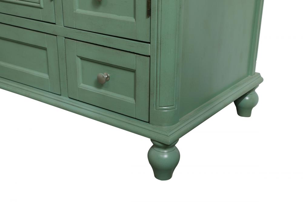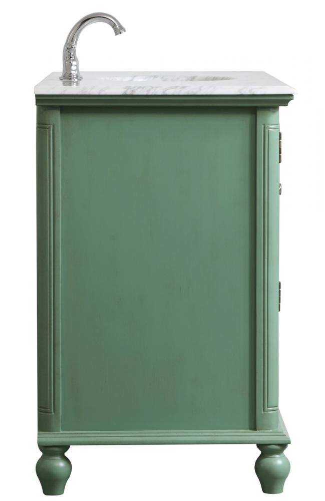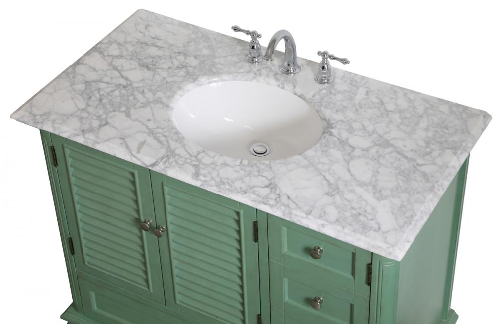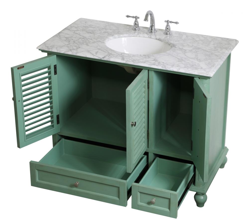 Never compromise beauty--the Rhodes collection stunning vanity in a vintage mint finish will add a lovely splash of color and complement any bathroom or powder room, while utilizing its charm and function to provide you with ample storage spaces. Brushed nickel knobs gently adorn the two drawers at the base, the two shuttered cabinet doors, and the delightful surprising "hidden" cabinet door. Disguised as three drawers, the third cabinet door opens to reveal a space within. These storage areas allows for you to store away your bathroom essentials. The Carrara white marble countertop, porcelain undermount sink, dignified subtle engravings on the side edges, and rounded legs all come together to create contemporary beauty. Work with your space, and design a beautiful room, no matter the size.