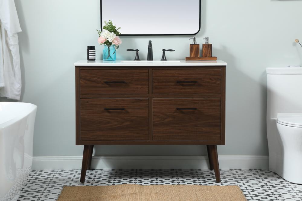 This bathroom vanity is a perfect way to outfit your home in authetic midcentury modern style. The clean lines anchors the design, while the oblique tapered cylinder legs add subtle interest. A black handle adorns the top drawer hiding the base of the undermount porcelain sink while another one allows you to pull the bottom drawer out, letting you store your bathroom necessities and toiletries. The storage drawers provide much needed function and can be used for stowing items like extra toothbrushes, hairbrushes, and other bathroom essentials to help you get ready to face the day. This vanity is a quick update for your bathroom with trendy style.