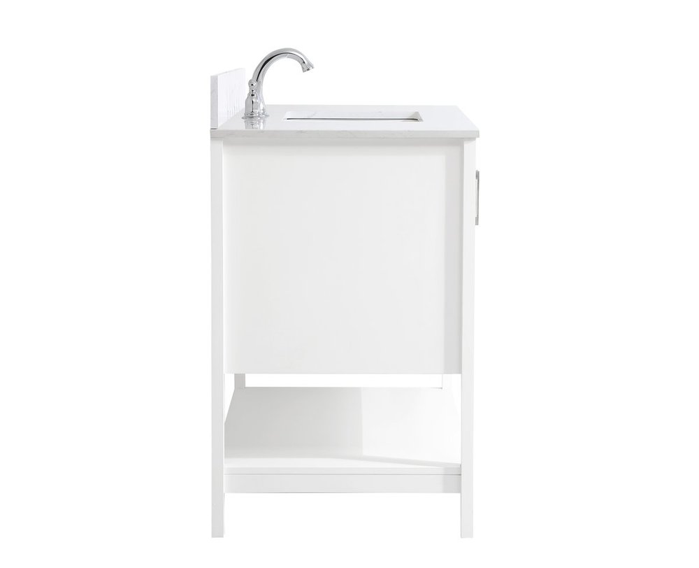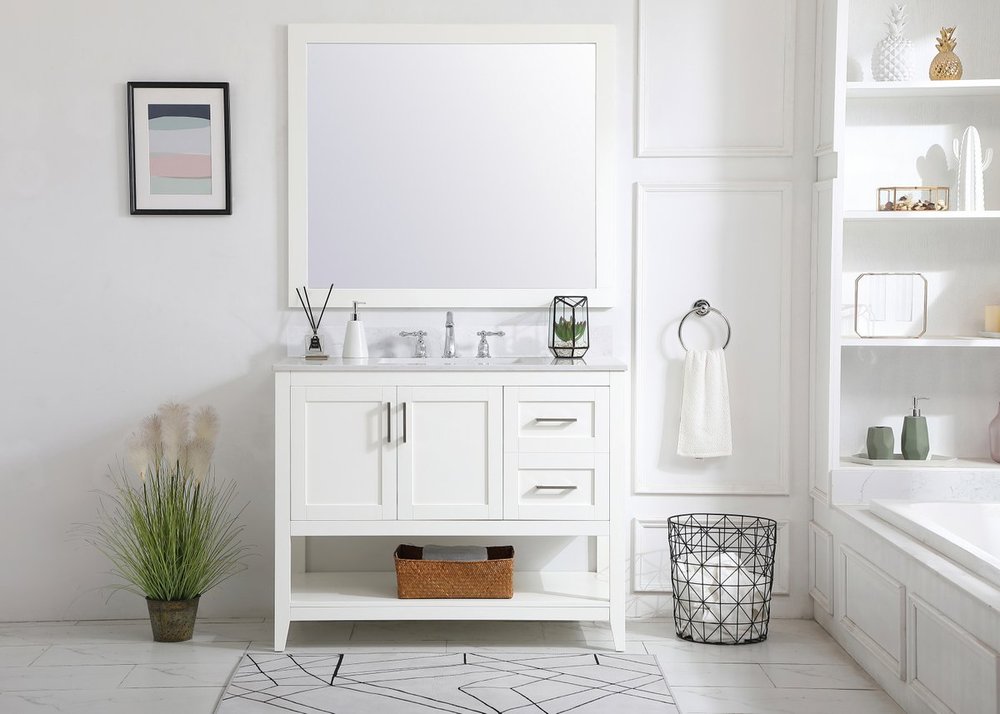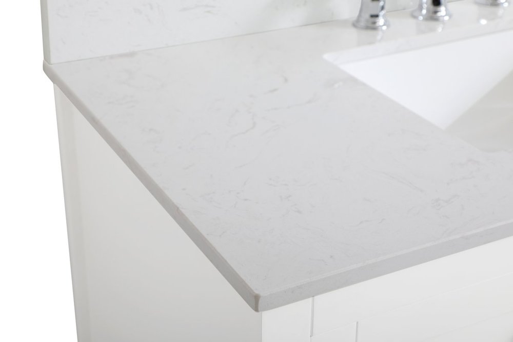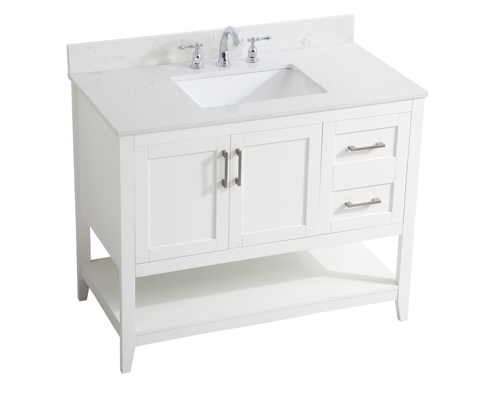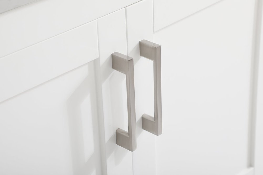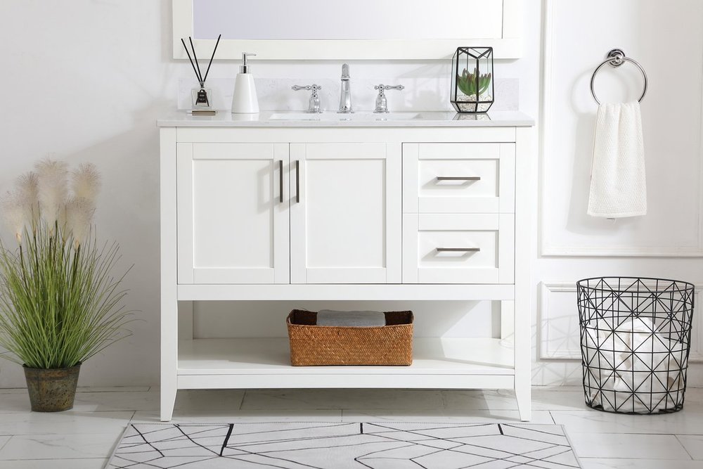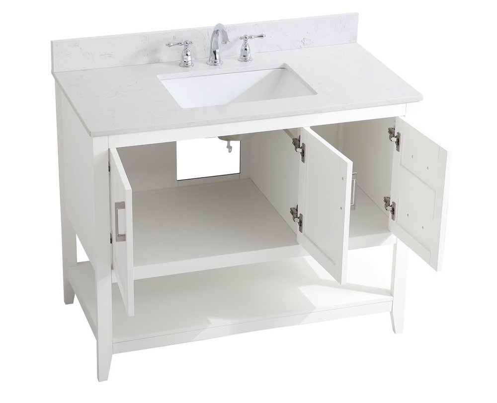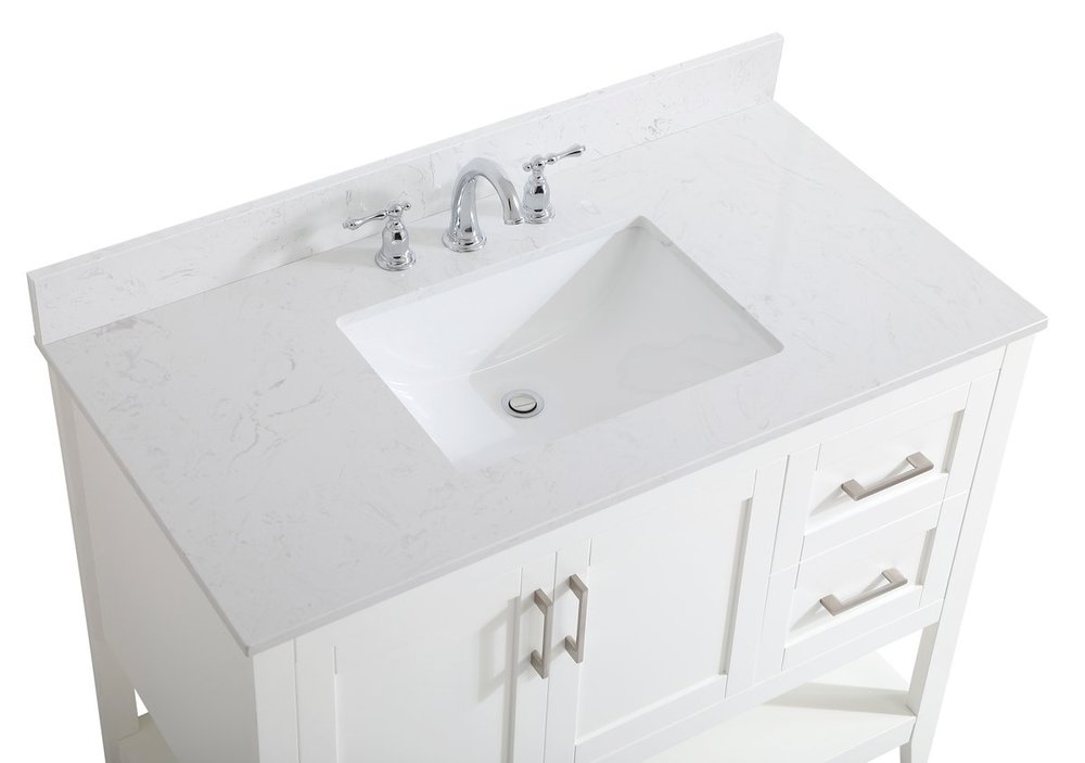The nonchalant attitude of this 42" traditional white finish vanity will have you wanting more. The slender brushed nickel handle bars open the 3 cabinet doors to reveal ample storage space to put away and store bathroom essentials, and the open space below allows for you to place clean towels on the rack. Topped with a Calacatta engineered marble countertop, you and your guests will enjoy this easy going vanity. Comes with a matching backsplash to complete the look and protects your wall.