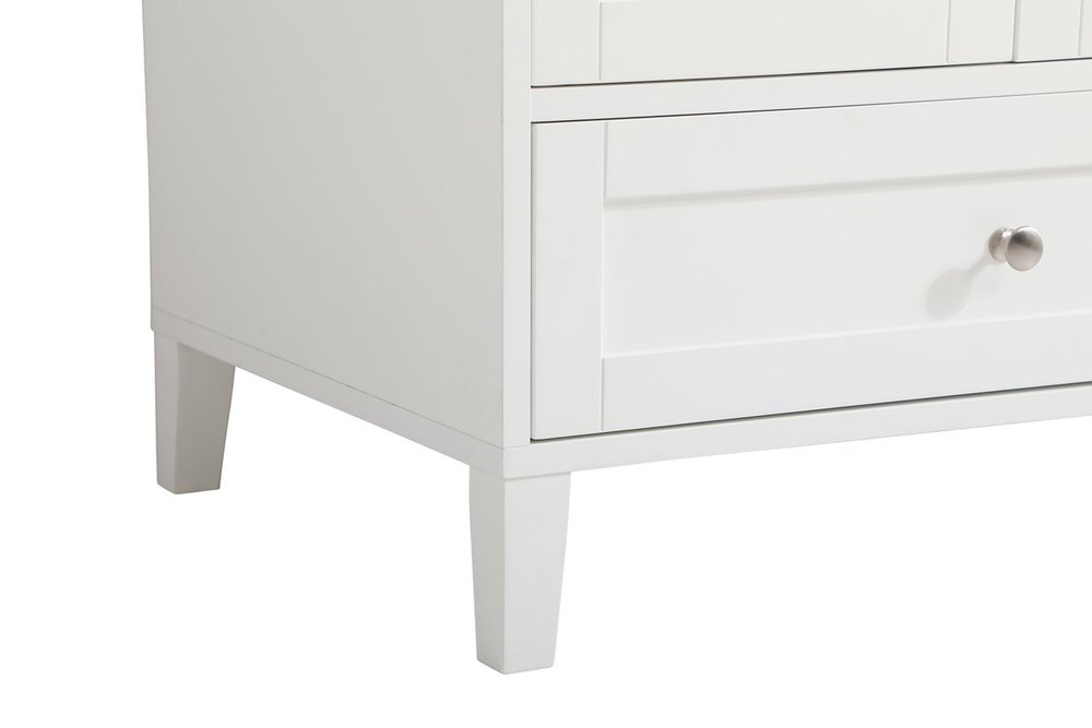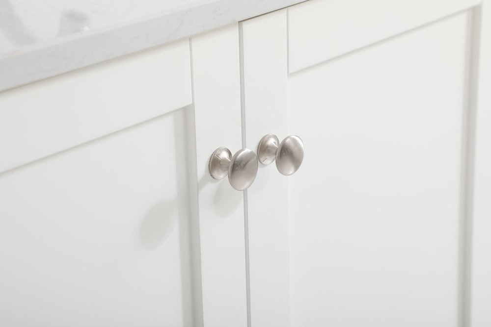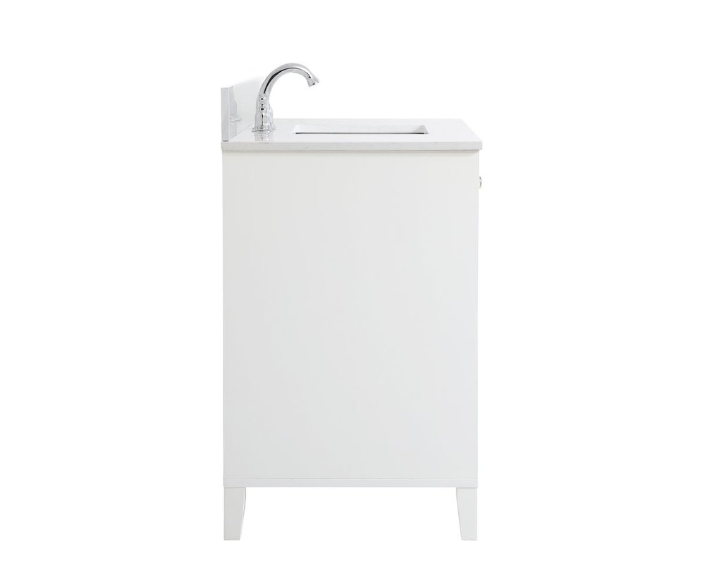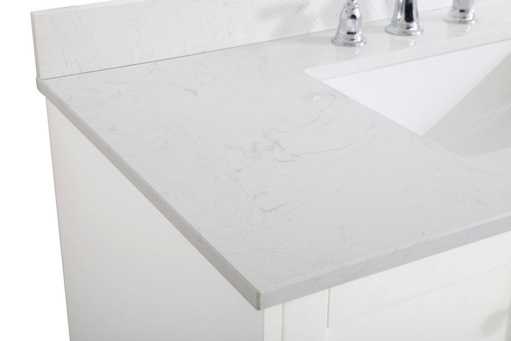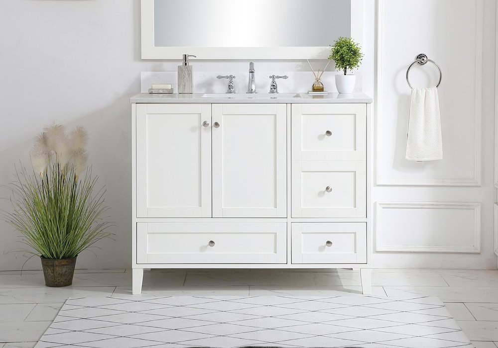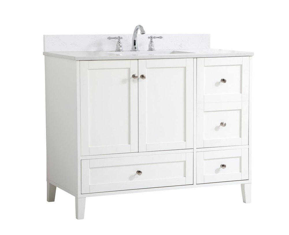 While unassuming, this 42" vanity in a white finish sure knows how to redefine luxury. The sleek brushed nickel knobs adorn the double cabinet doors and 3 drawers which allow you to store your bathroom toiletries and necessities. Standing strong on oblique legs and dressed with a Calacatta engineered marble countertop, this vanity will surely create beauty and casual elegance in your bathroom or powder room. Comes with a matching backsplash to complete the look and protects your wall.