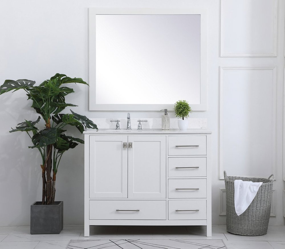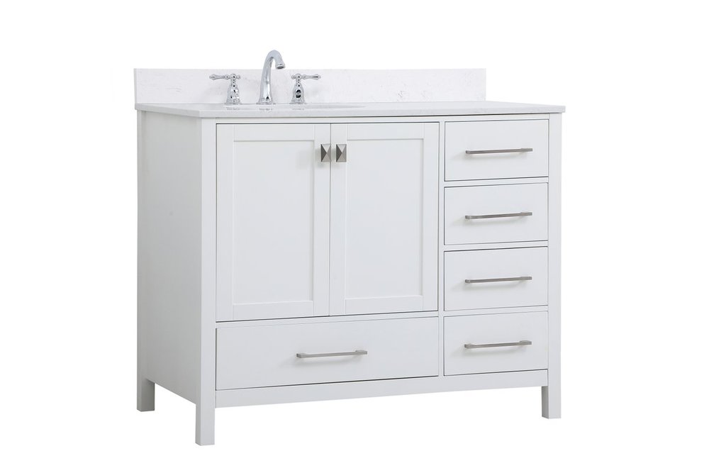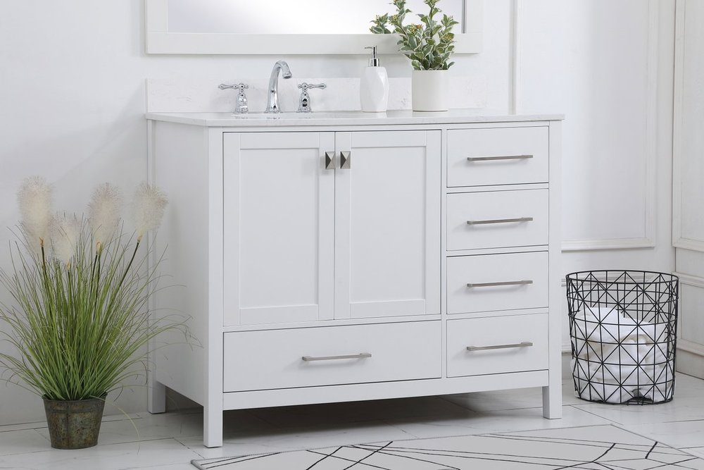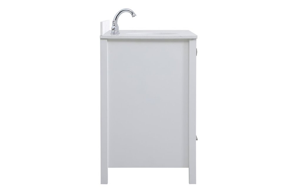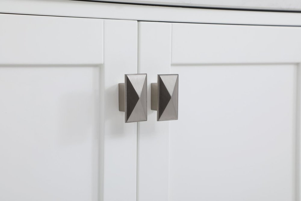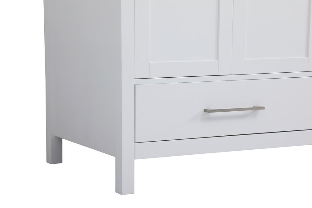 Never compromise beauty--the Irene collection stunning vanity in a white finish will add lovely sophistication and complement any bathroom or powder room, while utilizing its charm and function to provide you with ample storage spaces. Brushed nickel pulls gently adorn the minimalist cabinet doors and drawers at the base, allowing for you to store away your bathroom essentials. The calacatta engineered marble countertop, porcelain undermount sink, dignified subtle engravings on the side edges, and squared legs all come together to create contemporary beauty. Work with your space, and design a beautiful room, no matter the size. Comes with a matching backsplash to complete the look and protects your wall.
