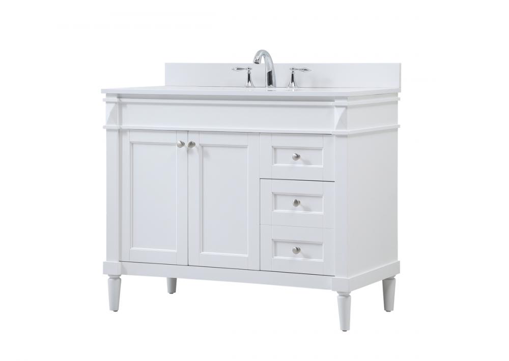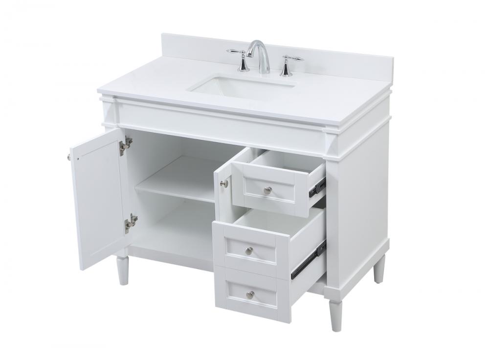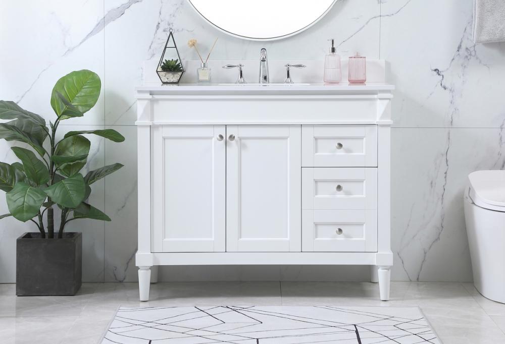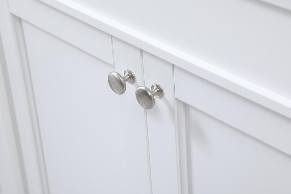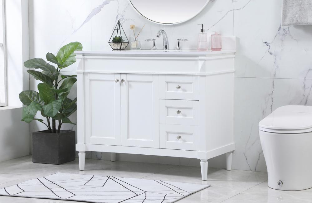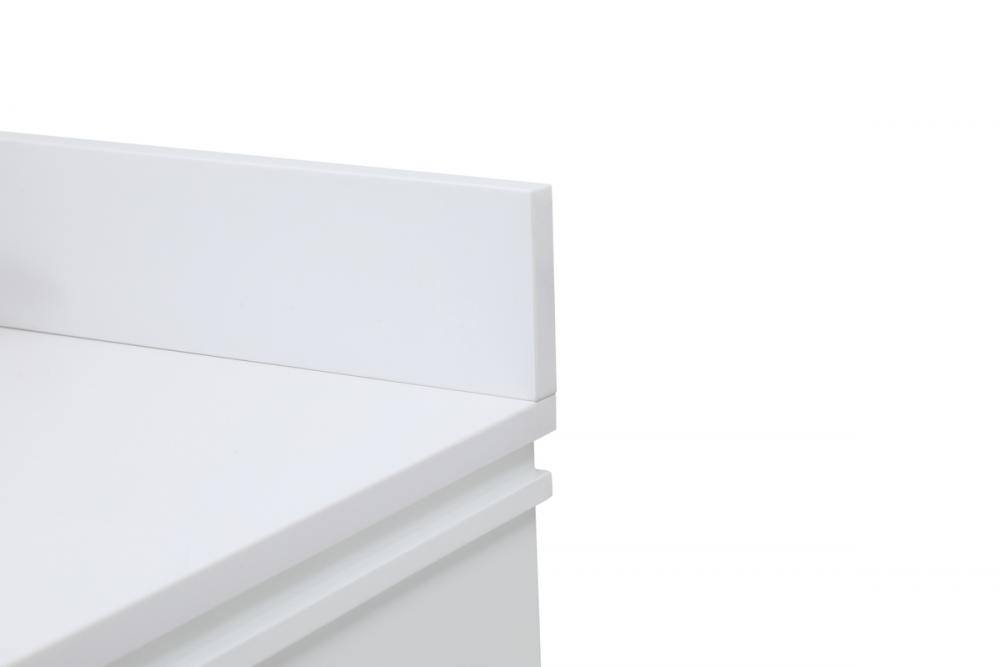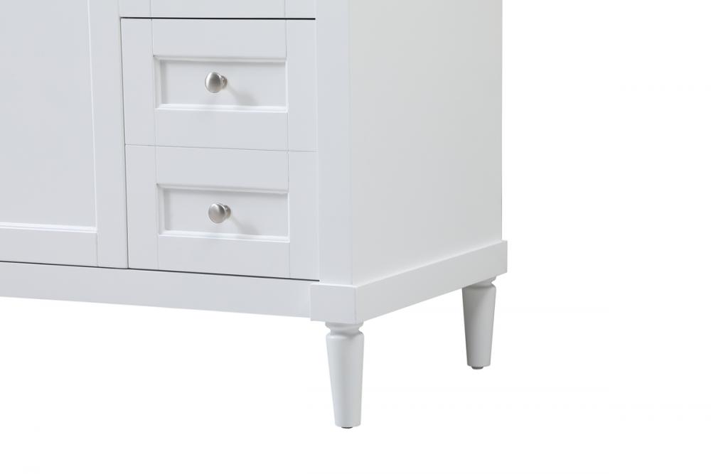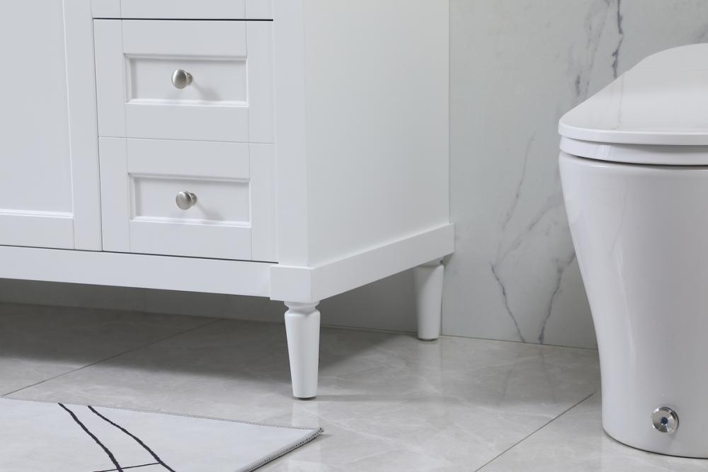 This transitional vanity is a beautiful piece of bathroom furniture will look amazing in your design scheme. The cabinet features a shaker style smooth door panel with simple round knobs and soft close hinges provide ample room for accessories. Packed with multiple side drawers with soft close glides for added comfort and full access to bath supplies. Convenient deep drawer stores all of your tall bath essentials. Constructed of engineered wood and solid wood legs with hand painted finish. The durable engineered marble countertop is a versatile material in an ivory white finish. Minor assembly of the legs needed to get this vanity up and running. Comes with a matching backsplash to complete the look and protects your wall.