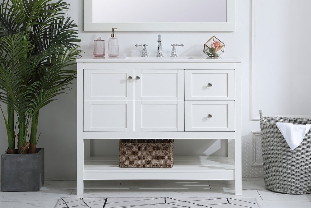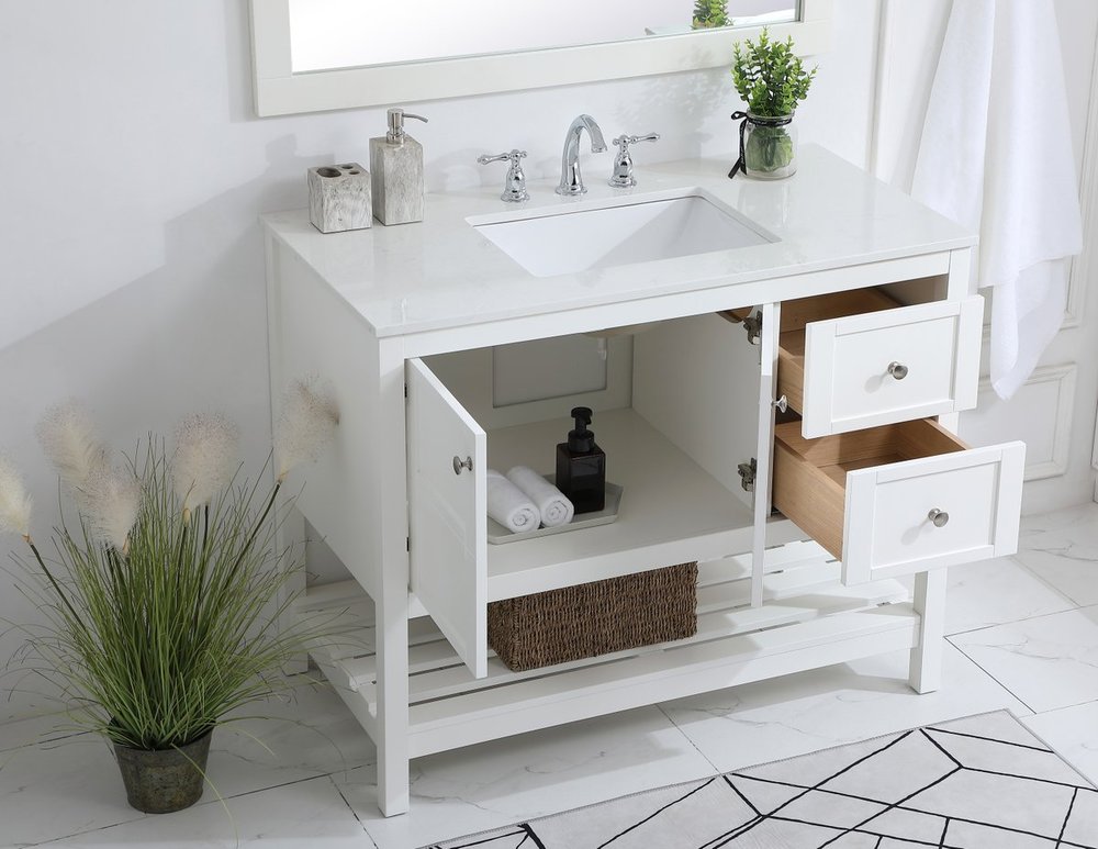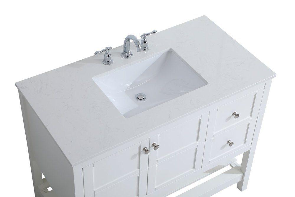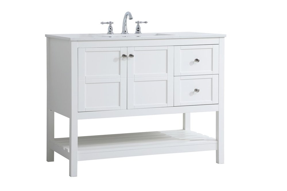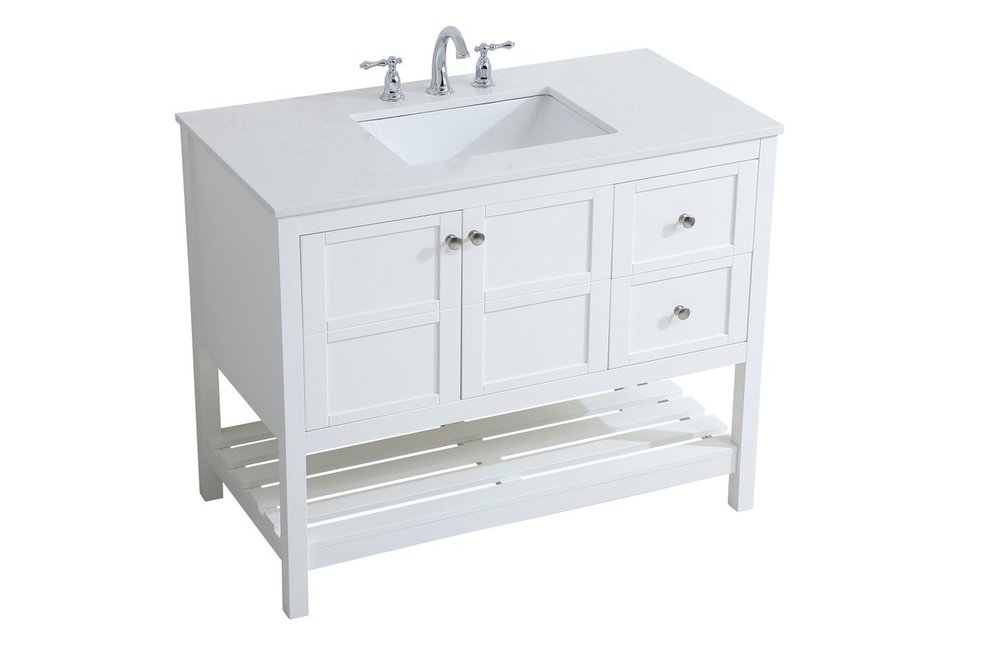 The subtle beauty of the Theo collection 42" vanity in a white finish exudes comfortable luxury. Its modern, yet traditional beauty will surely dress up your bathroom or powder room without any fuss. The white stone countertop and porcelain undermount sink shows quiet opulence, and the legs support upright without fail. Brushed Nickel hardware complements the trendy white finish, with pulls adorning the two cabinet doors and two drawers, showcasing ample storage space within. Slated shelf allows for additional space to organize your towels. Whether this vanity is in your bathroom or for guests, its presence will surely elevate the aesthetics of your room.