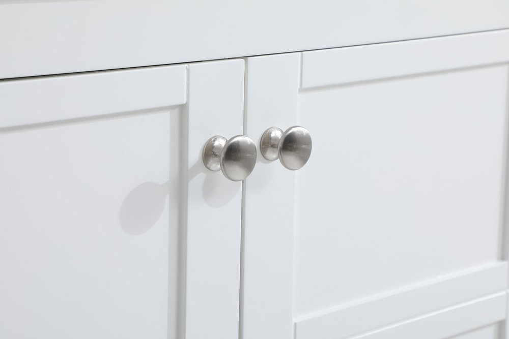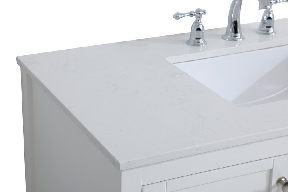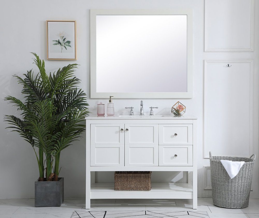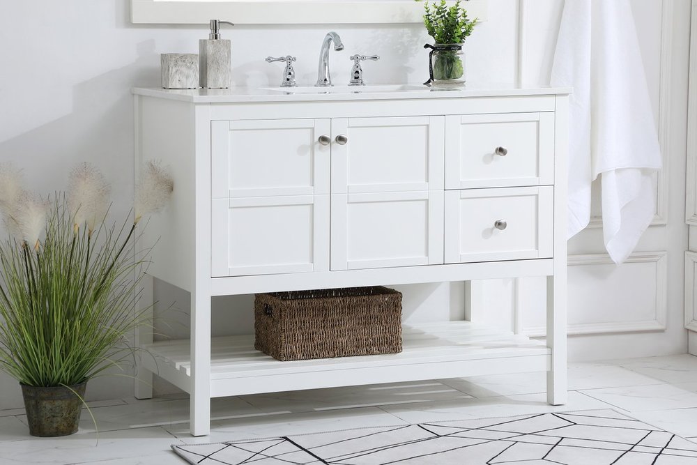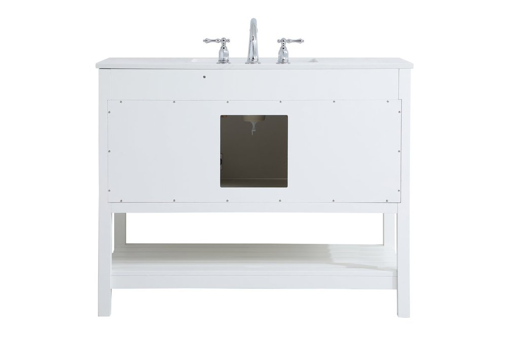The subtle beauty of the Theo collection 42" vanity in a white finish exudes comfortable luxury. Its modern, yet traditional beauty will surely dress up your bathroom or powder room without any fuss. The white stone countertop and porcelain undermount sink shows quiet opulence, and the legs support upright without fail. Brushed Nickel hardware complements the trendy white finish, with pulls adorning the two cabinet doors and two drawers, showcasing ample storage space within. Slated shelf allows for additional space to organize your towels. Whether this vanity is in your bathroom or for guests, its presence will surely elevate the aesthetics of your room.