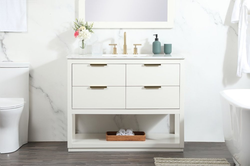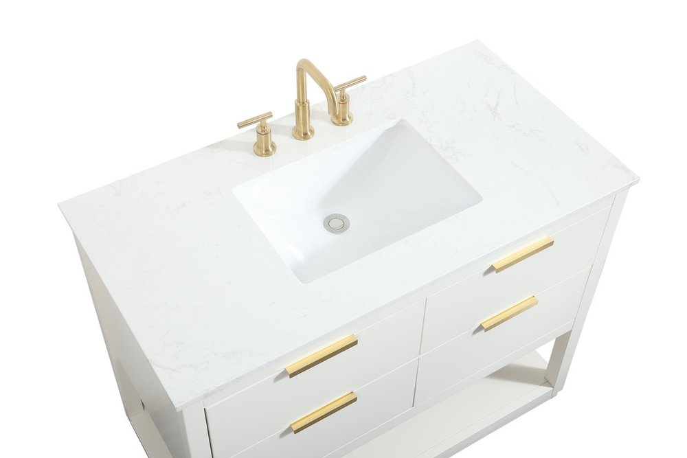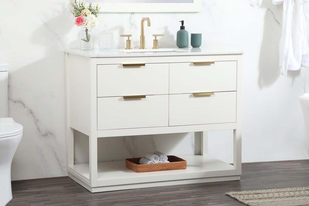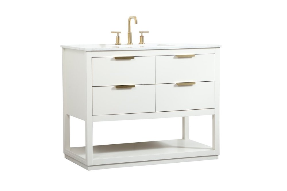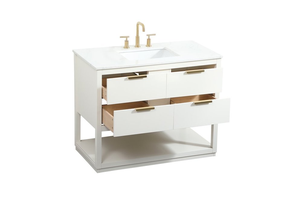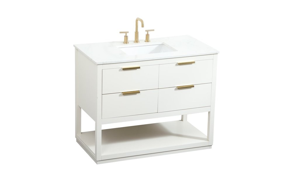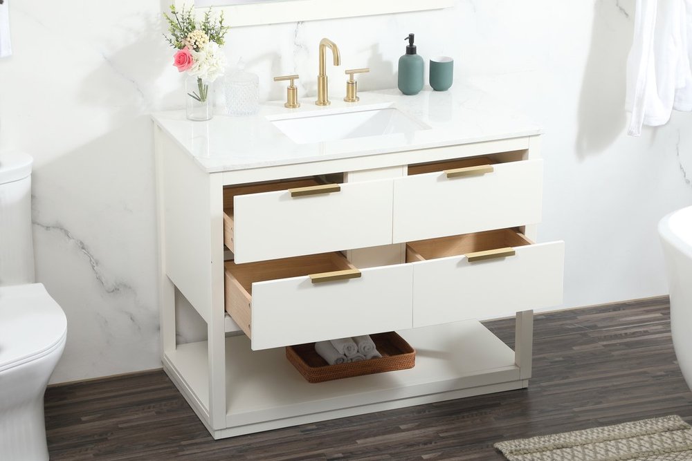 Live in modern comfort with this 42" white finish vanity. Dressed in a white and sleek gold metal hardware, its contemporary style will have your bathroom or powder room elevated in modern sophistication. The open shelf at the base and four drawers reveal ample storage space for your bathroom essentials and miscellany. Clean lines create its own visual interest, adding trendy looks to your already chic room.